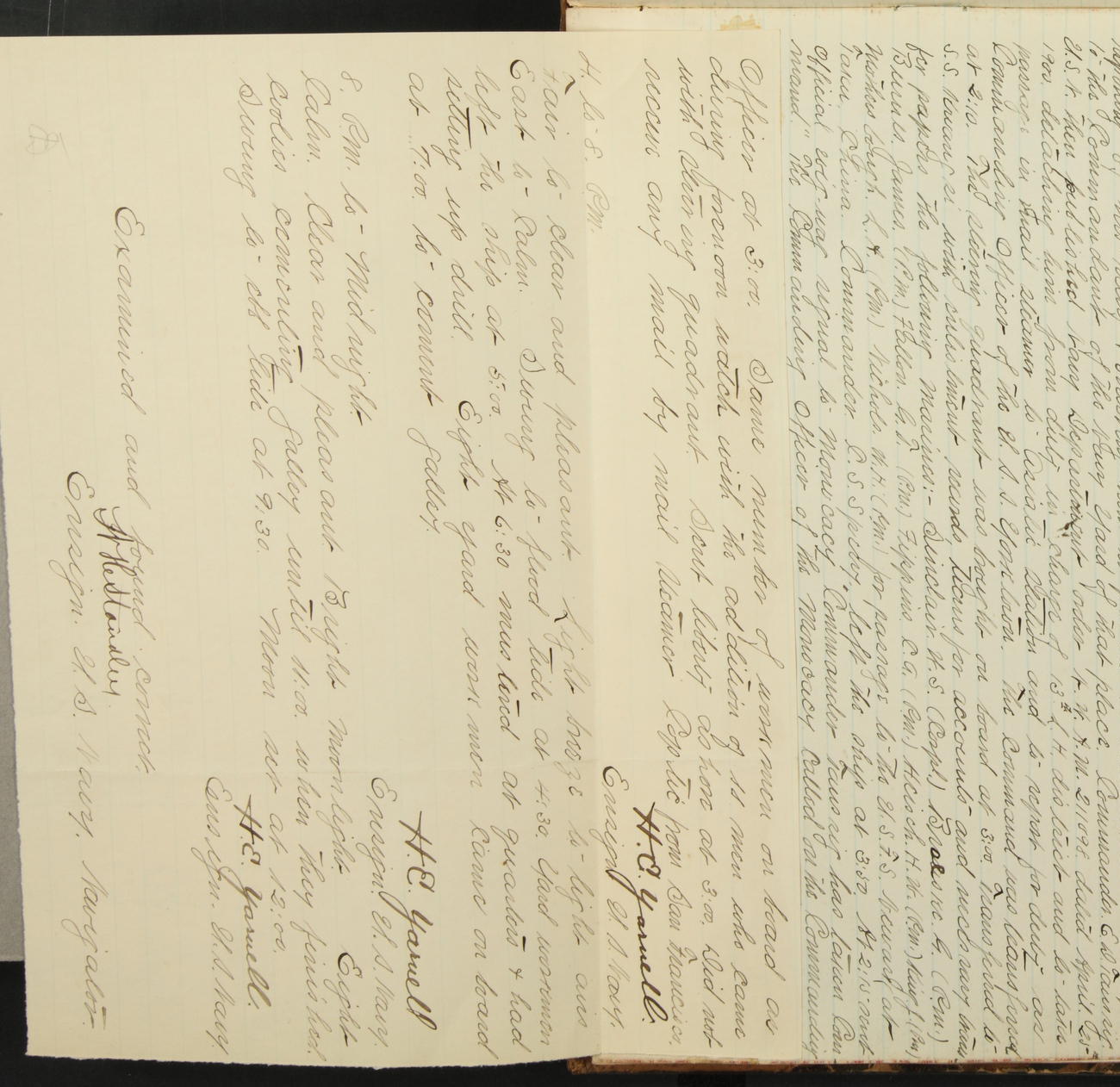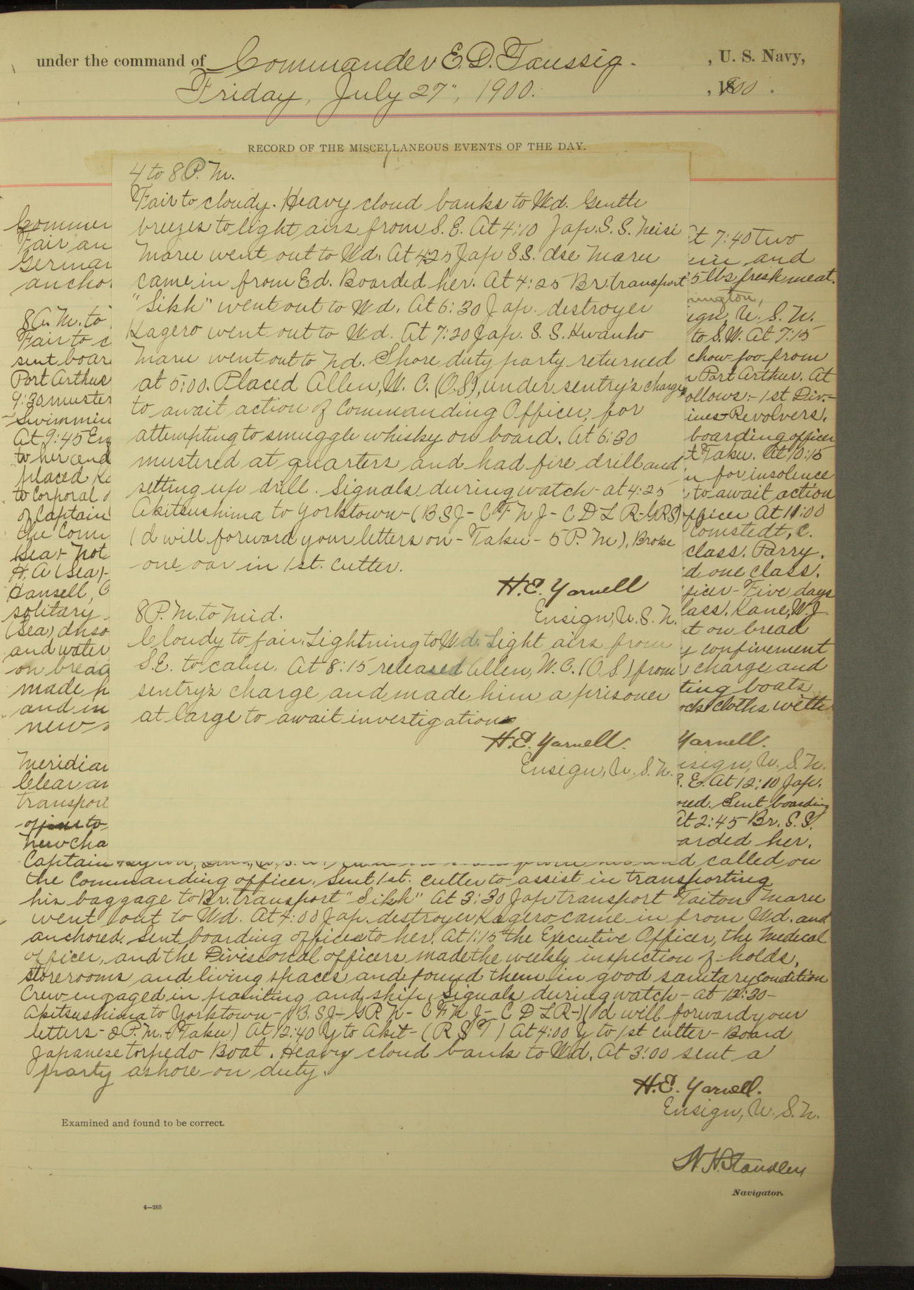 At 10 o'clock H. Milan, Machinist First-class, returned on board 3 hours over time and drunk.