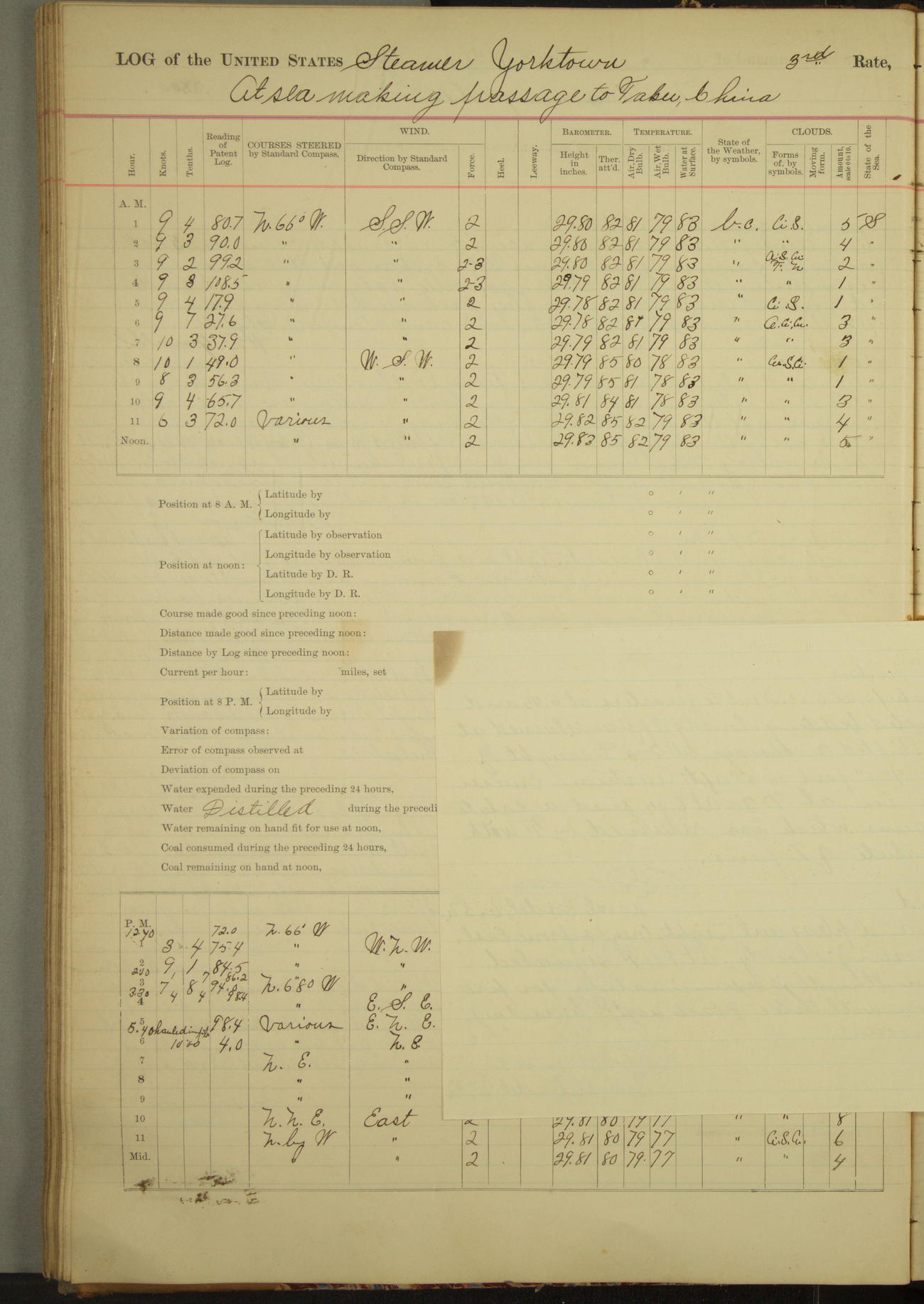 At 8.45am changed course to N4°E (per standard compass), patent log [reading] 10.2.