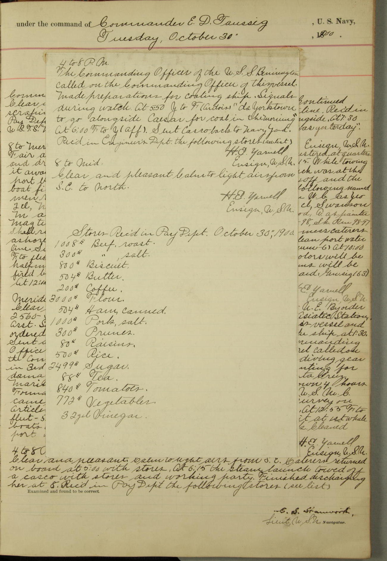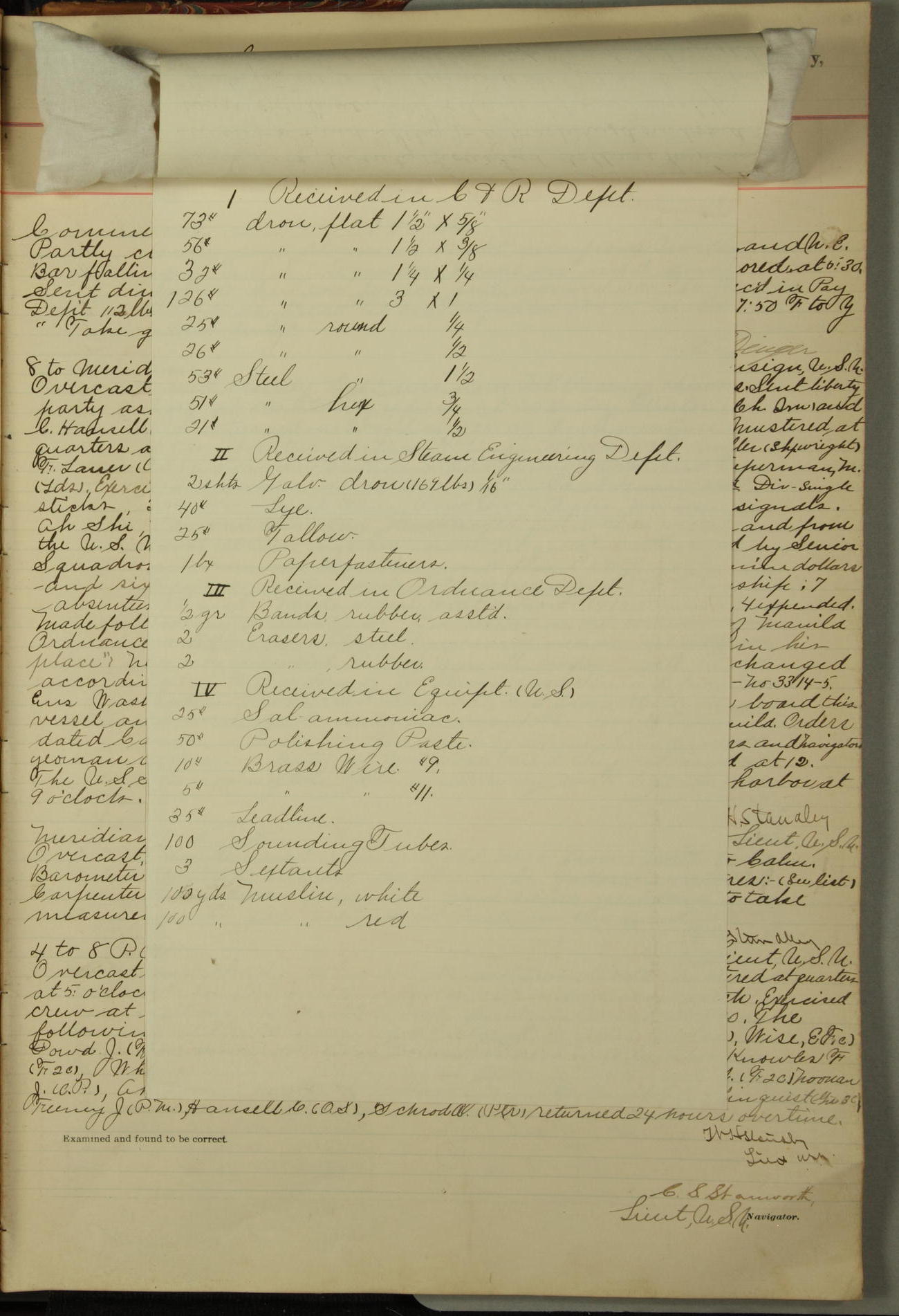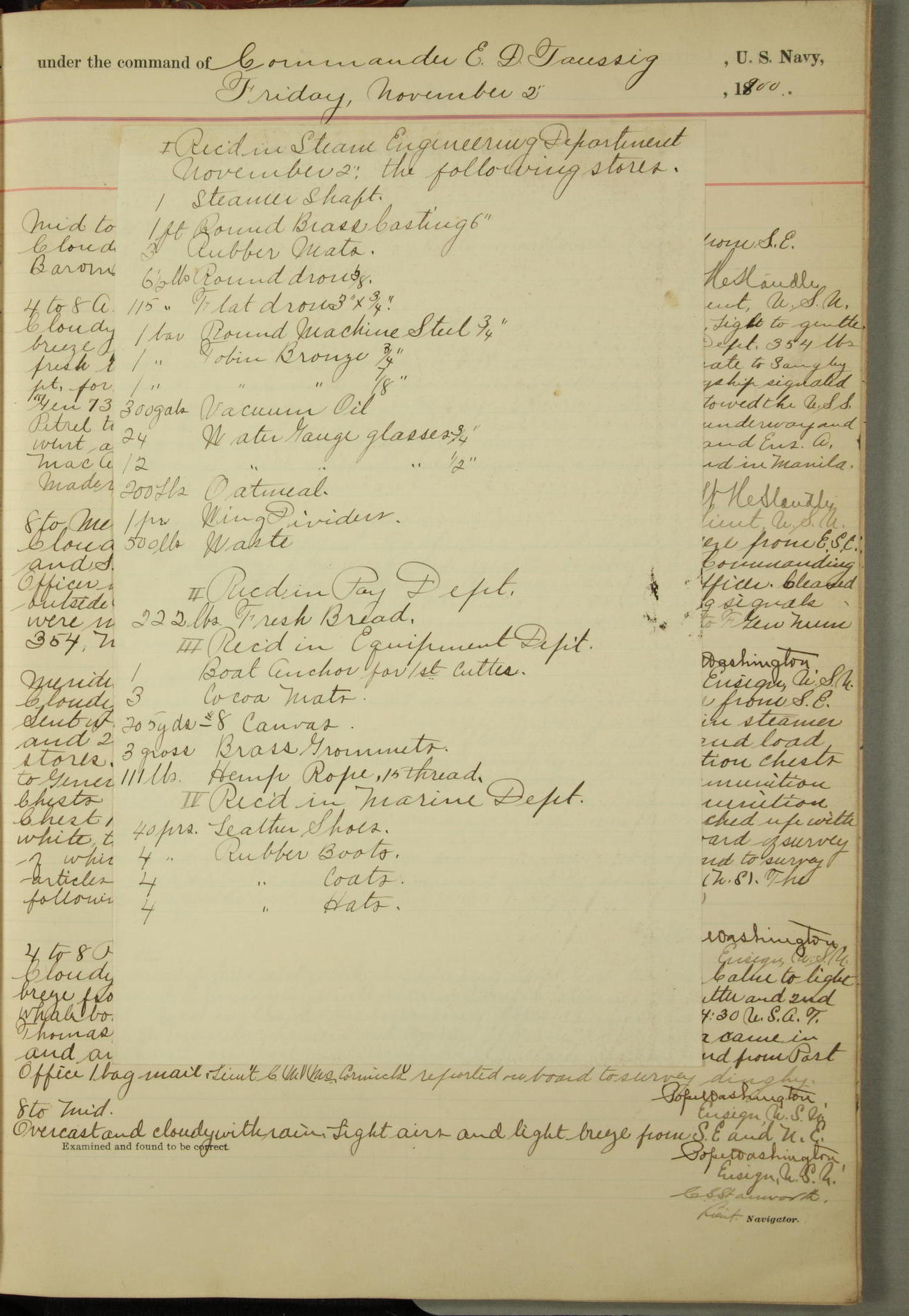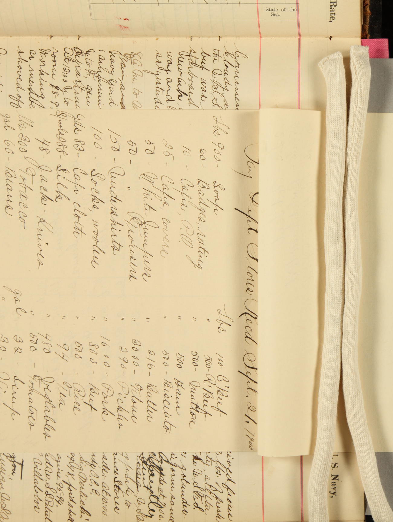 Received on board in Paymaster's Department: 136¼ pounds fresh beef; 136¼ pounds vegetables; and 109 pounds bread.