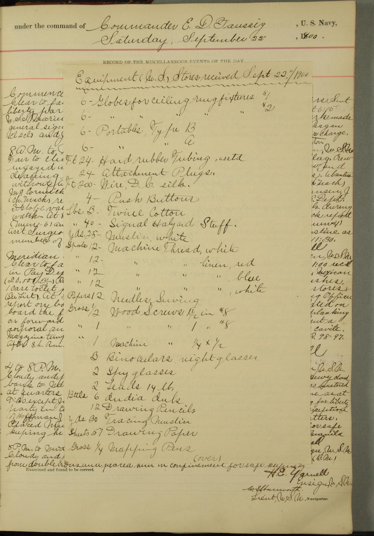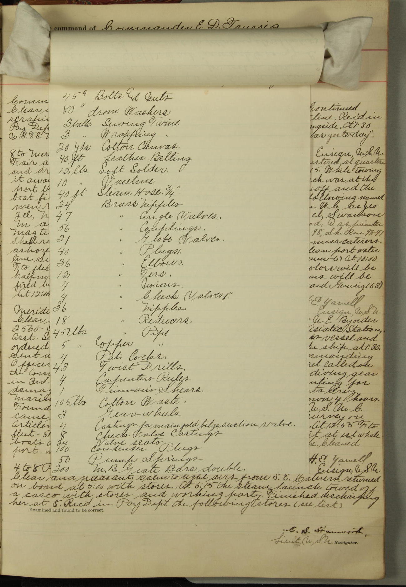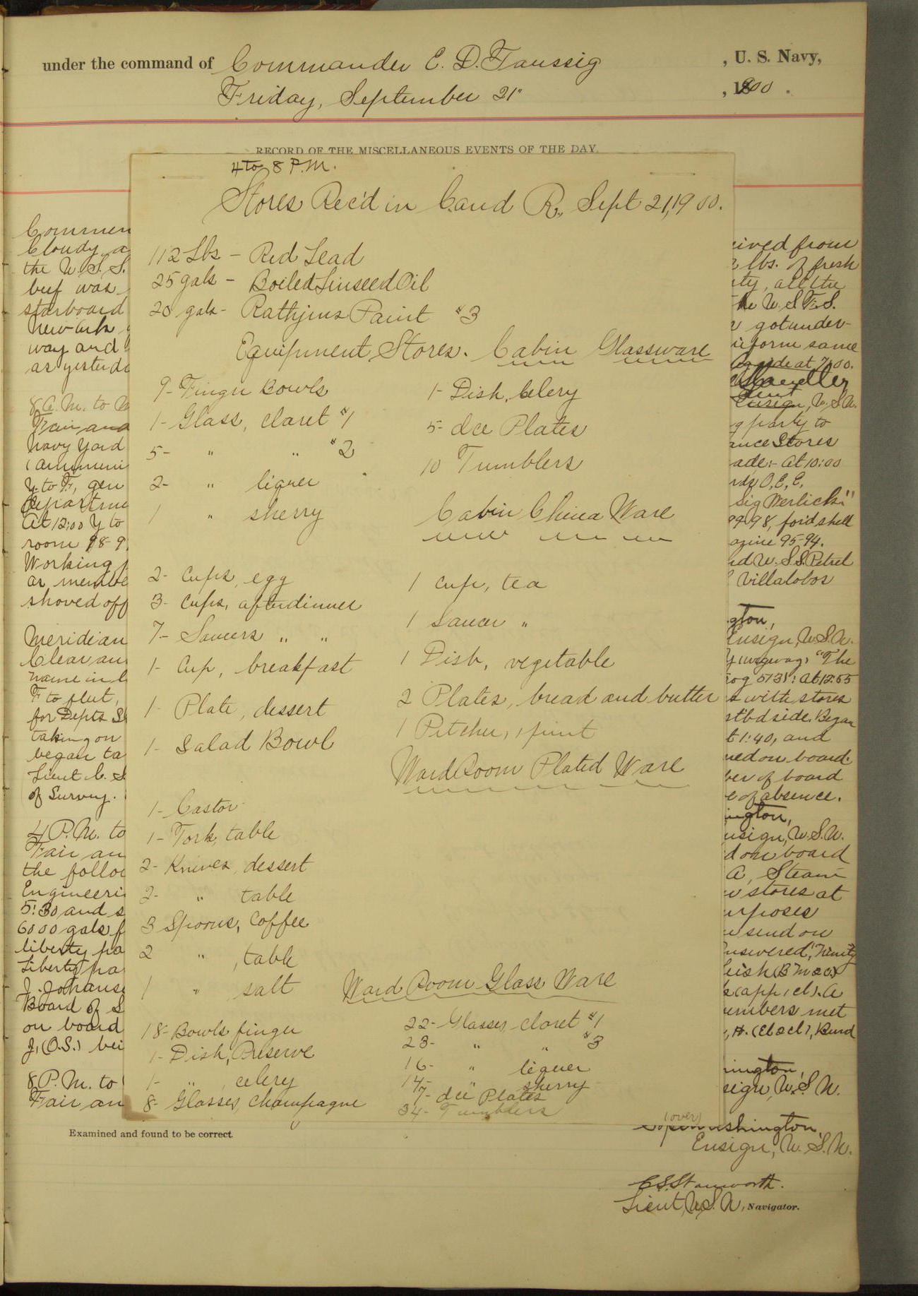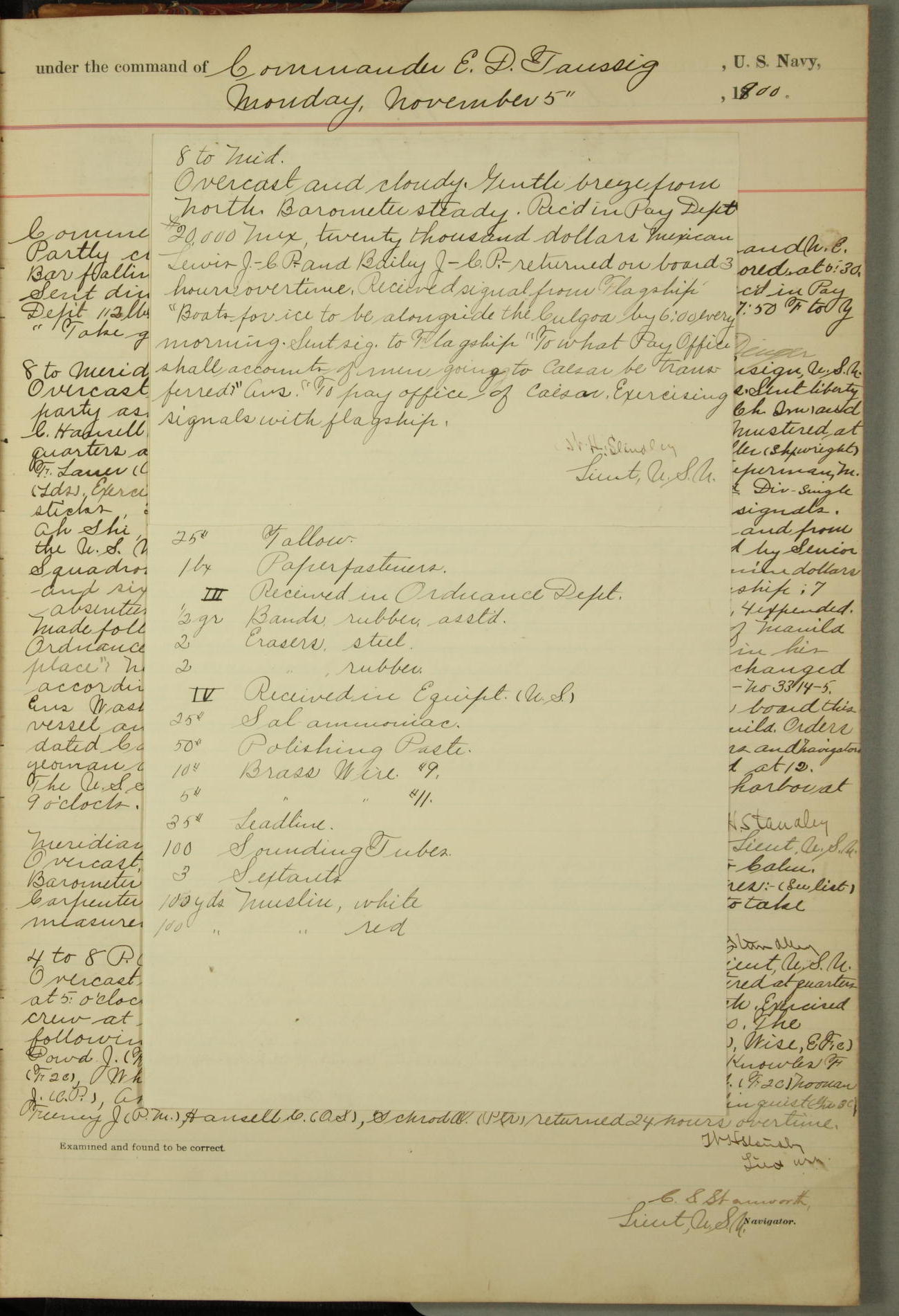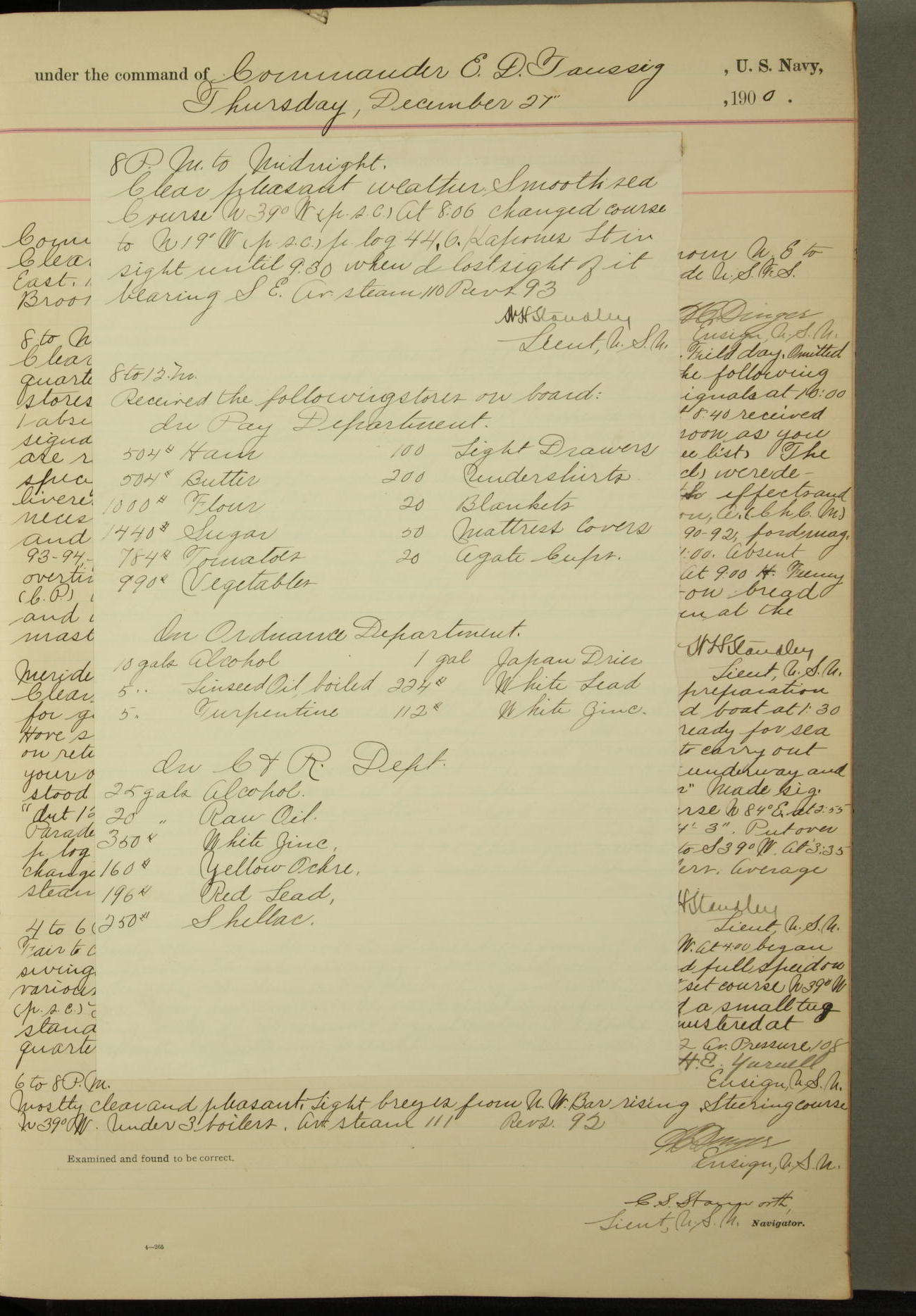Received on board in Paymaster's Department: 136¼ pounds fresh beef; 136¼ pounds vegetables; and 109 pounds bread.