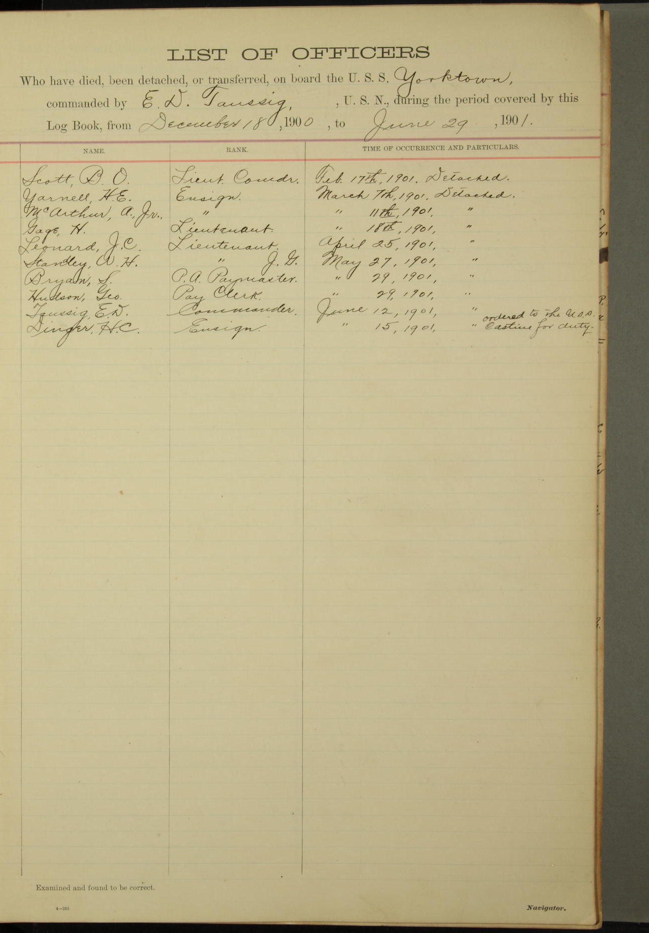 Assistant Engineer J.R. Selfridge detached from duty on board this ship and ordered home.
