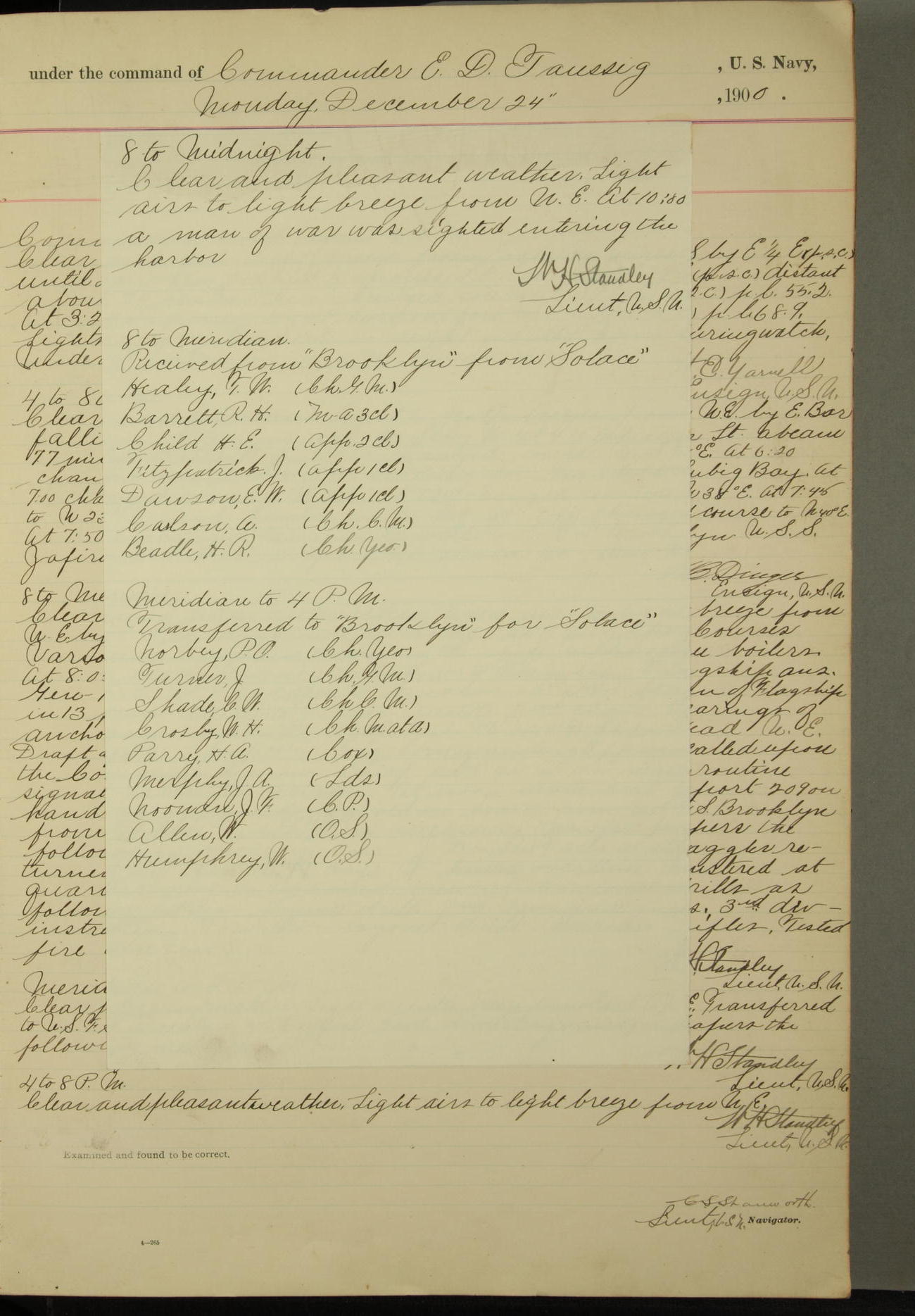J.J. Sheehan, Landsman, returned on board 24 hours over time, and P.N. Anderson, Coal Passer, ½ hour over time.