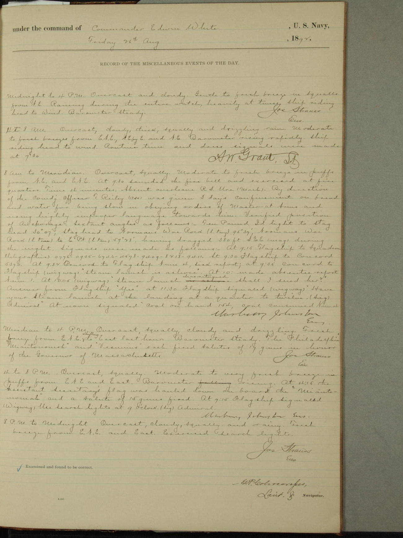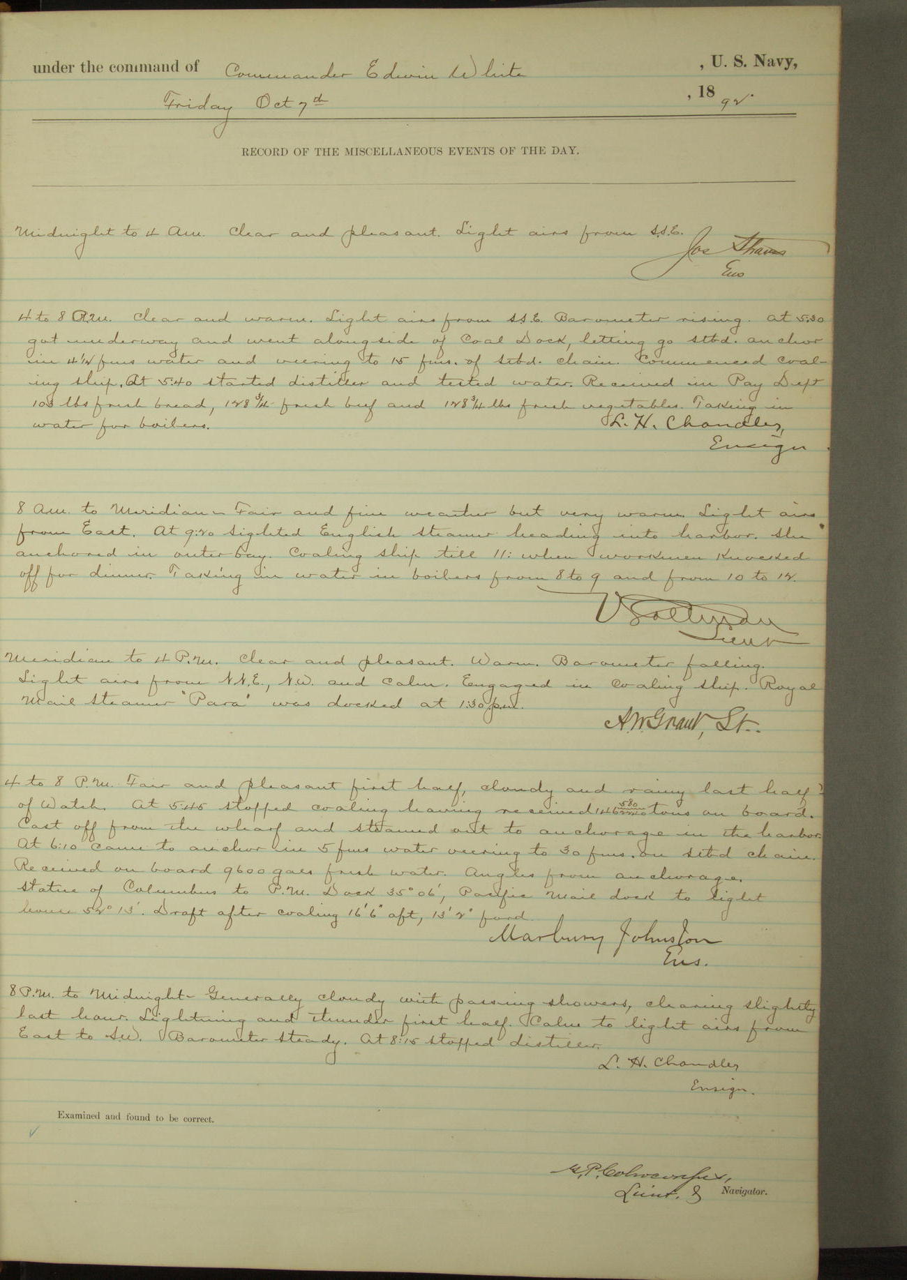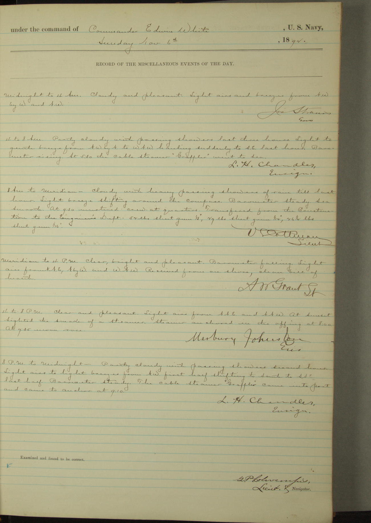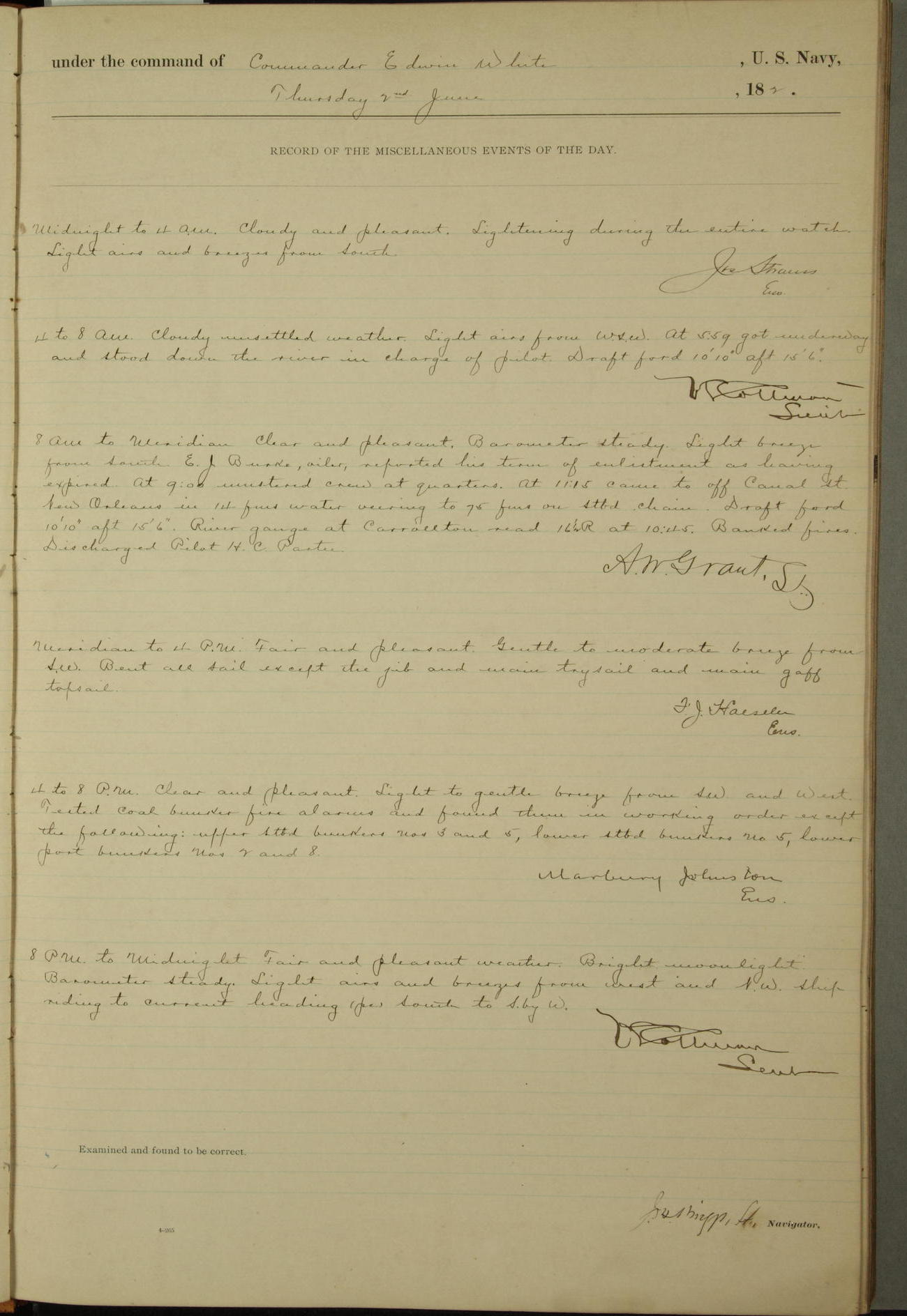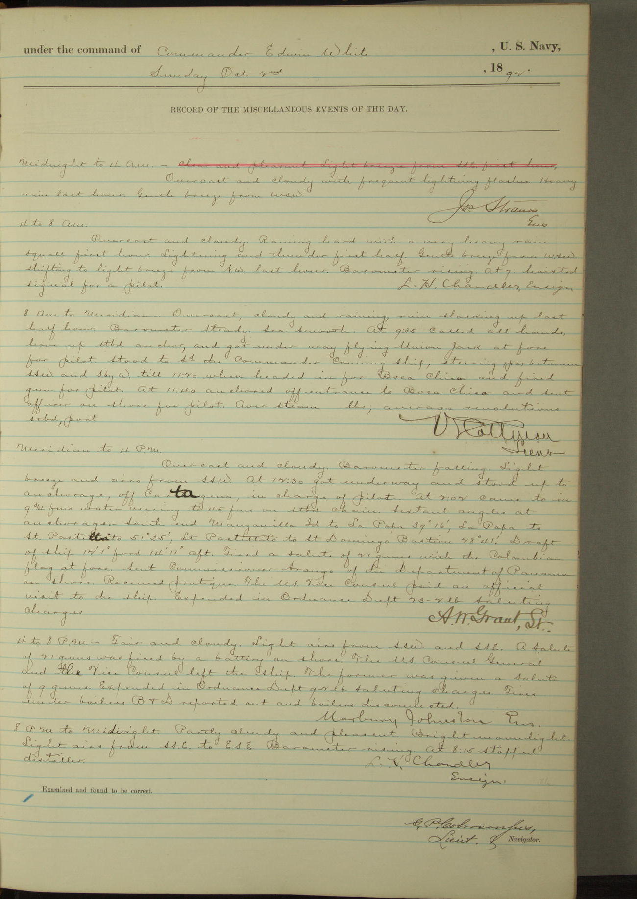 Examined and found to be correct. G. P. Ch????npes, Louit. G. Navigator