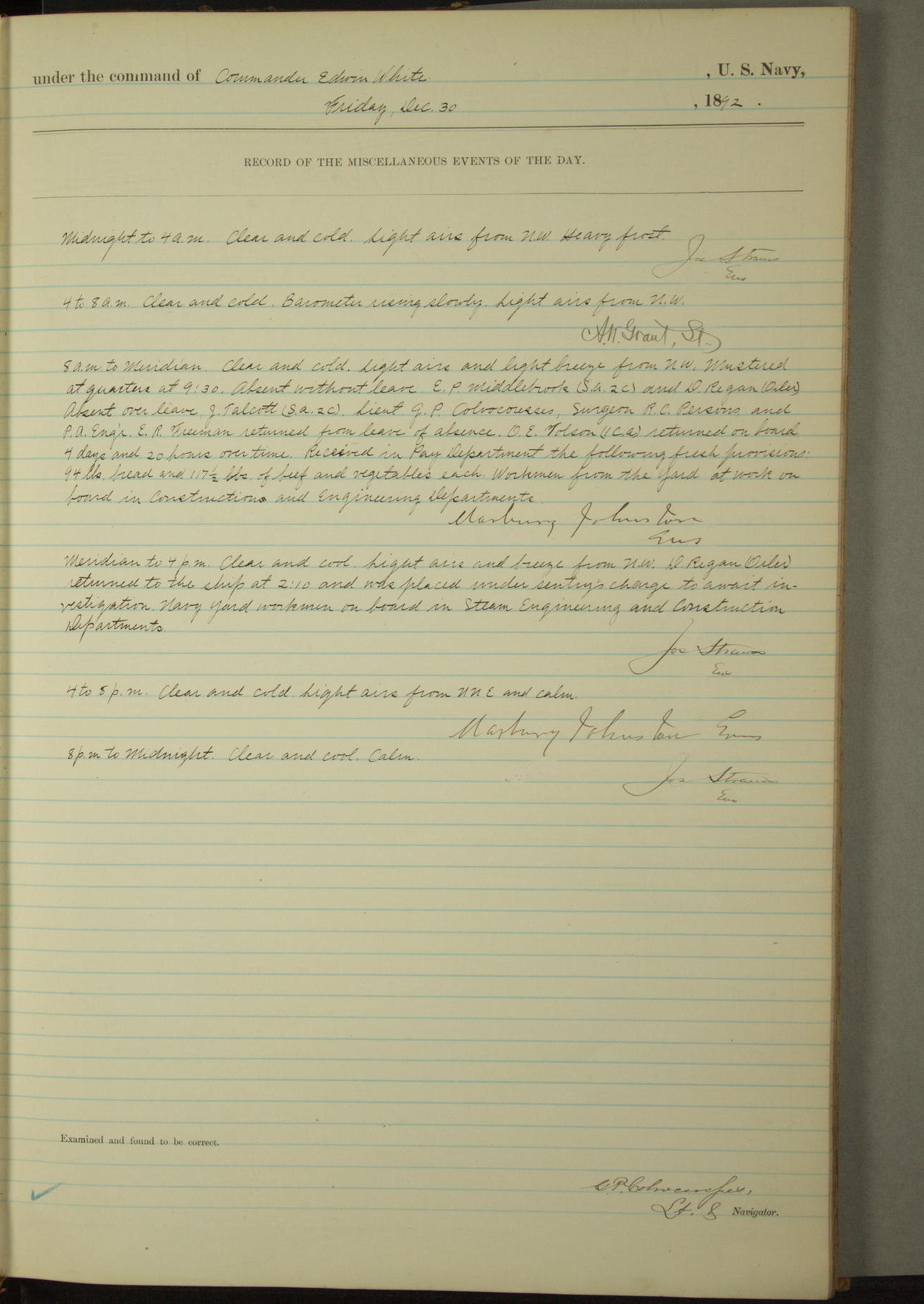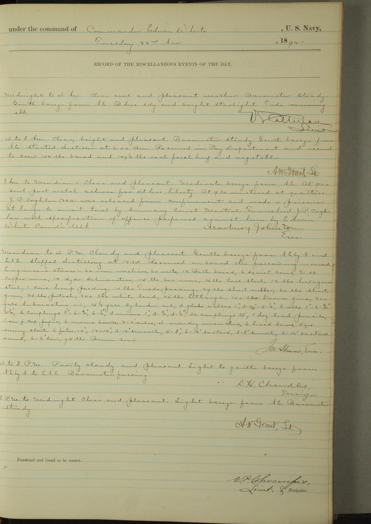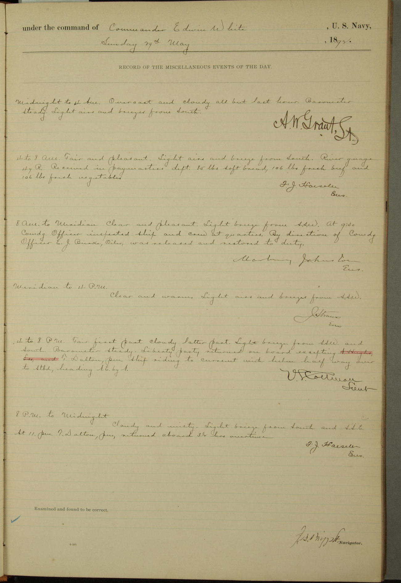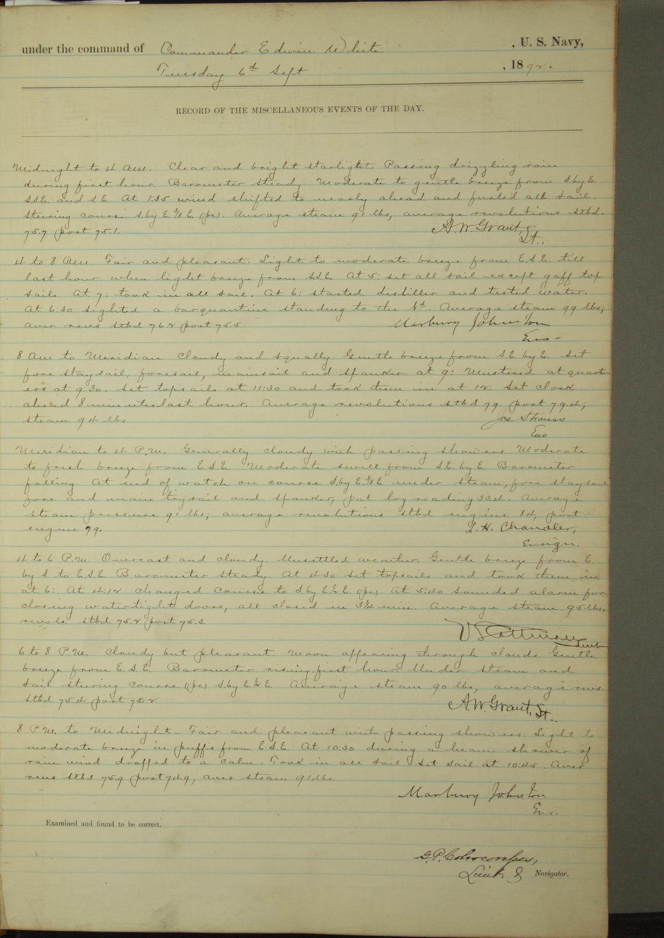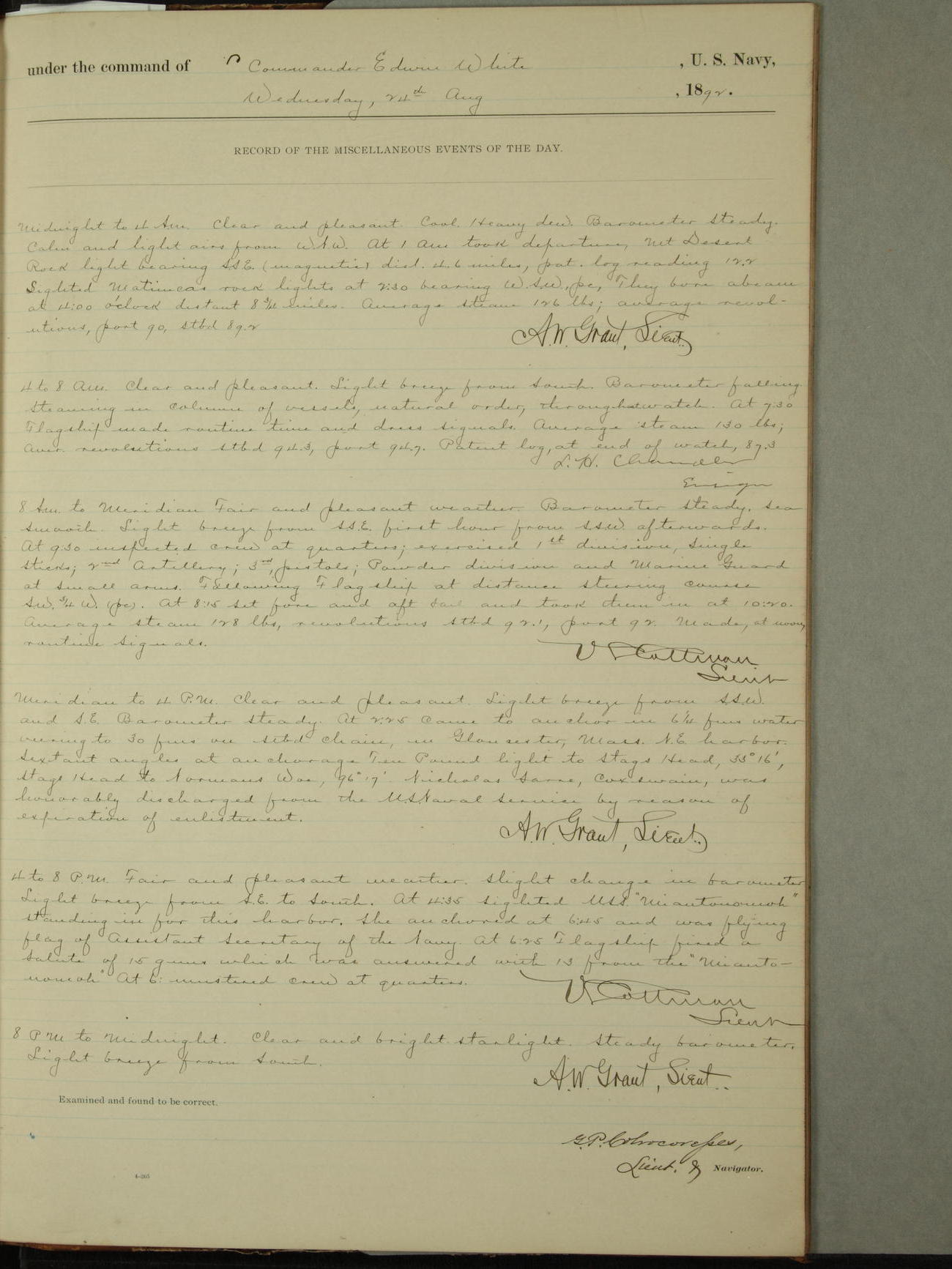 Examined and found to be correct. G. P. Ch????npes, Louit. G. Navigator