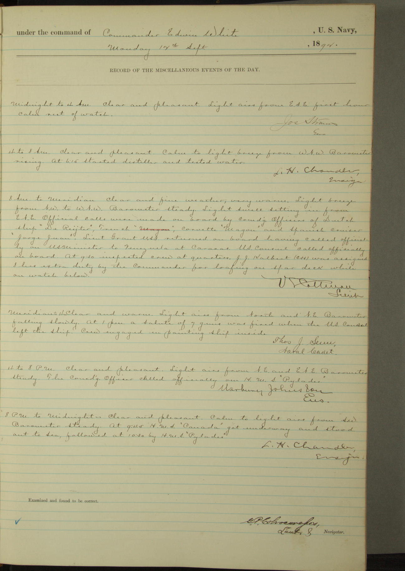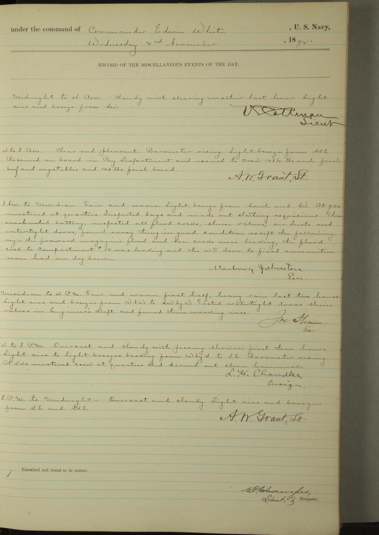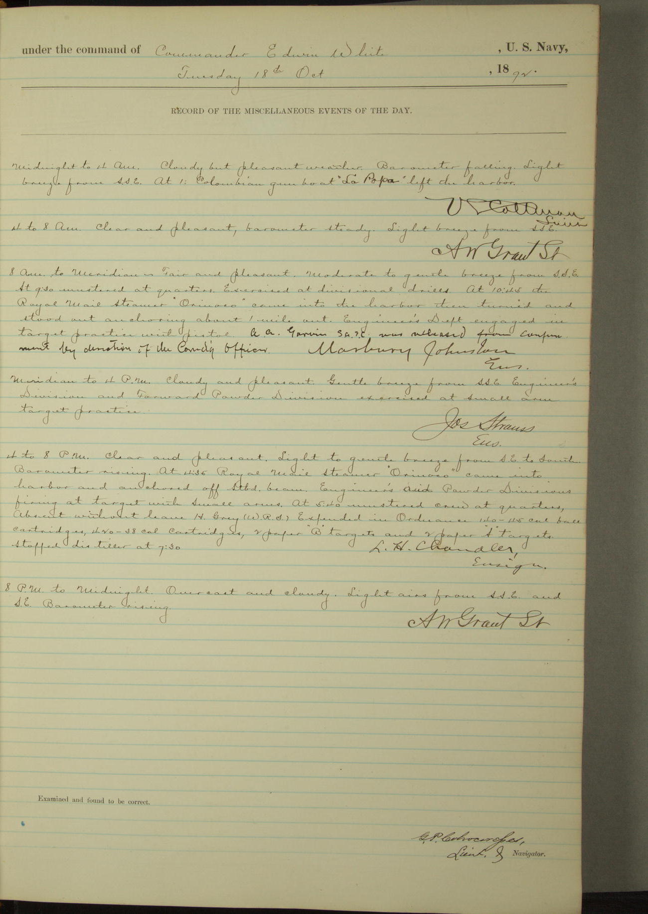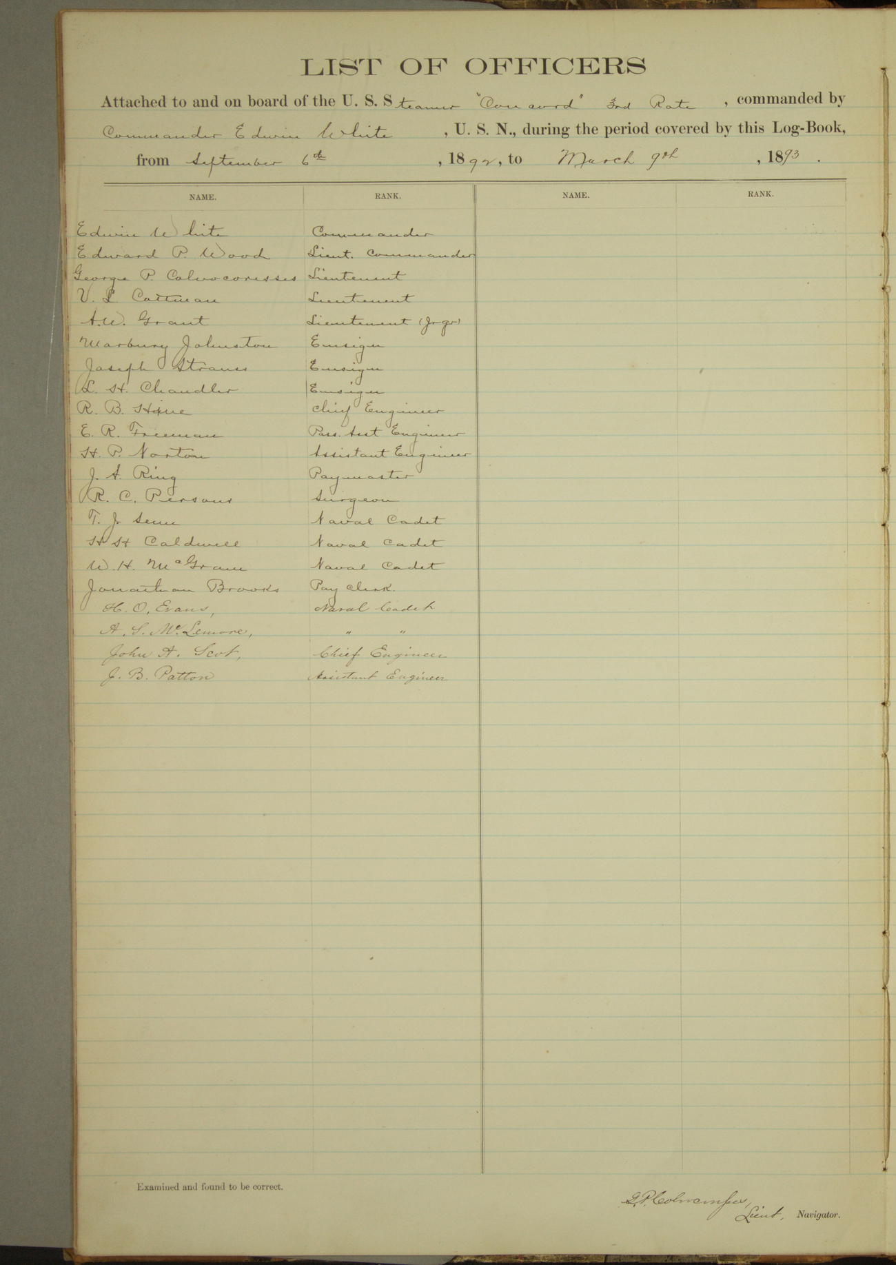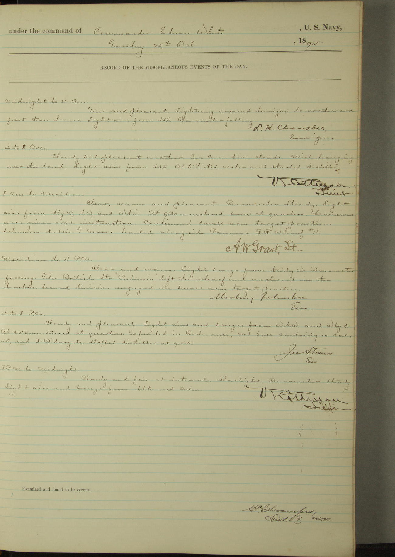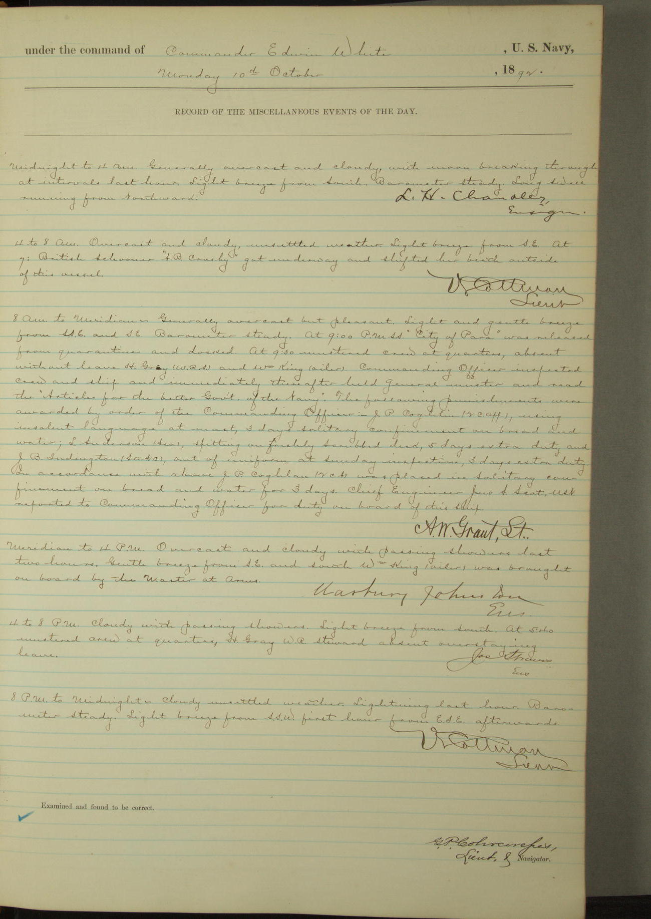 Examined and found to be correct. G. P. Ch????npes, Louit. G. Navigator