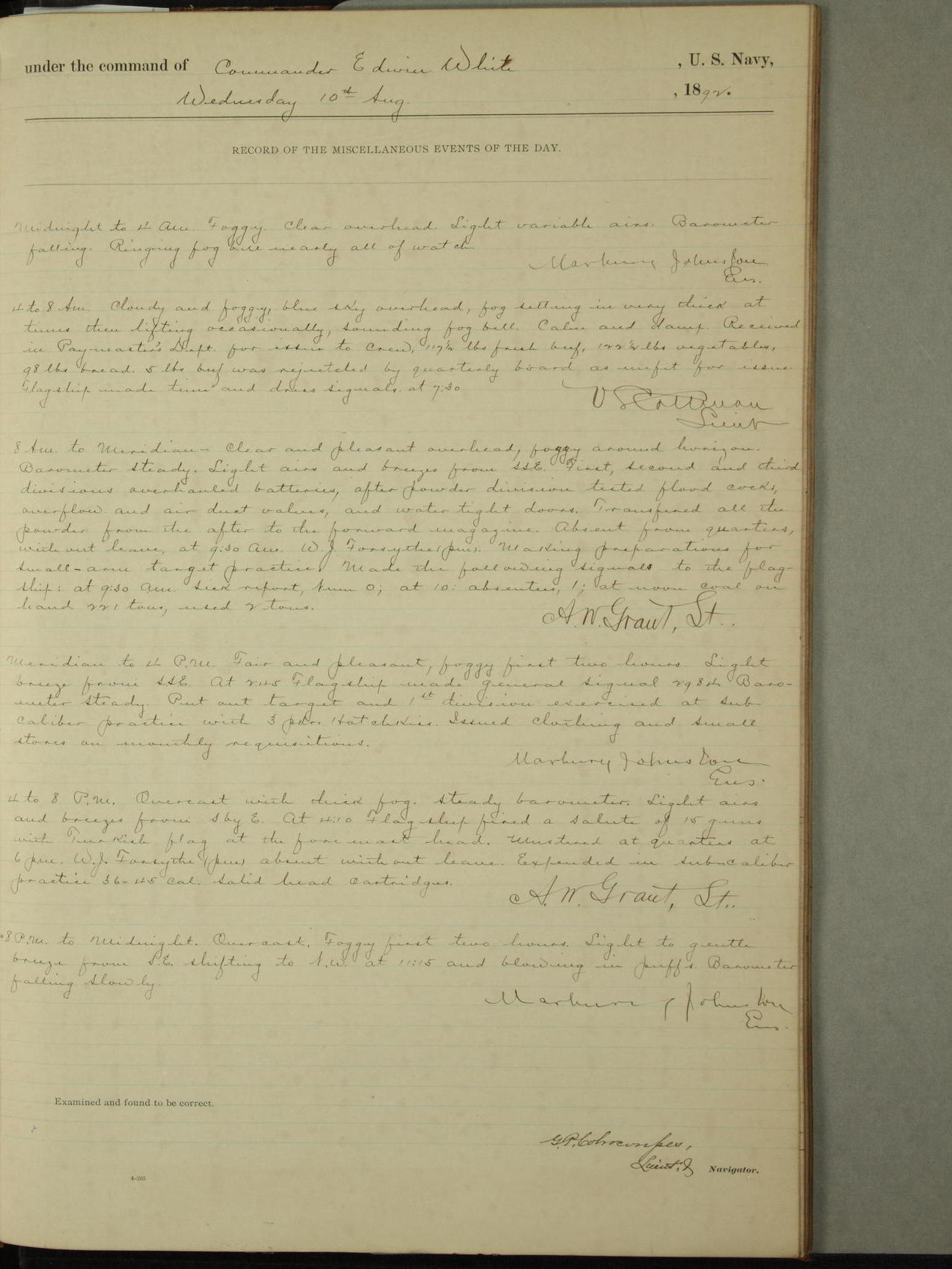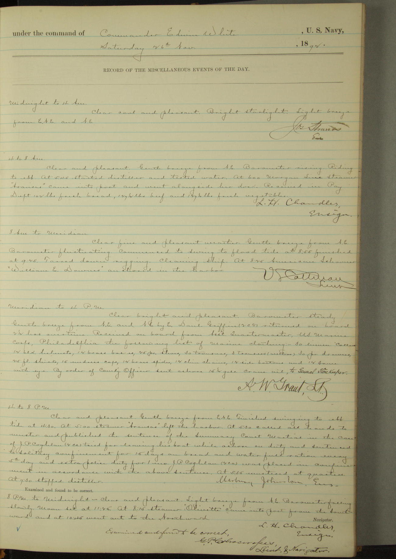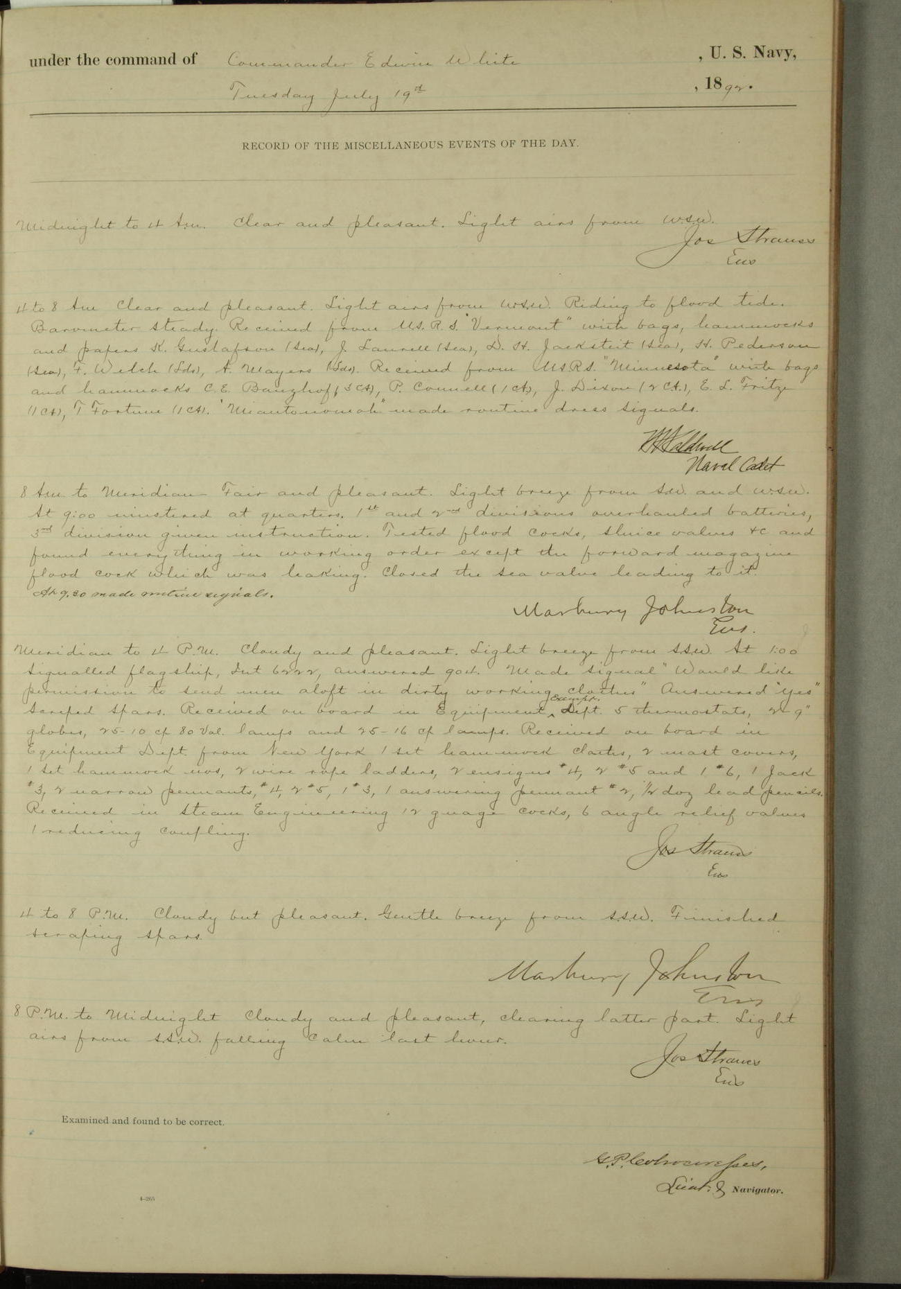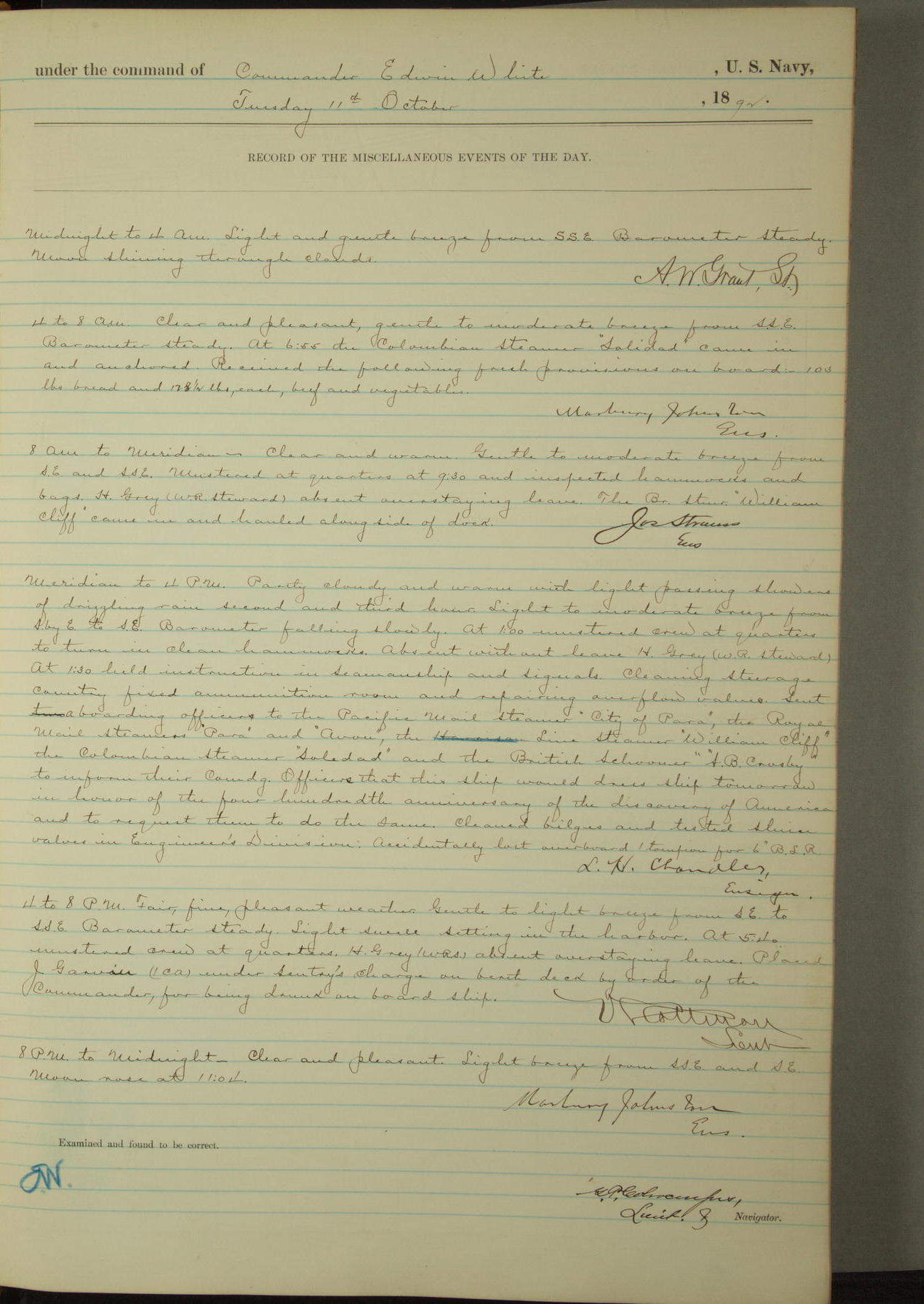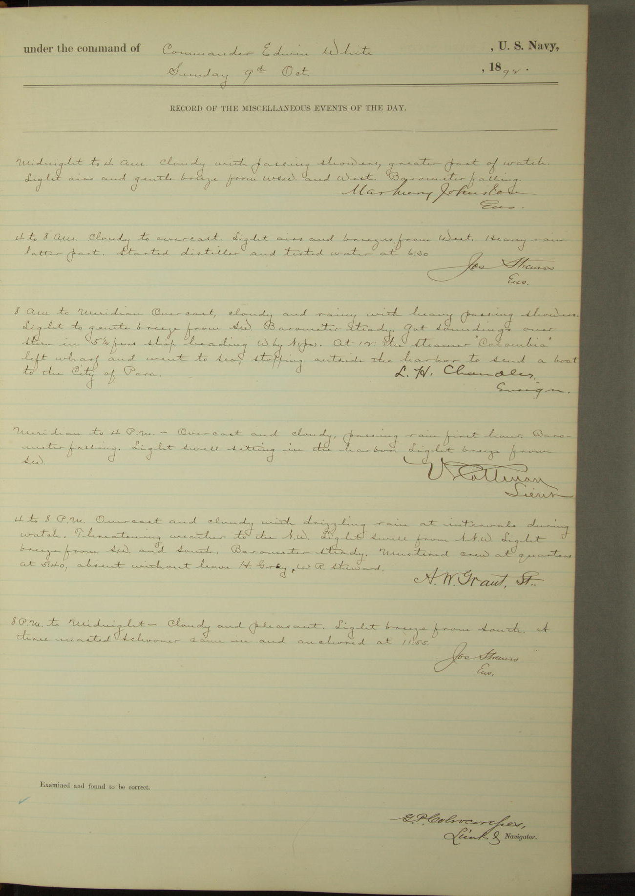 Examined and found to be correct. G. P. Ch????npes, Louit. G. Navigator