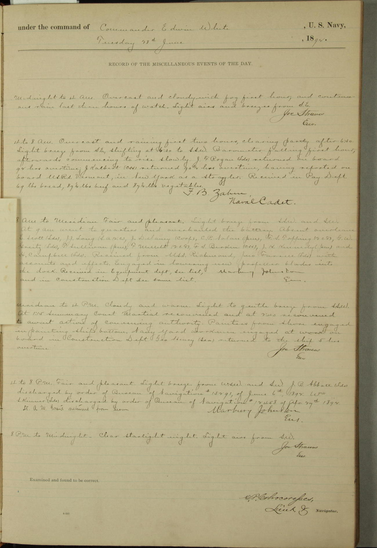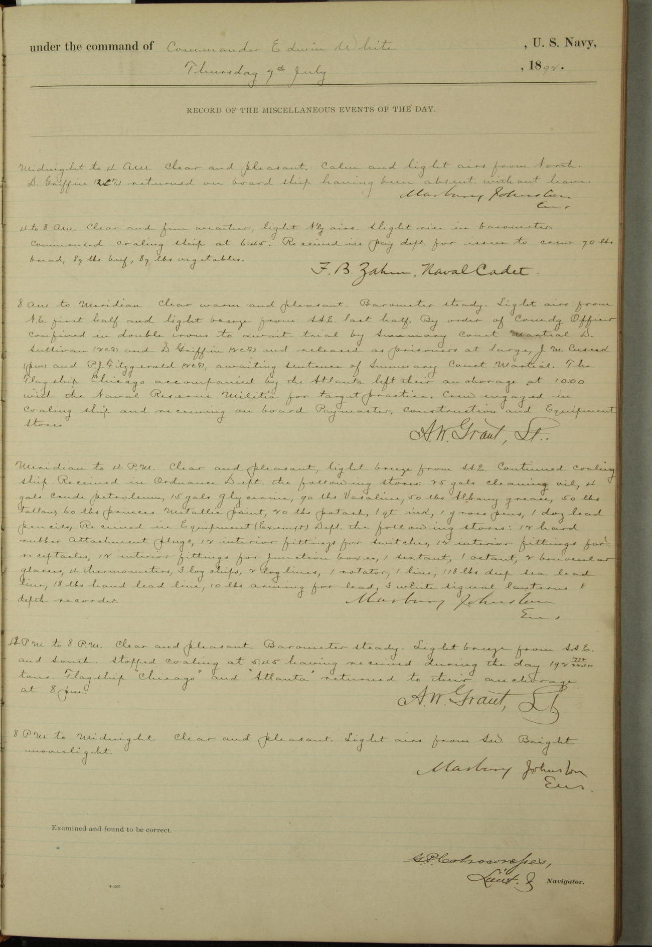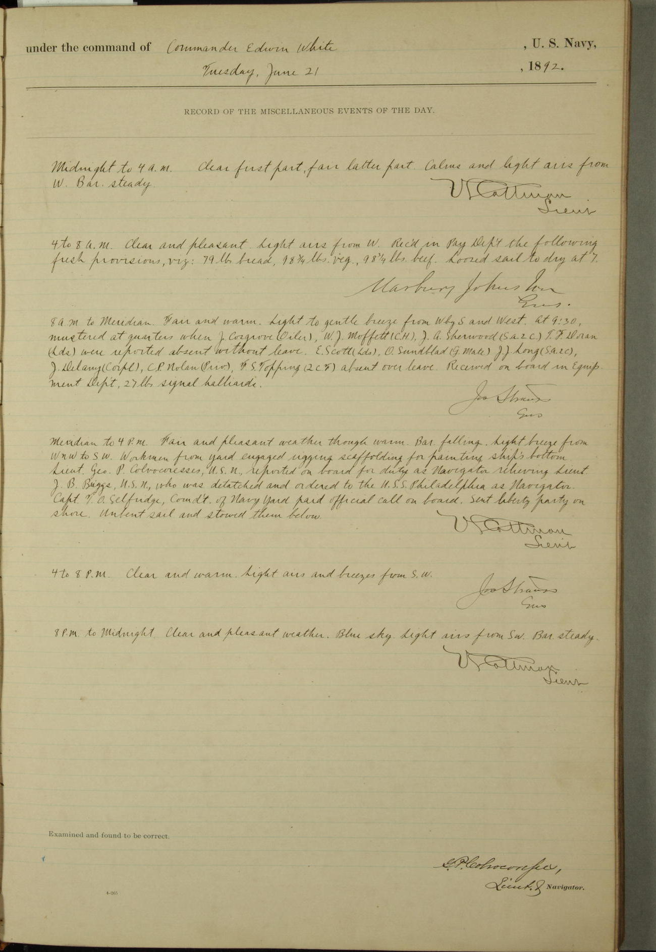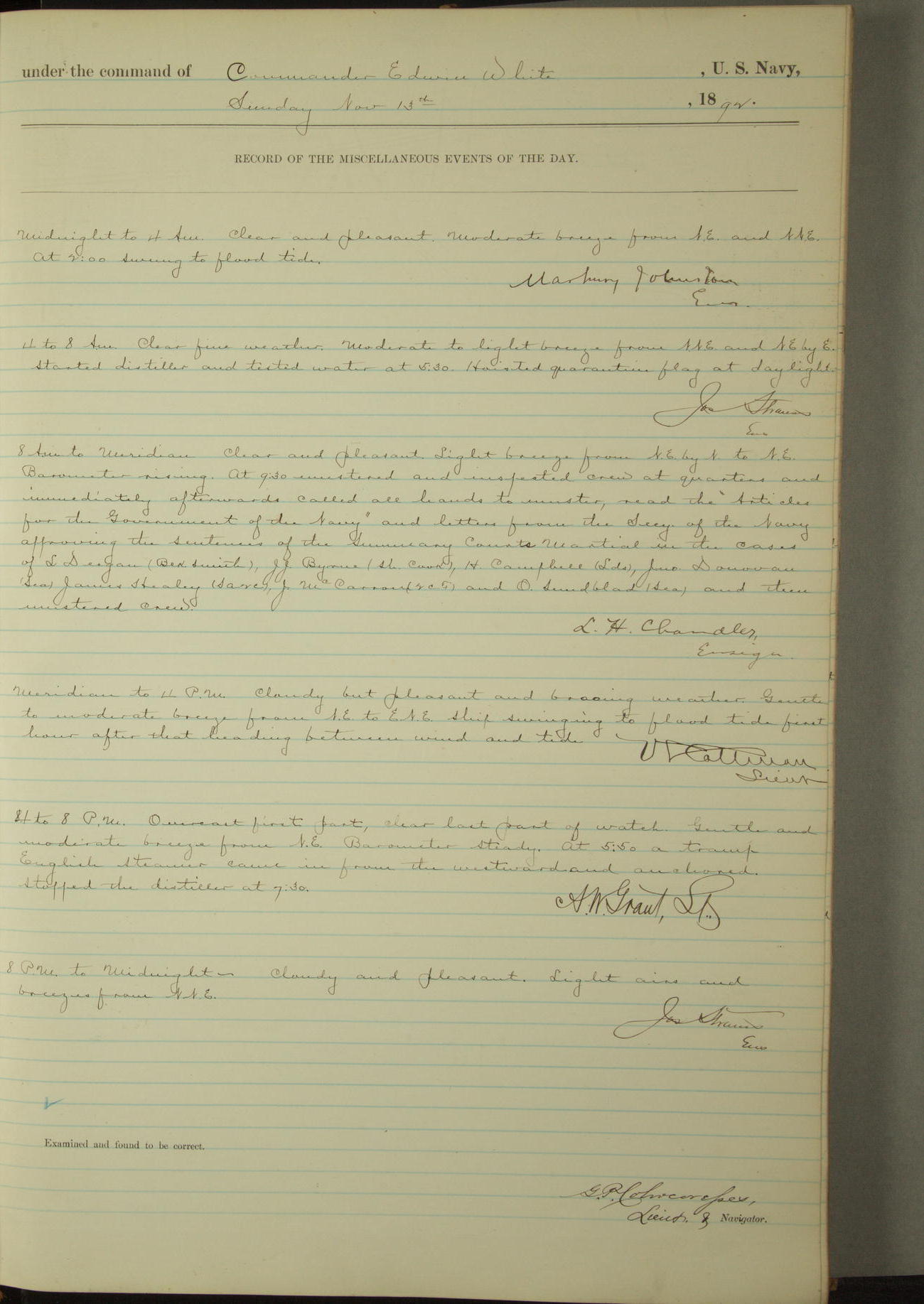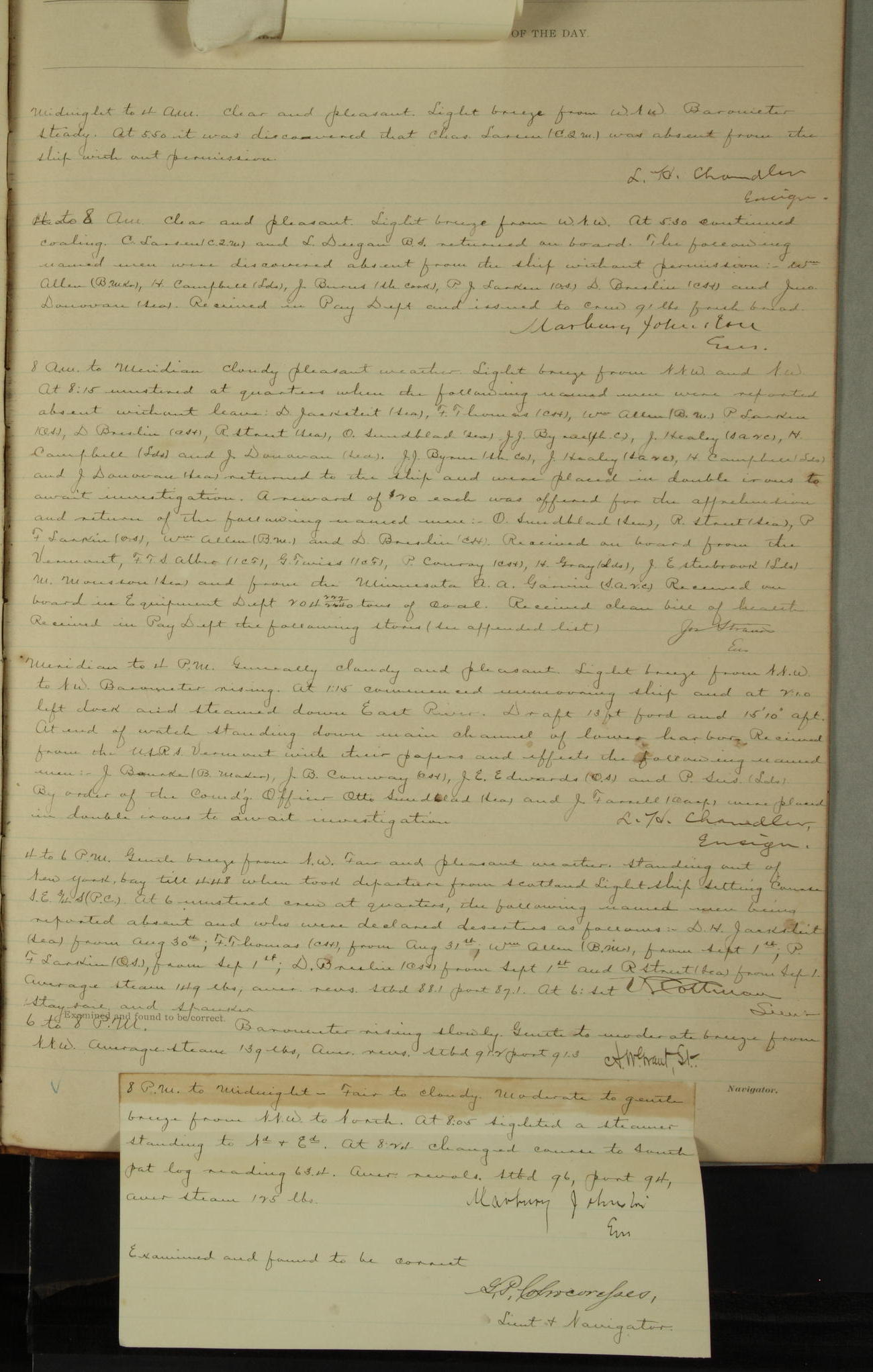 Examined and found to be correct. G. P. Ch????npes, Louit. G. Navigator