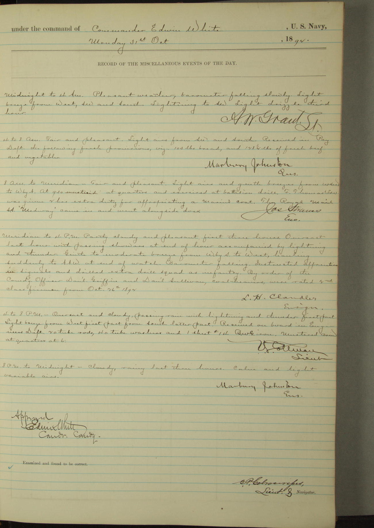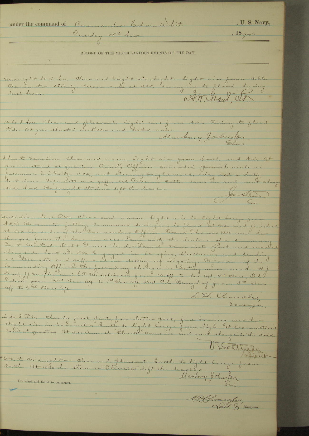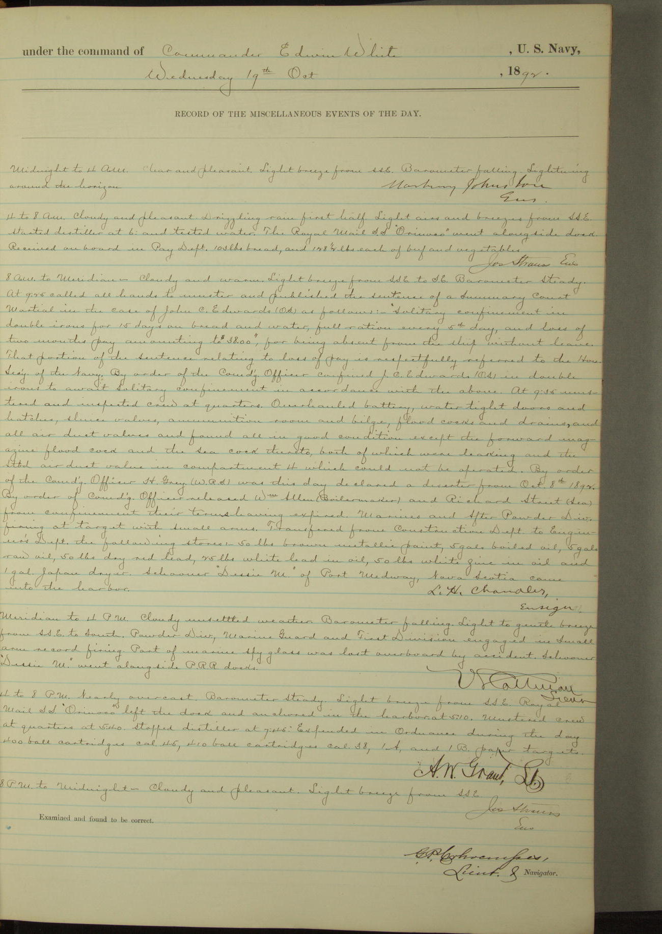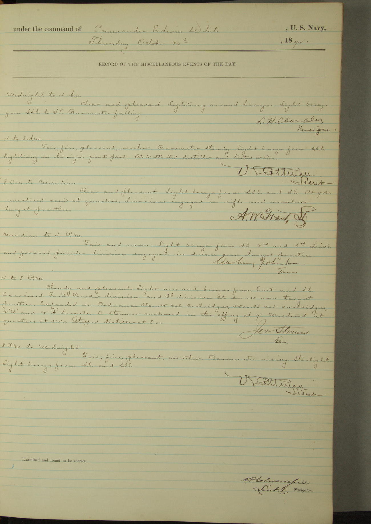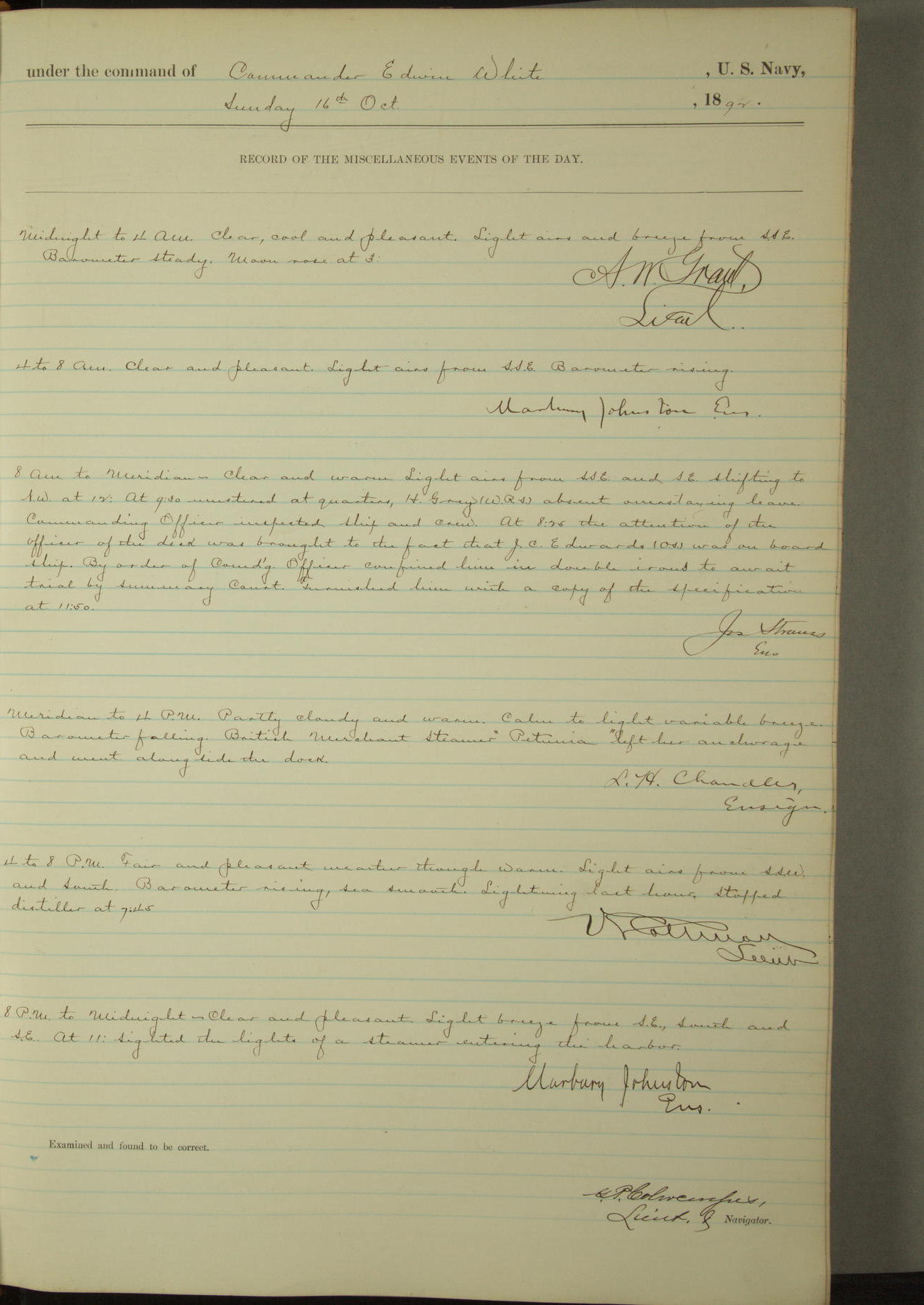 Examined and found to be correct. G. P. Ch????npes, Louit. G. Navigator