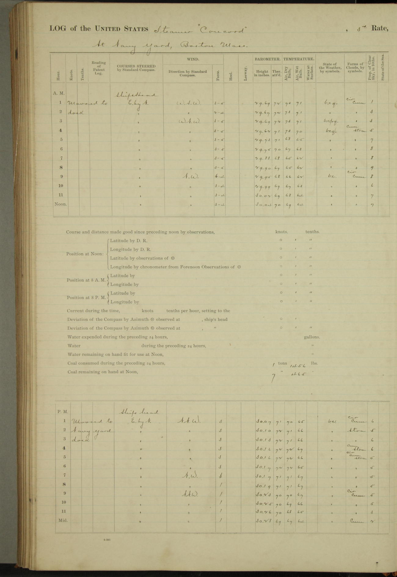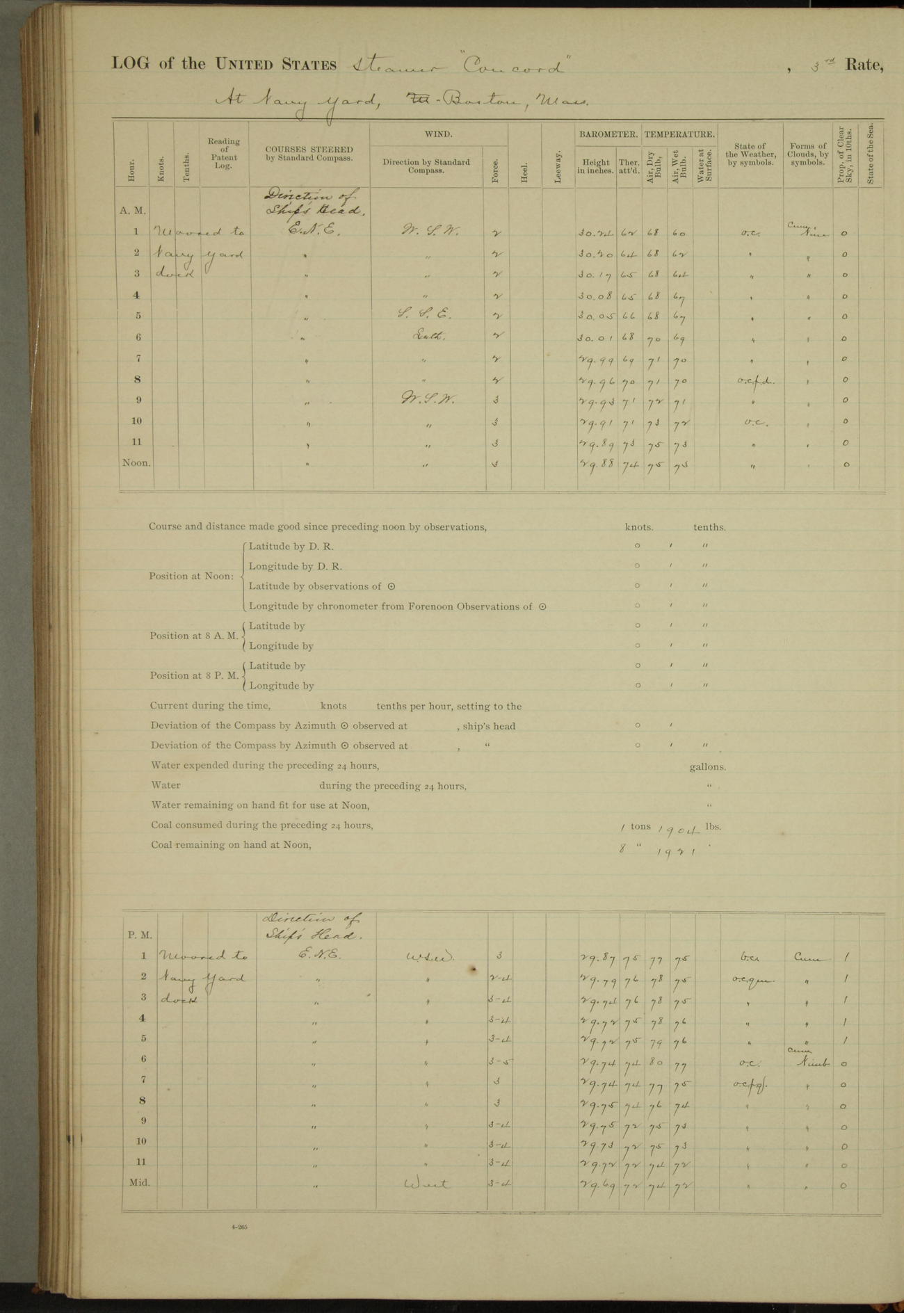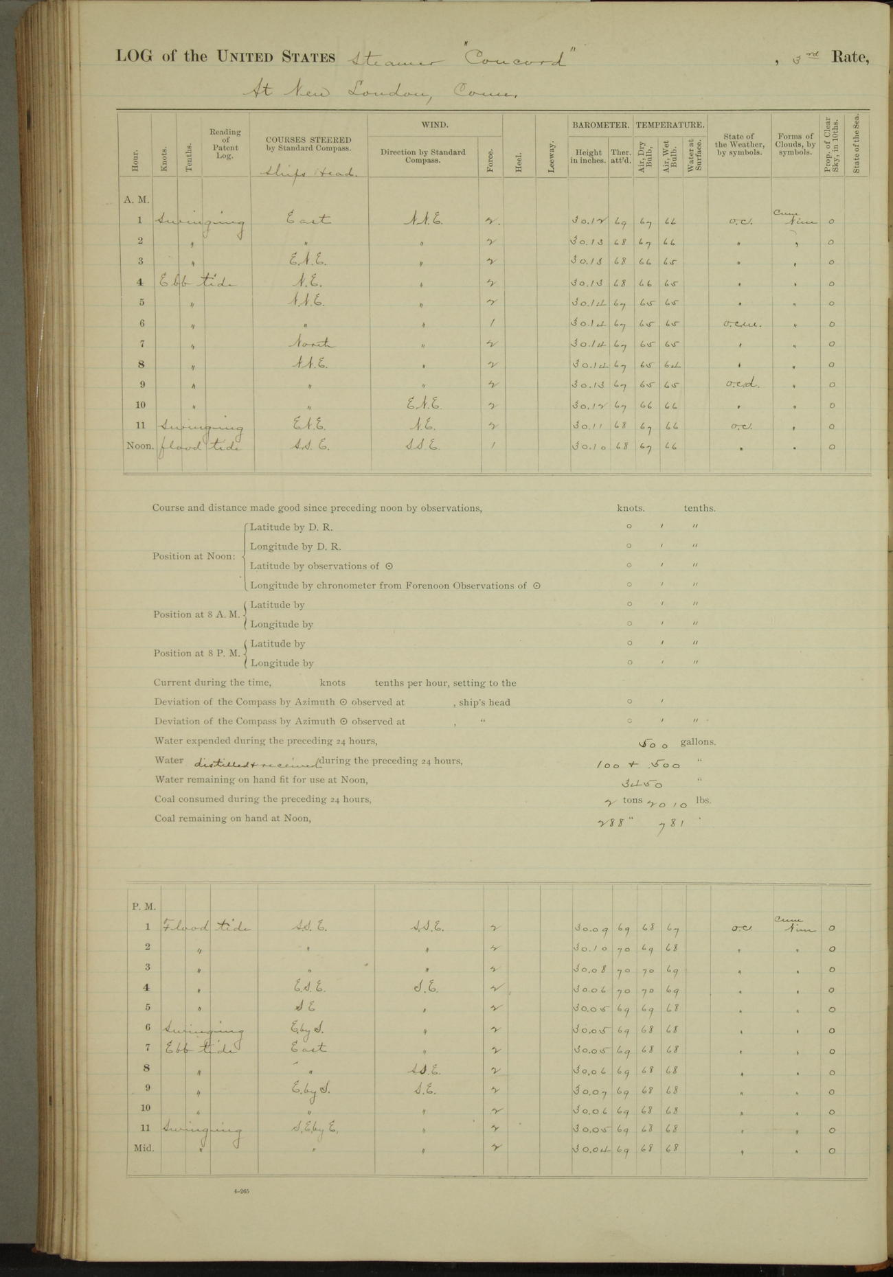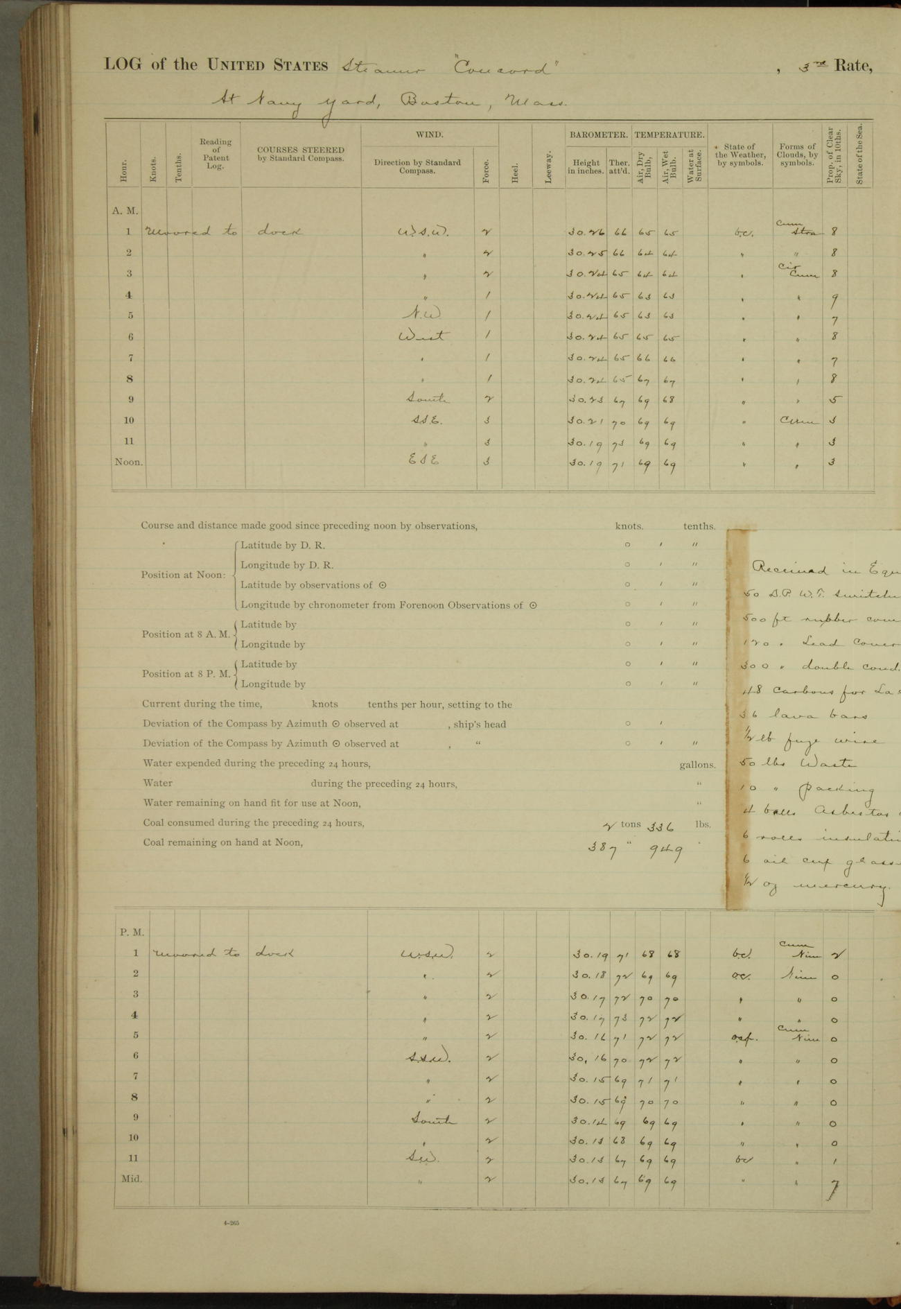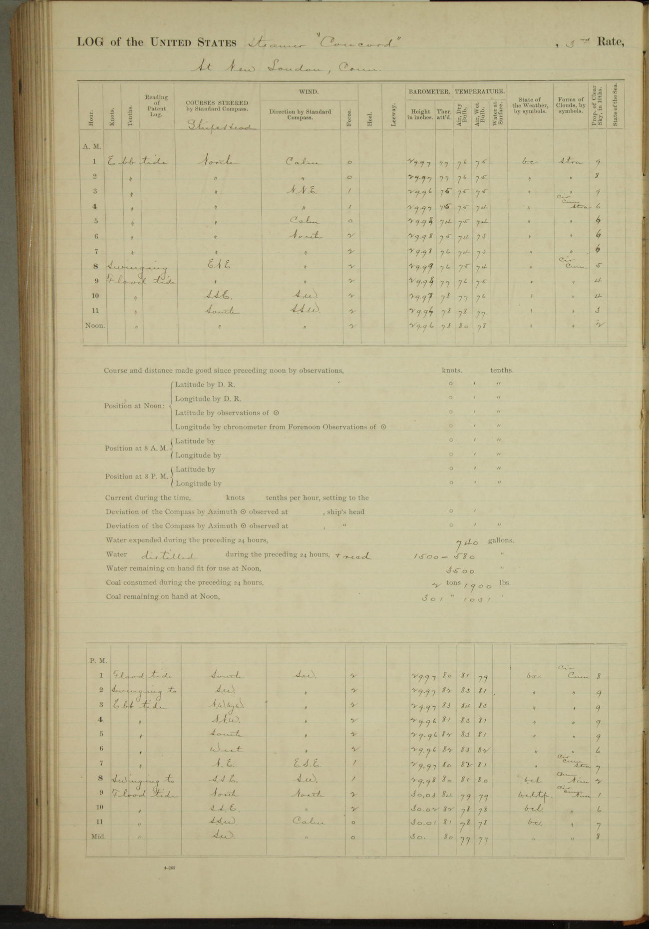 At 10:30 AM captain Joseph U Miller U.S.N. representing the Commandant of the Navy yard, officially turned this vessel over to the Commander Oliver A. Batcheller USN who, with the officers & crew on the Quarter deck read the order from the Navy Department detailing him to command this vessel: whereupon the U.S Str Concord was declared in commission and the colors & pennant were hoisted.