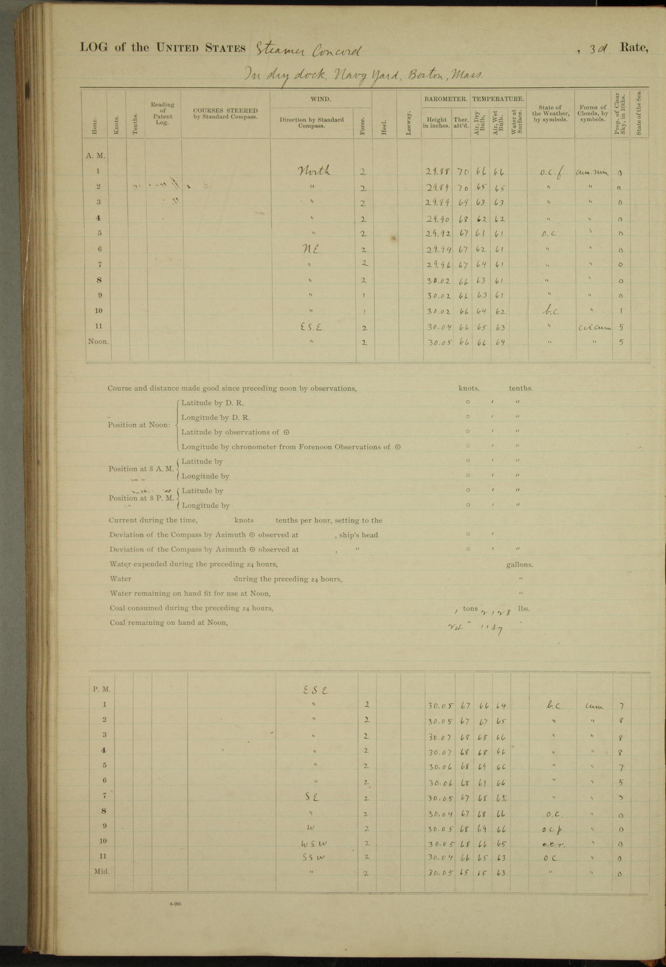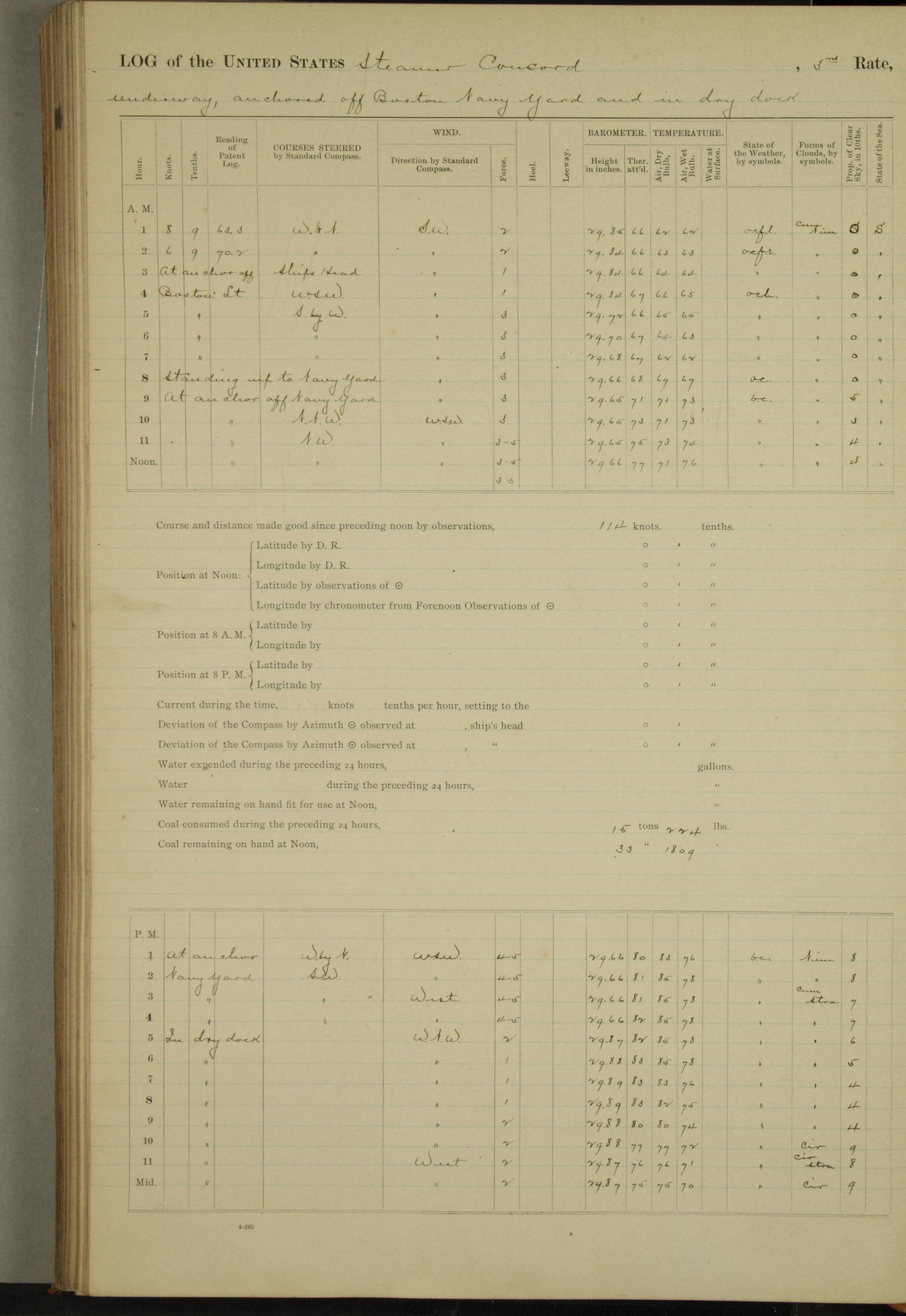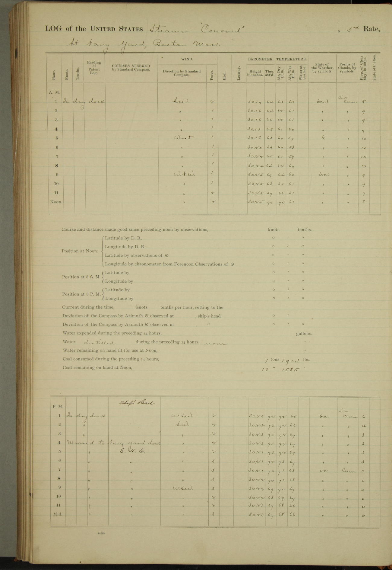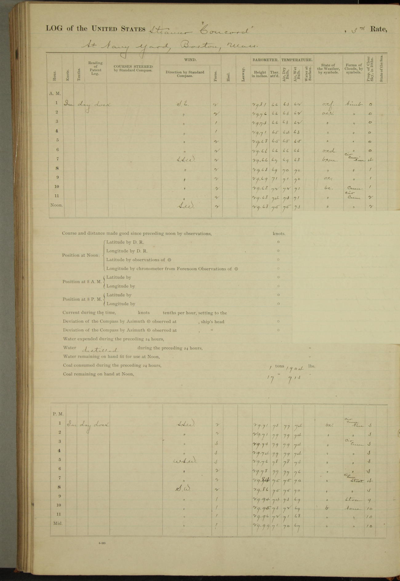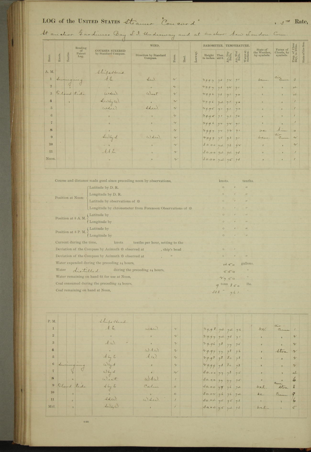 At 10:30 AM captain Joseph U Miller U.S.N. representing the Commandant of the Navy yard, officially turned this vessel over to the Commander Oliver A. Batcheller USN who, with the officers & crew on the Quarter deck read the order from the Navy Department detailing him to command this vessel: whereupon the U.S Str Concord was declared in commission and the colors & pennant were hoisted.