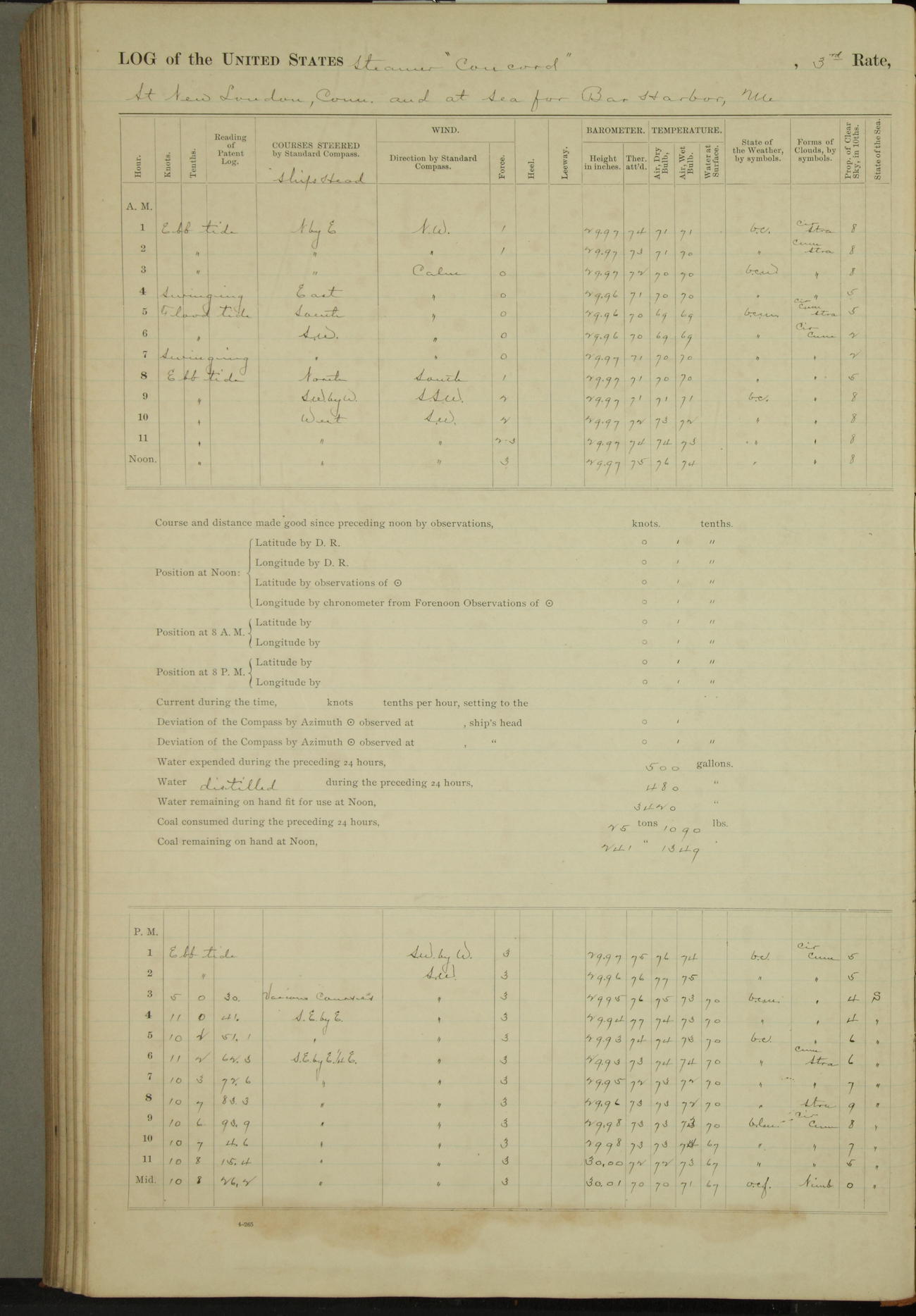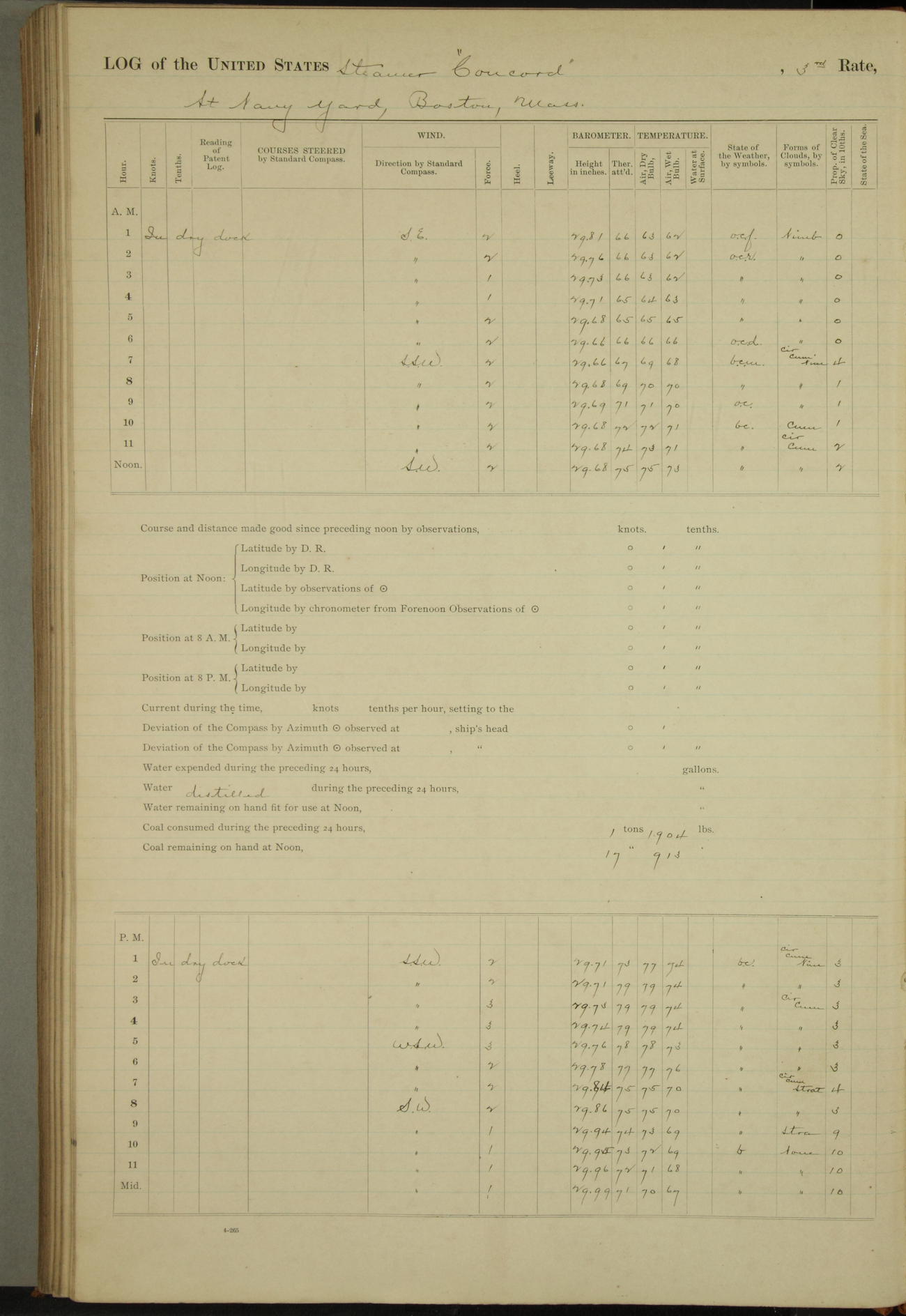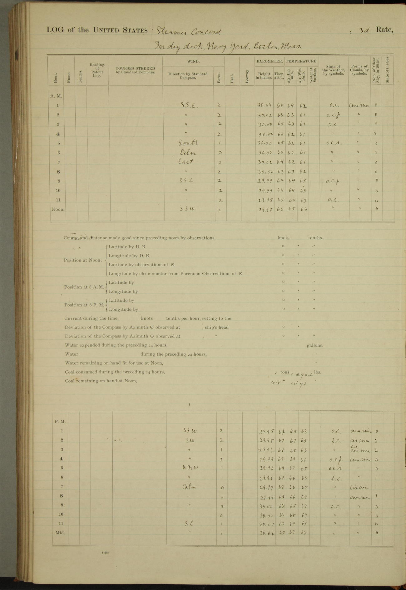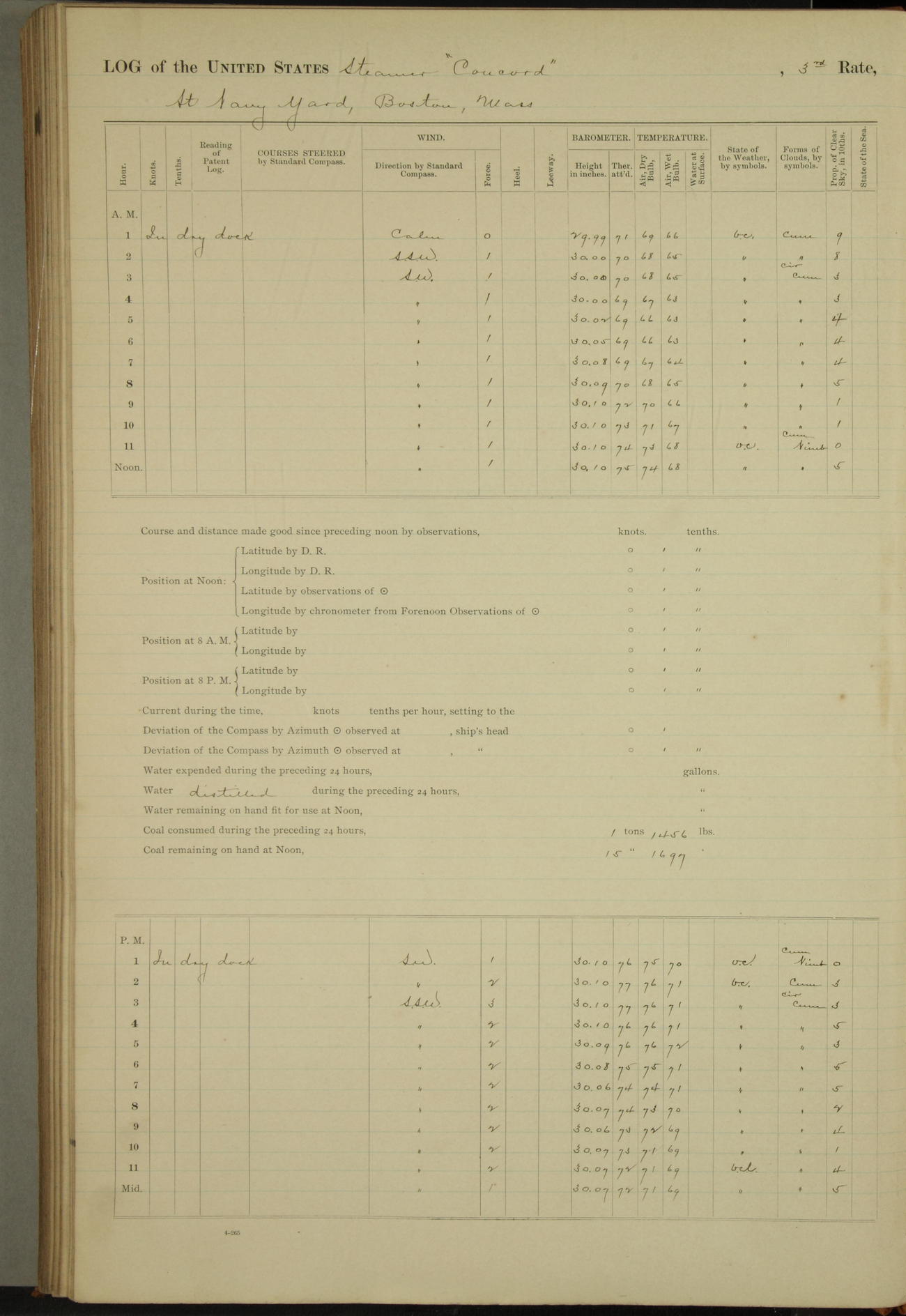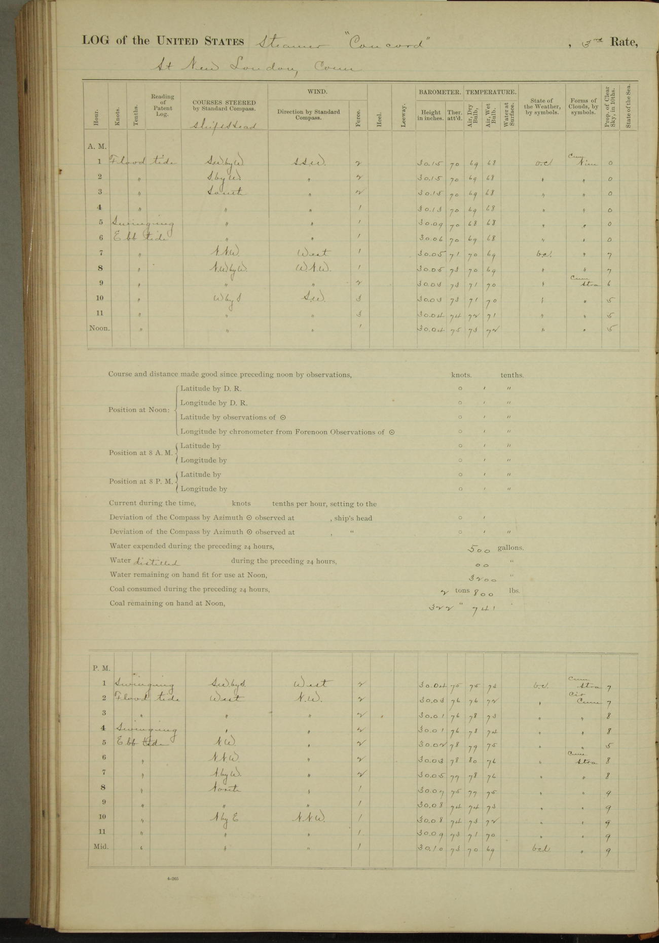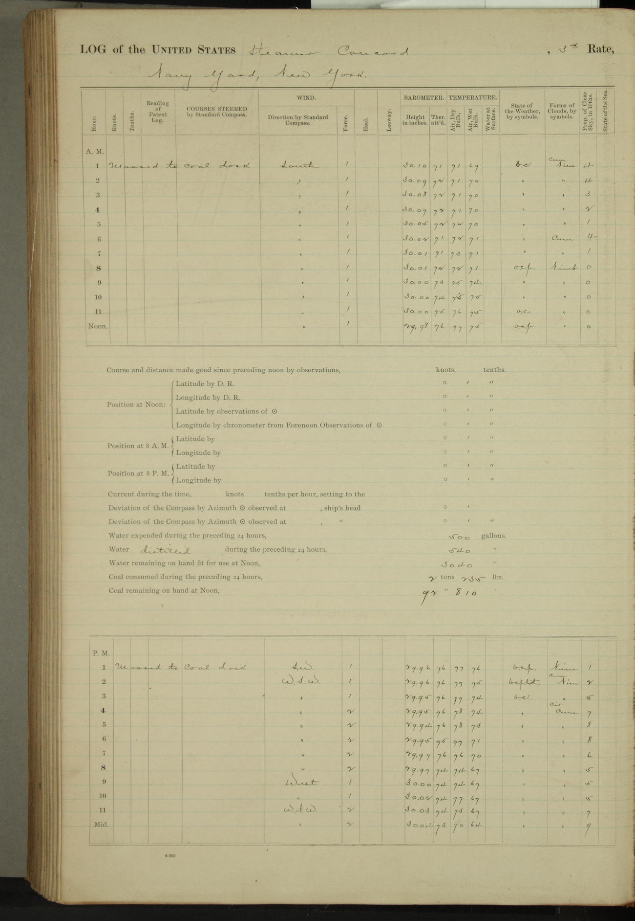 At 10:30 AM captain Joseph U Miller U.S.N. representing the Commandant of the Navy yard, officially turned this vessel over to the Commander Oliver A. Batcheller USN who, with the officers & crew on the Quarter deck read the order from the Navy Department detailing him to command this vessel: whereupon the U.S Str Concord was declared in commission and the colors & pennant were hoisted.