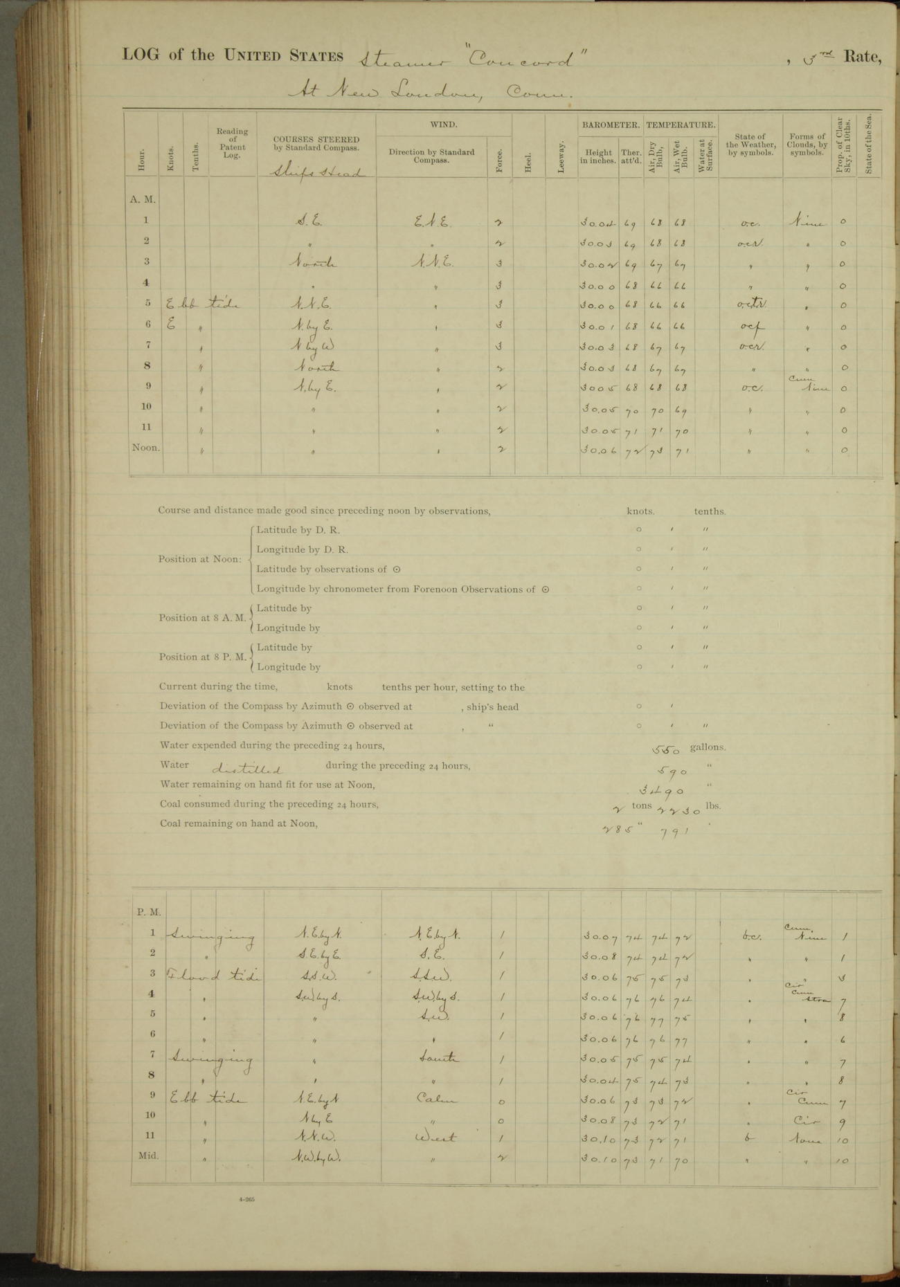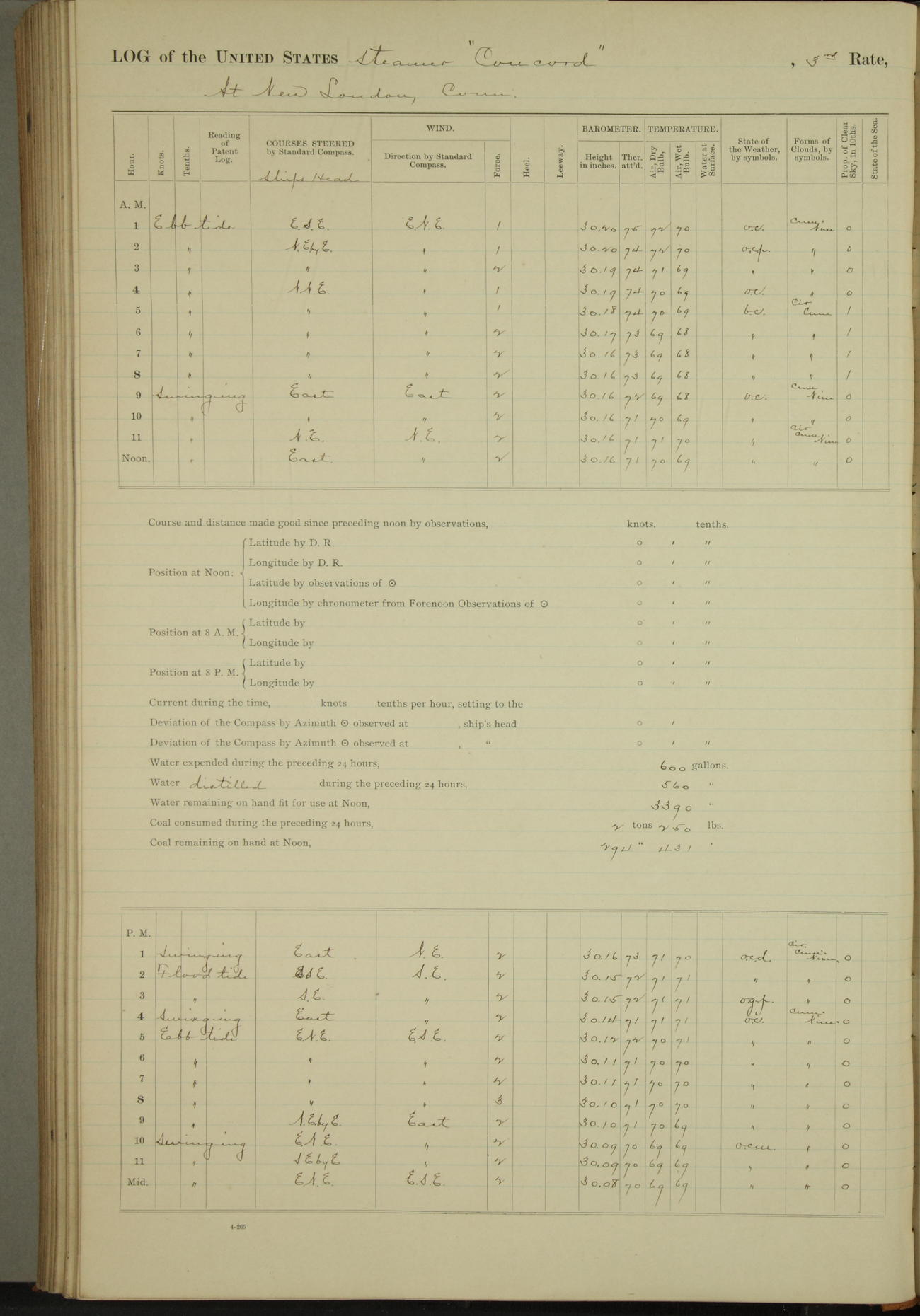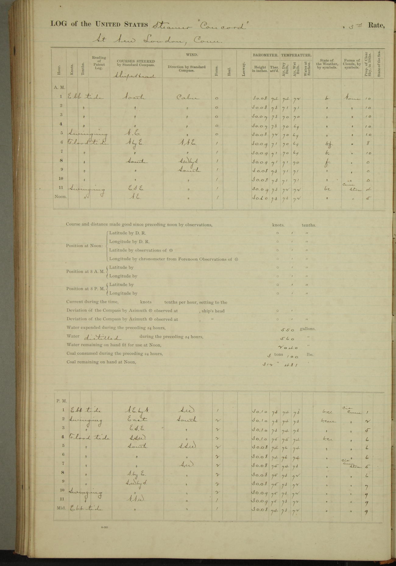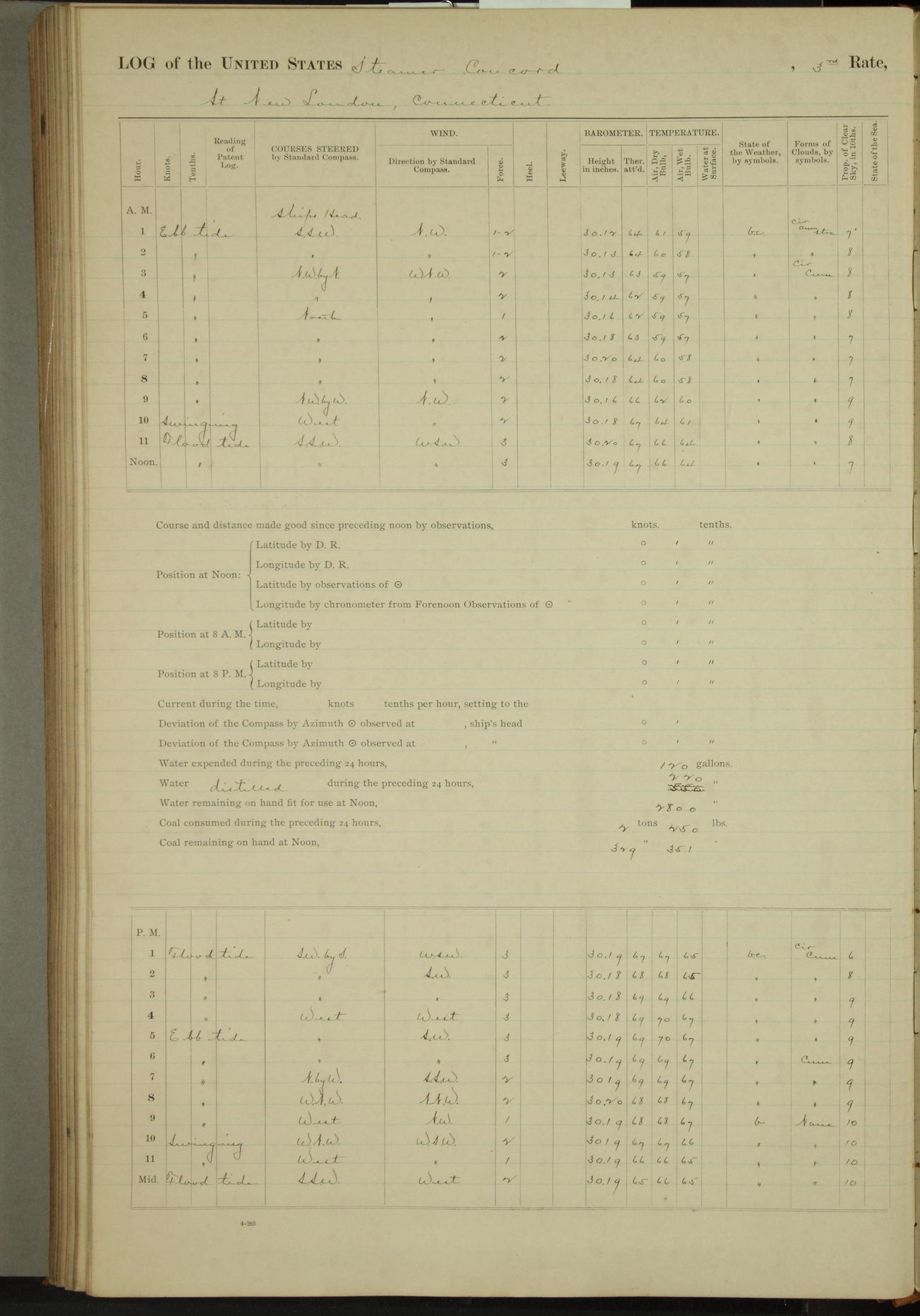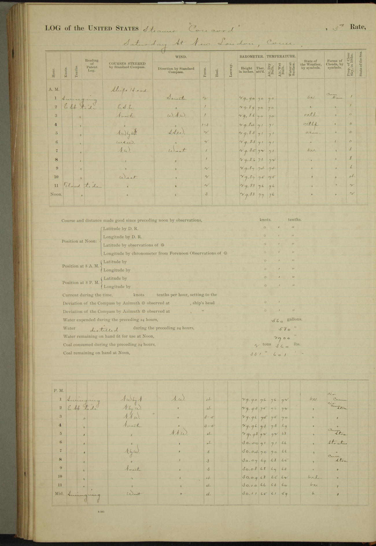 At 10:30 AM captain Joseph U Miller U.S.N. representing the Commandant of the Navy yard, officially turned this vessel over to the Commander Oliver A. Batcheller USN who, with the officers & crew on the Quarter deck read the order from the Navy Department detailing him to command this vessel: whereupon the U.S Str Concord was declared in commission and the colors & pennant were hoisted.
