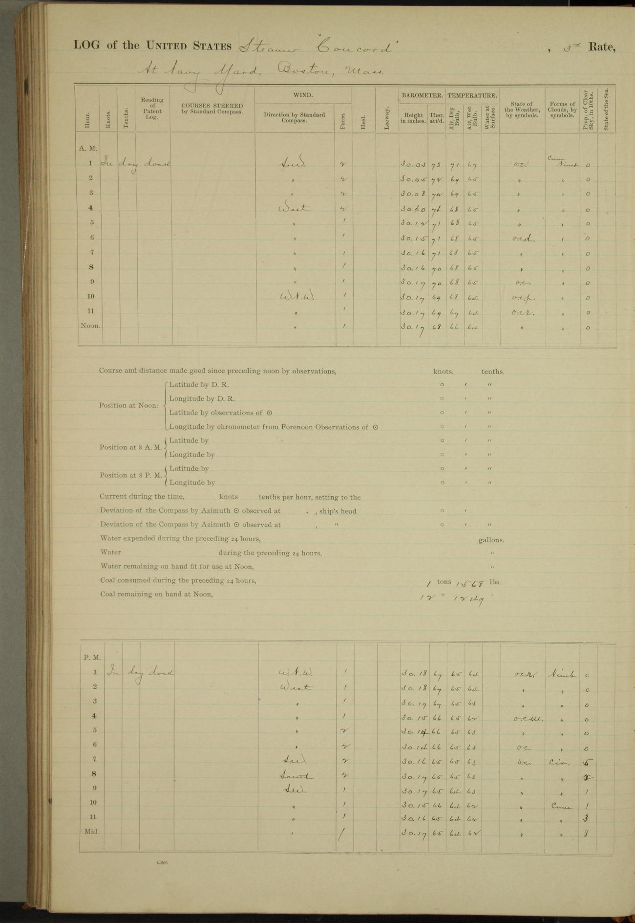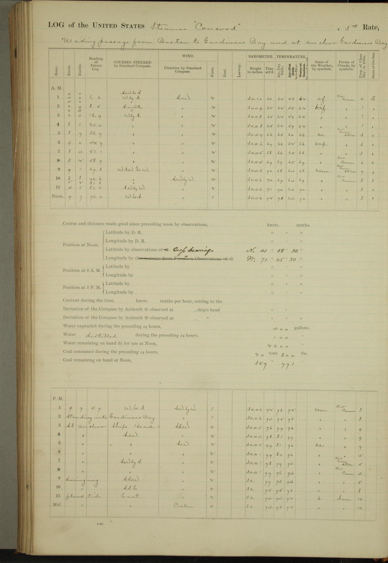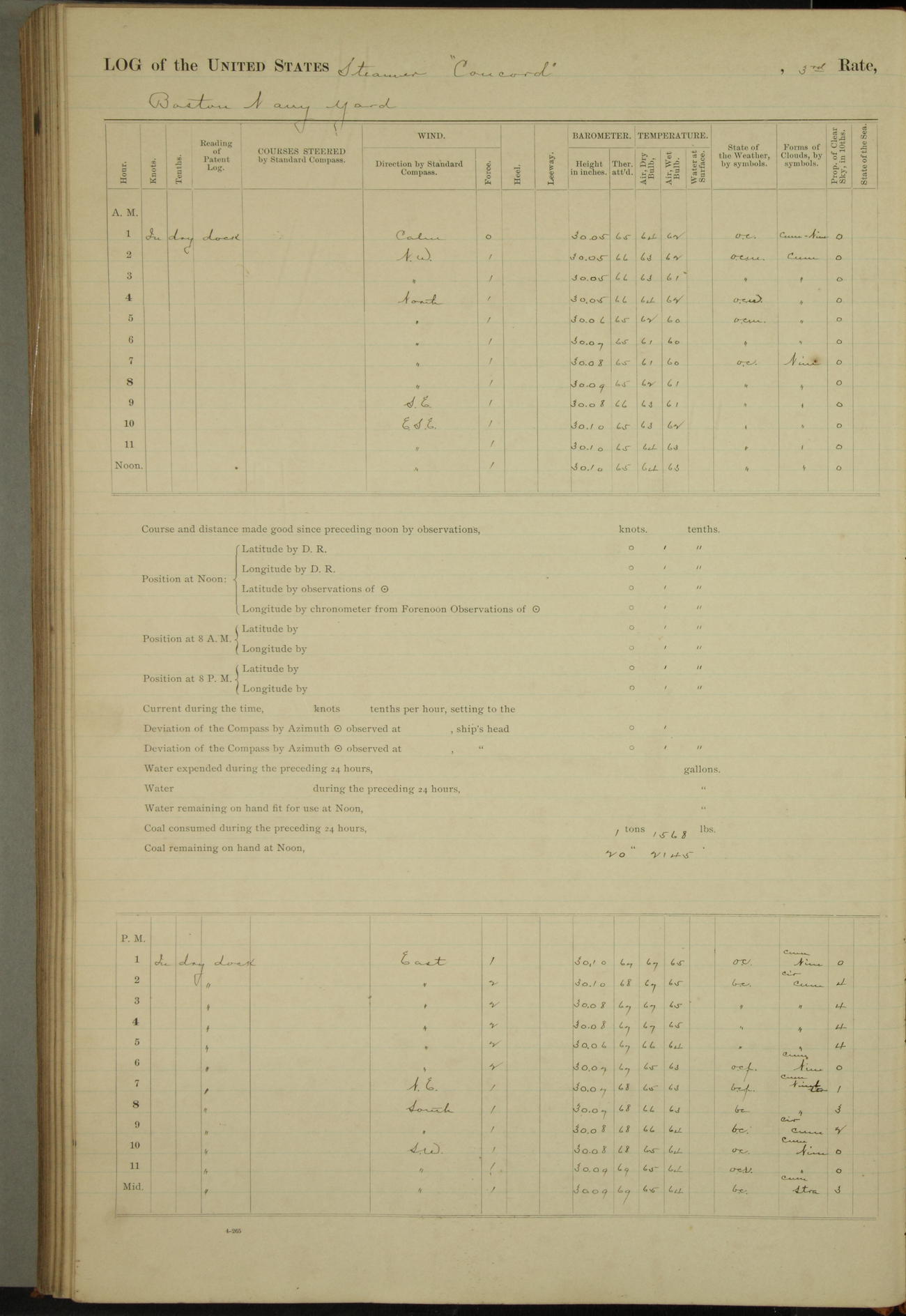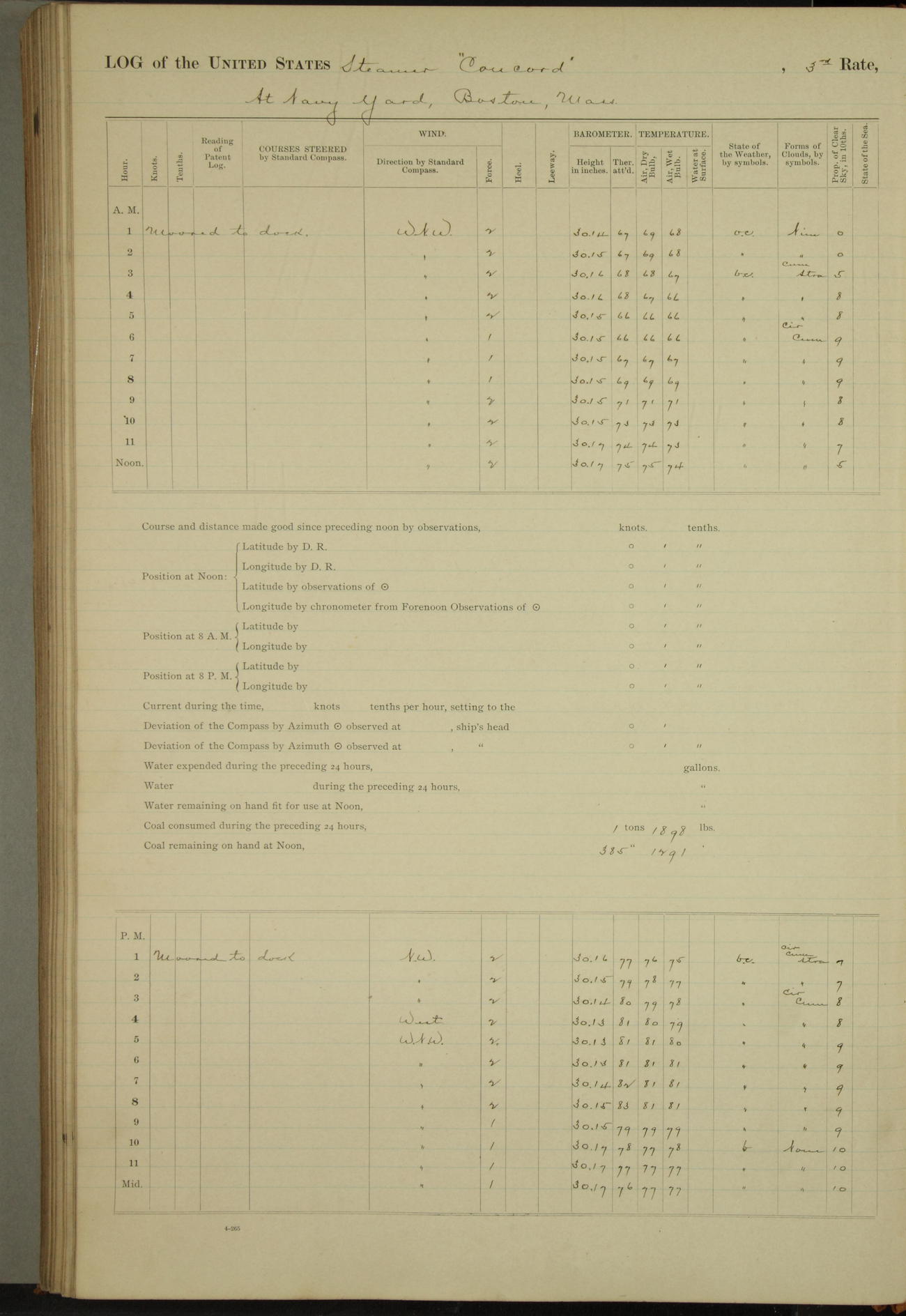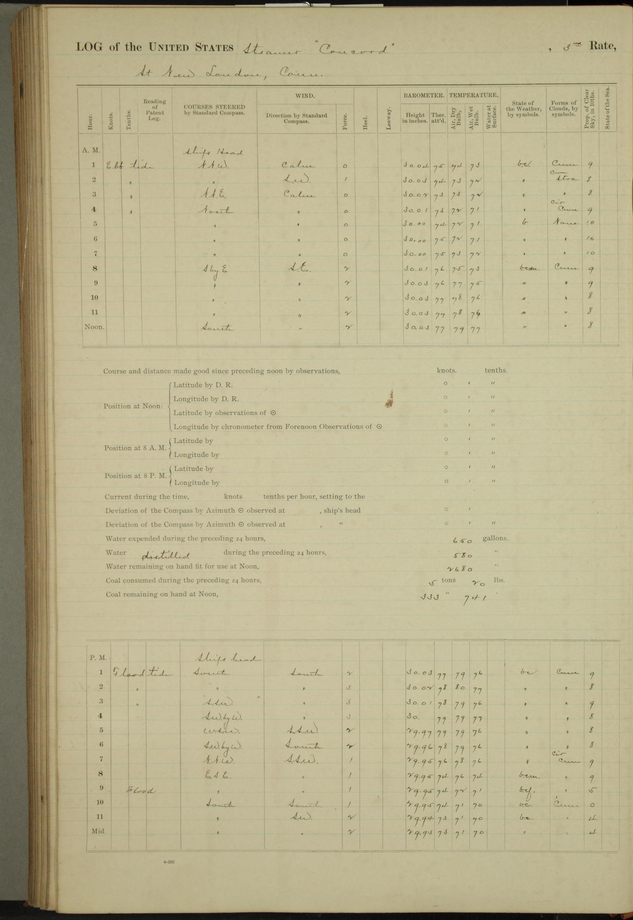 At 10:30 AM captain Joseph U Miller U.S.N. representing the Commandant of the Navy yard, officially turned this vessel over to the Commander Oliver A. Batcheller USN who, with the officers & crew on the Quarter deck read the order from the Navy Department detailing him to command this vessel: whereupon the U.S Str Concord was declared in commission and the colors & pennant were hoisted.