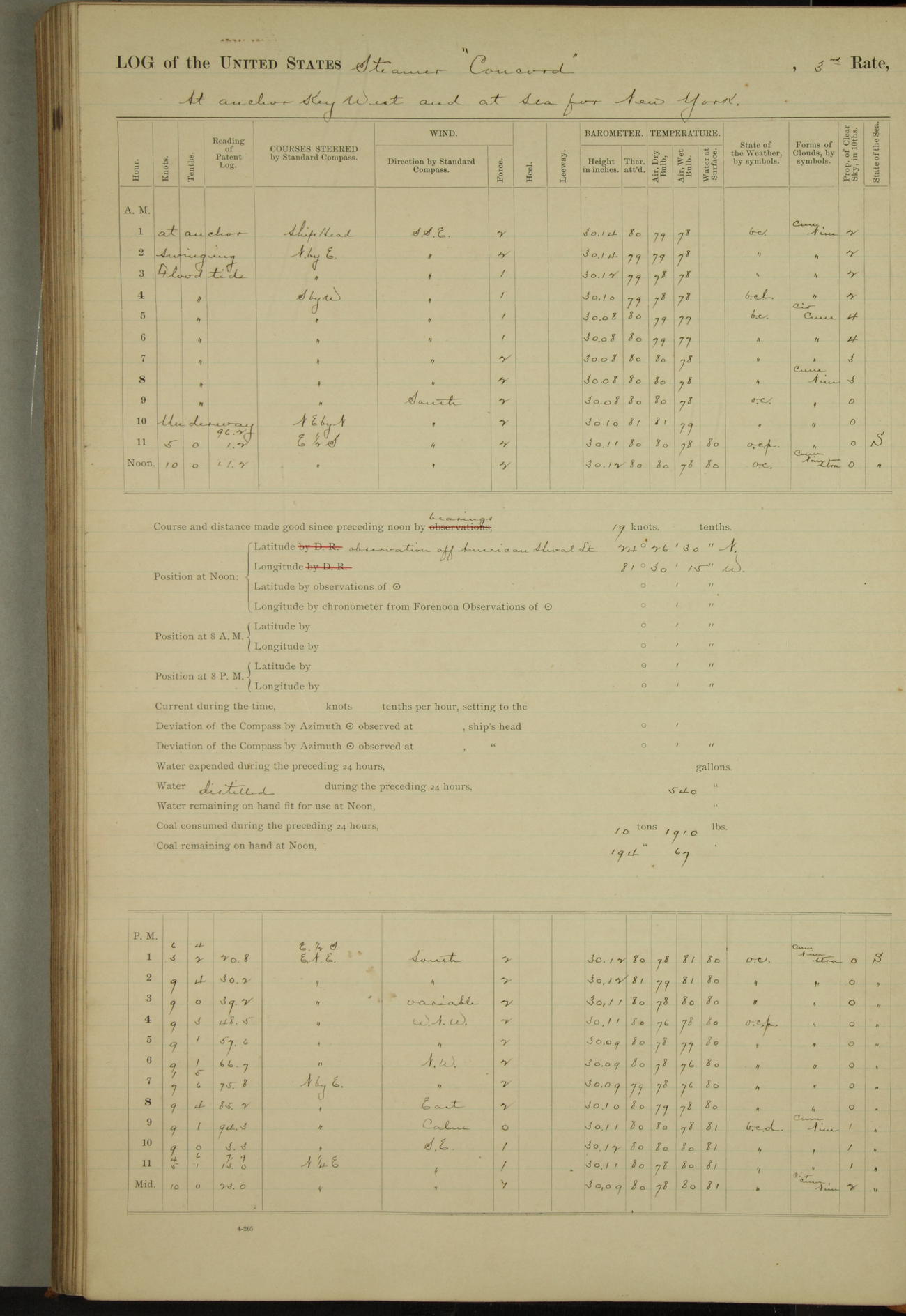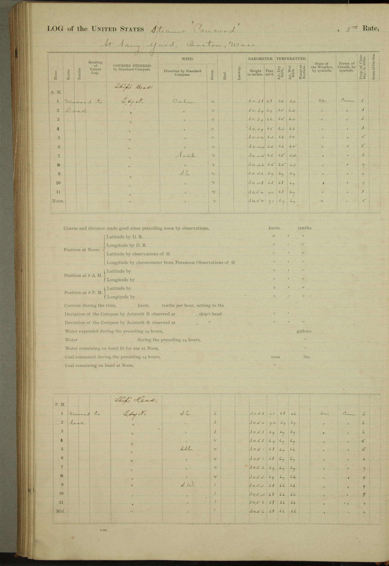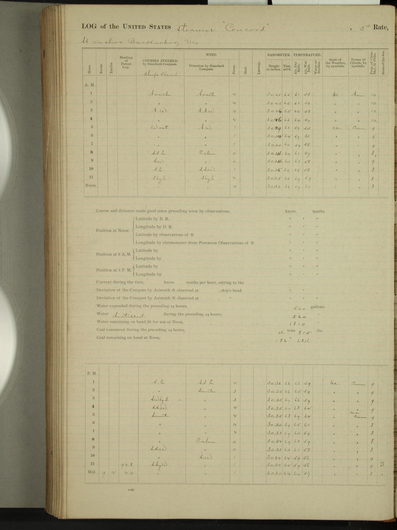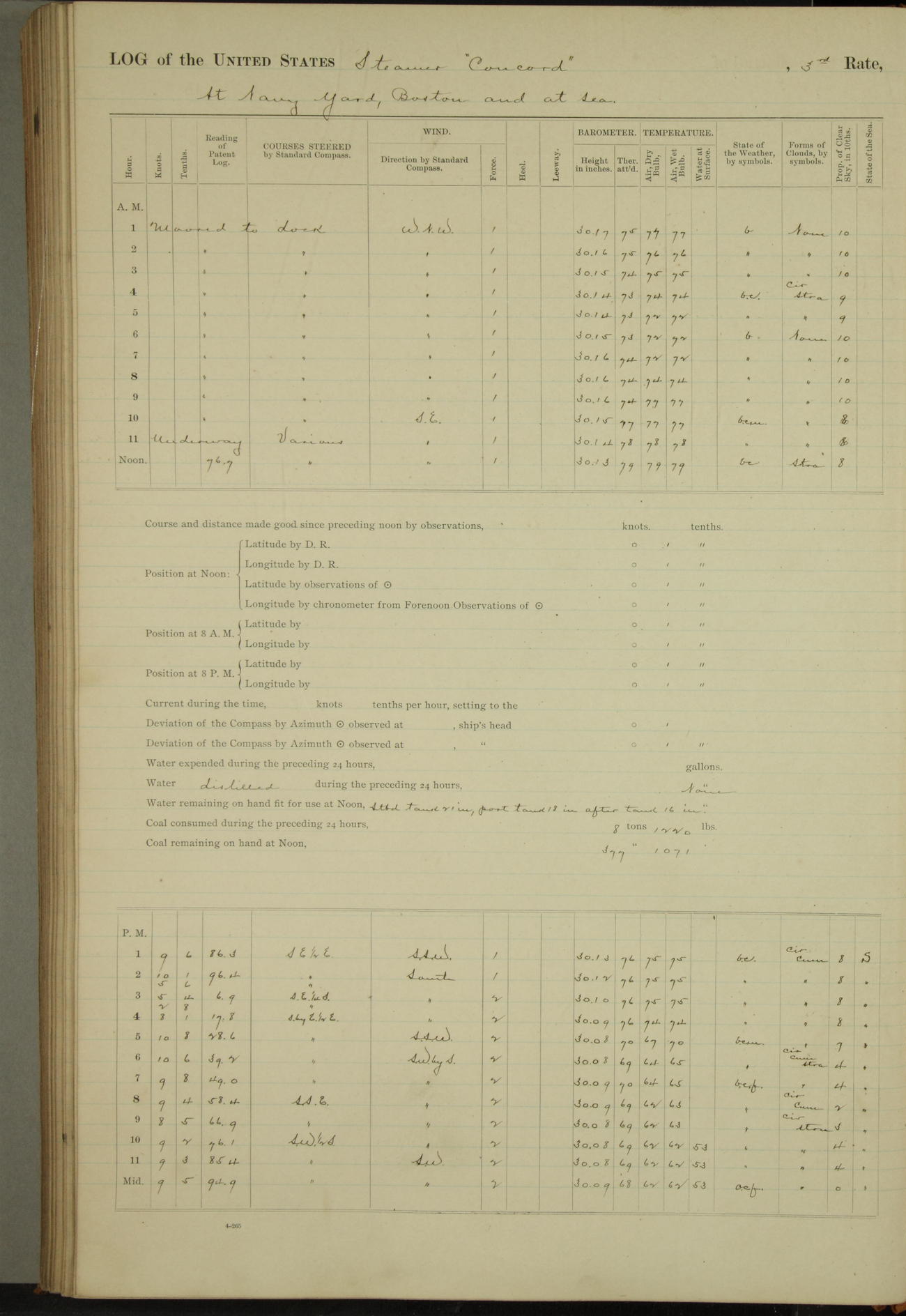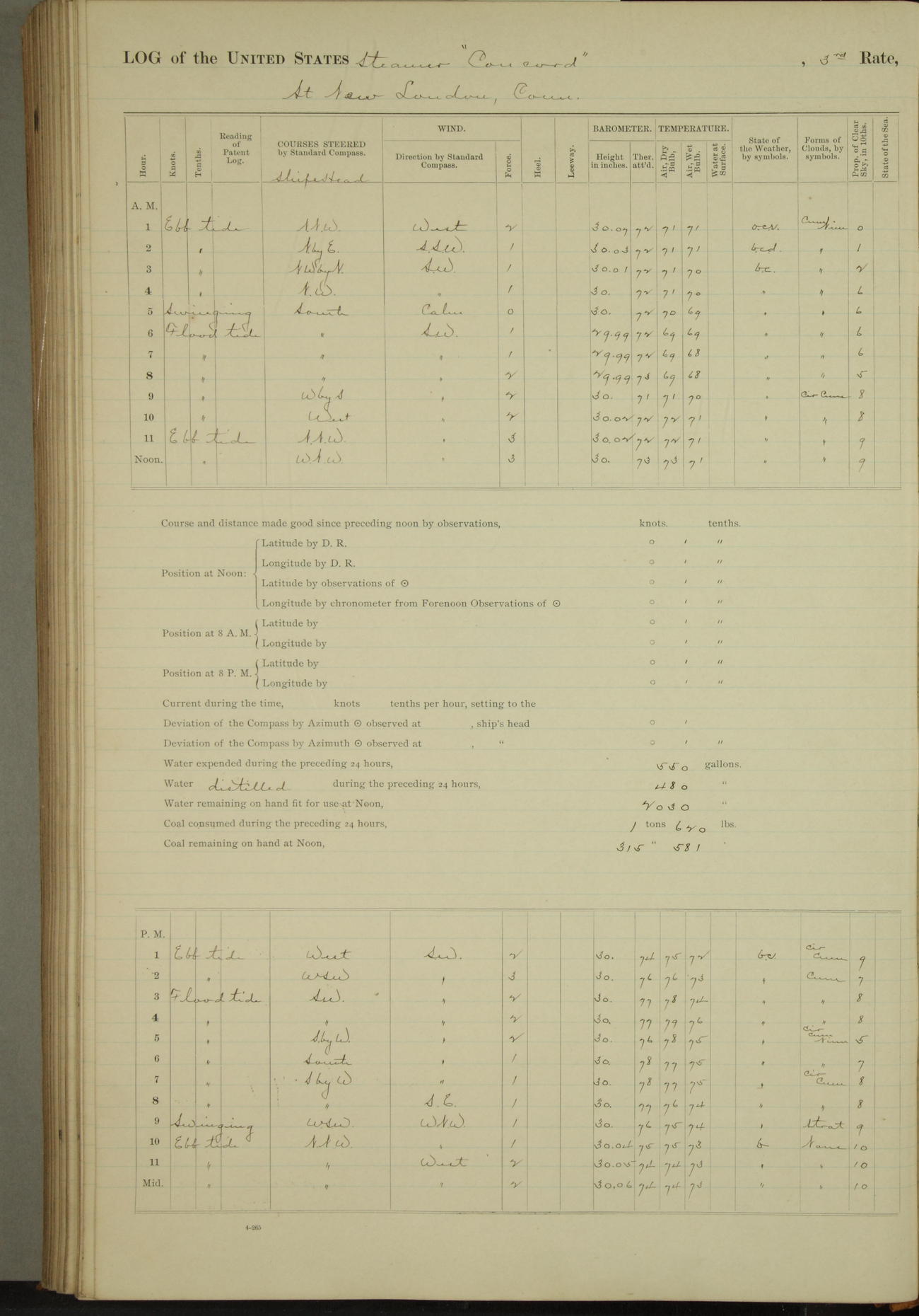 At 10:30 AM captain Joseph U Miller U.S.N. representing the Commandant of the Navy yard, officially turned this vessel over to the Commander Oliver A. Batcheller USN who, with the officers & crew on the Quarter deck read the order from the Navy Department detailing him to command this vessel: whereupon the U.S Str Concord was declared in commission and the colors & pennant were hoisted.