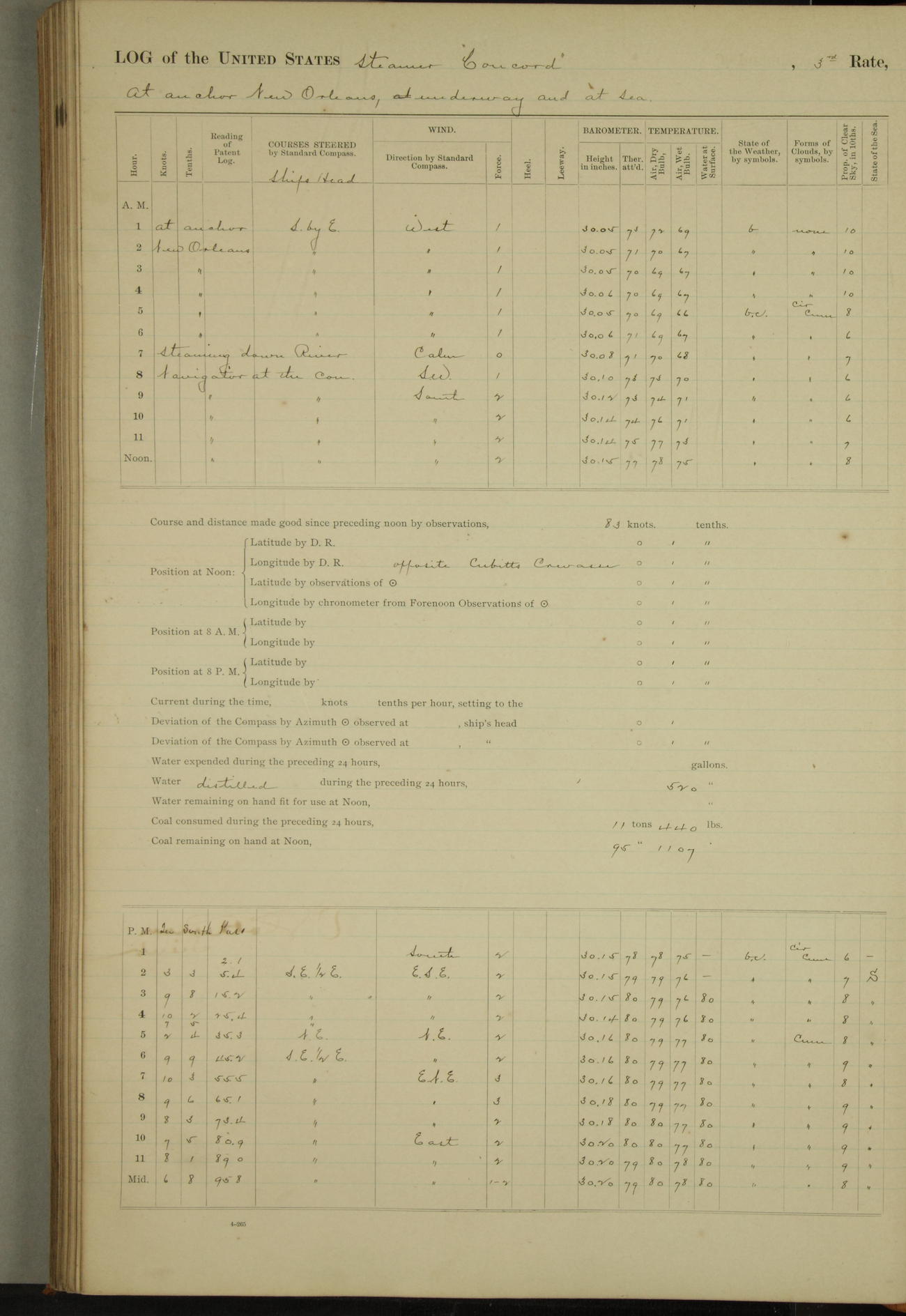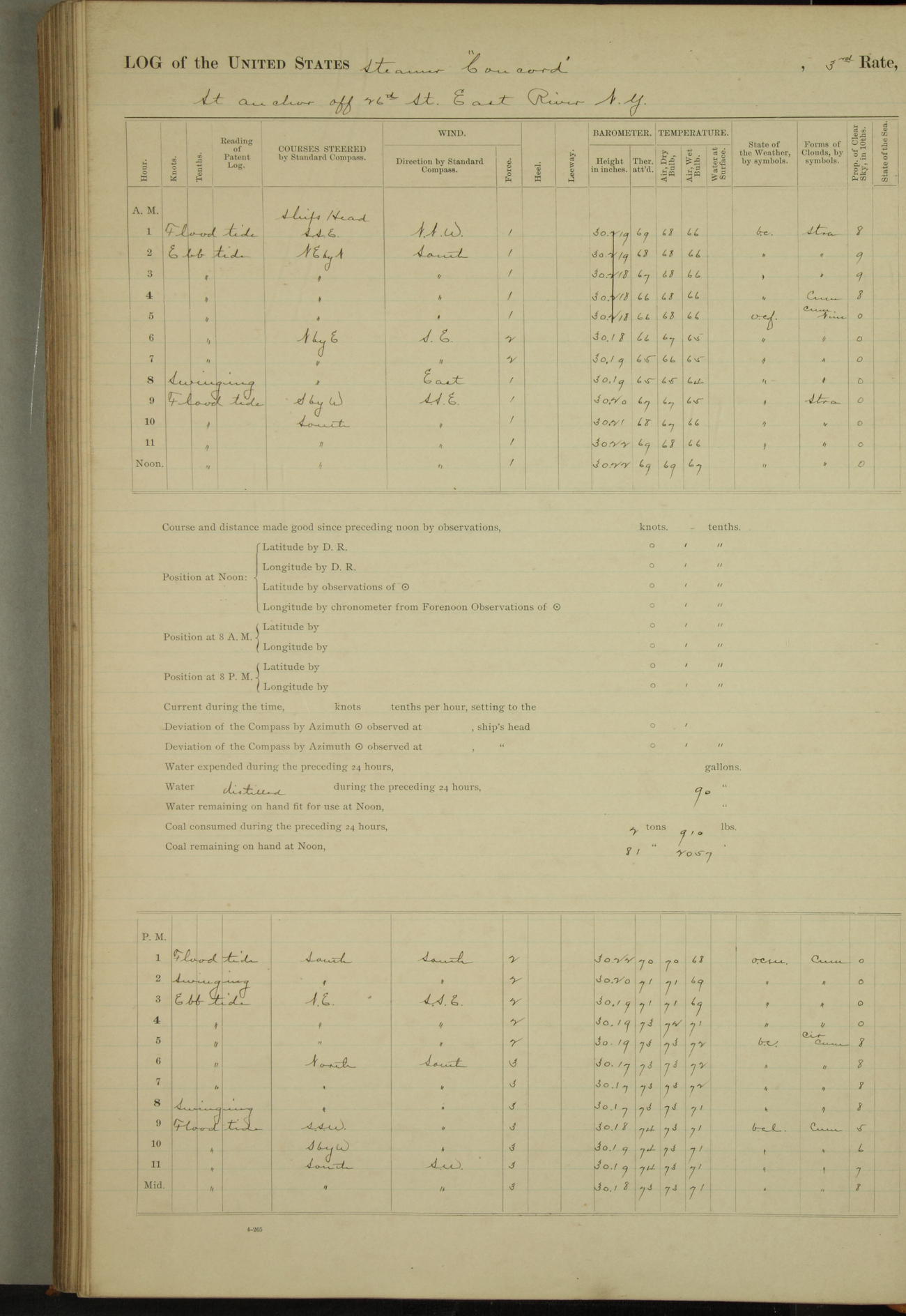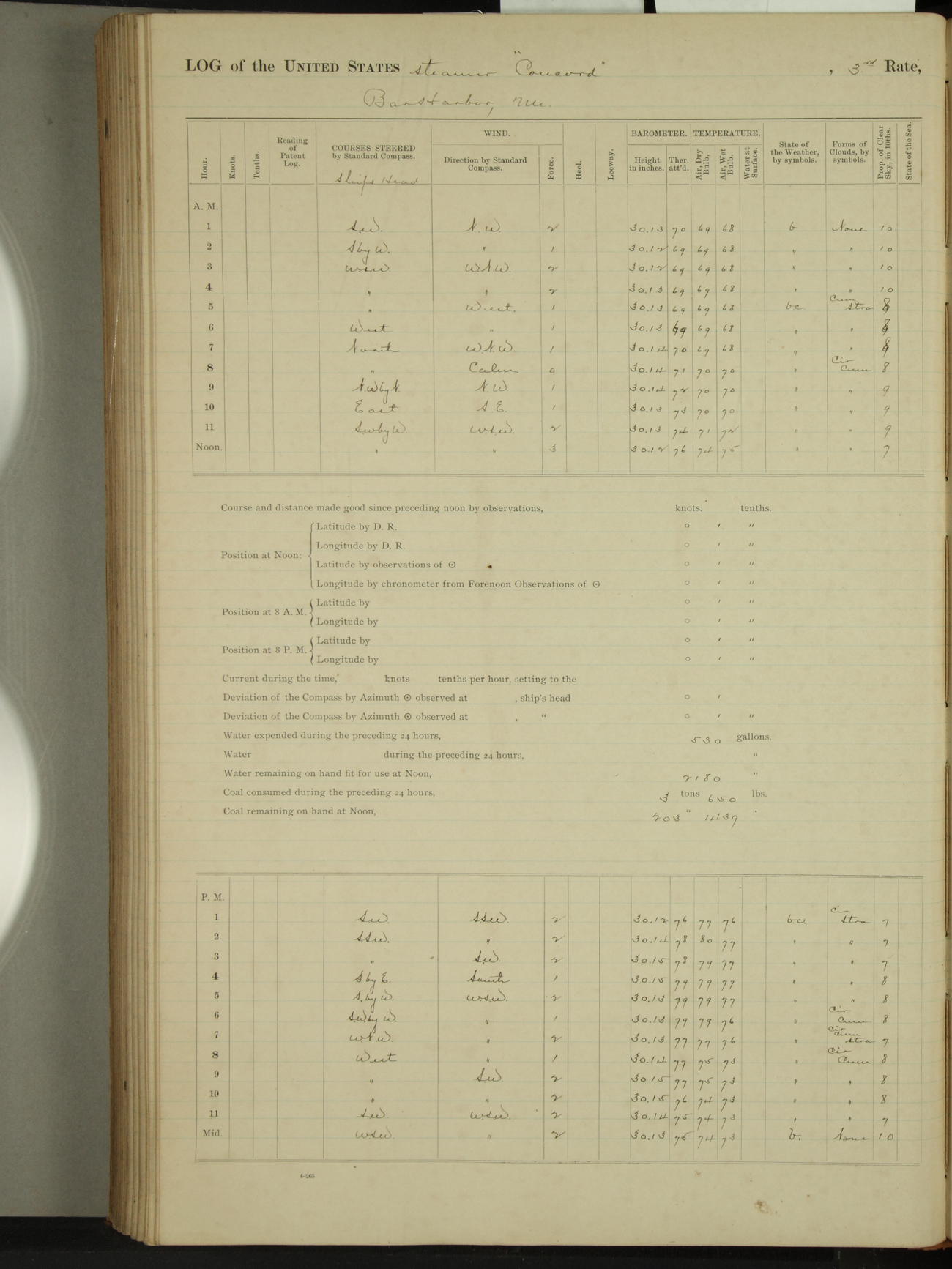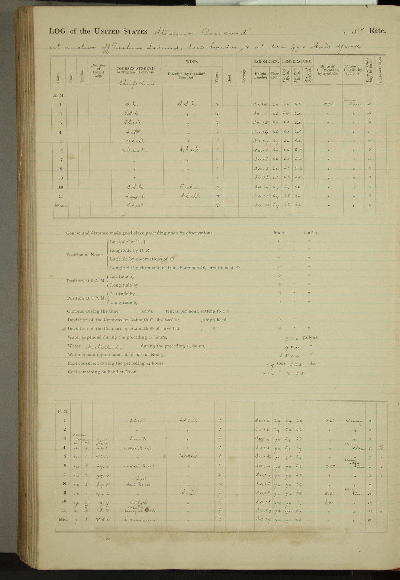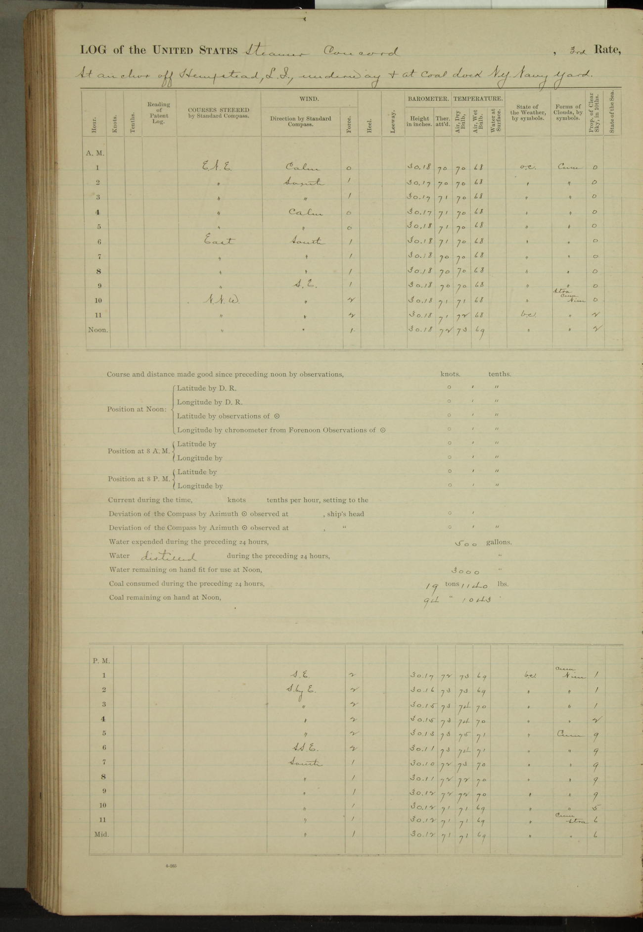 At 10:30 AM captain Joseph U Miller U.S.N. representing the Commandant of the Navy yard, officially turned this vessel over to the Commander Oliver A. Batcheller USN who, with the officers & crew on the Quarter deck read the order from the Navy Department detailing him to command this vessel: whereupon the U.S Str Concord was declared in commission and the colors & pennant were hoisted.