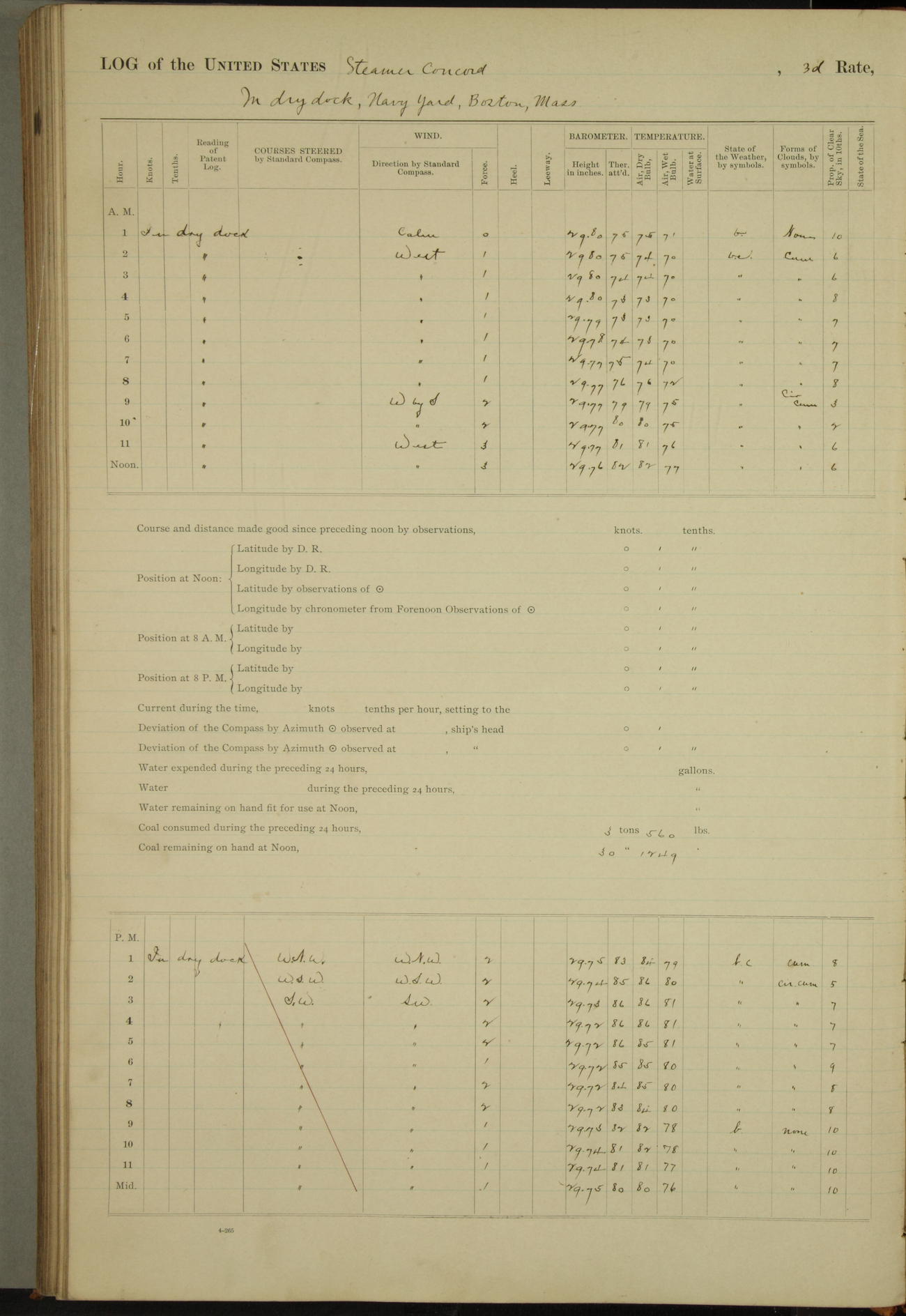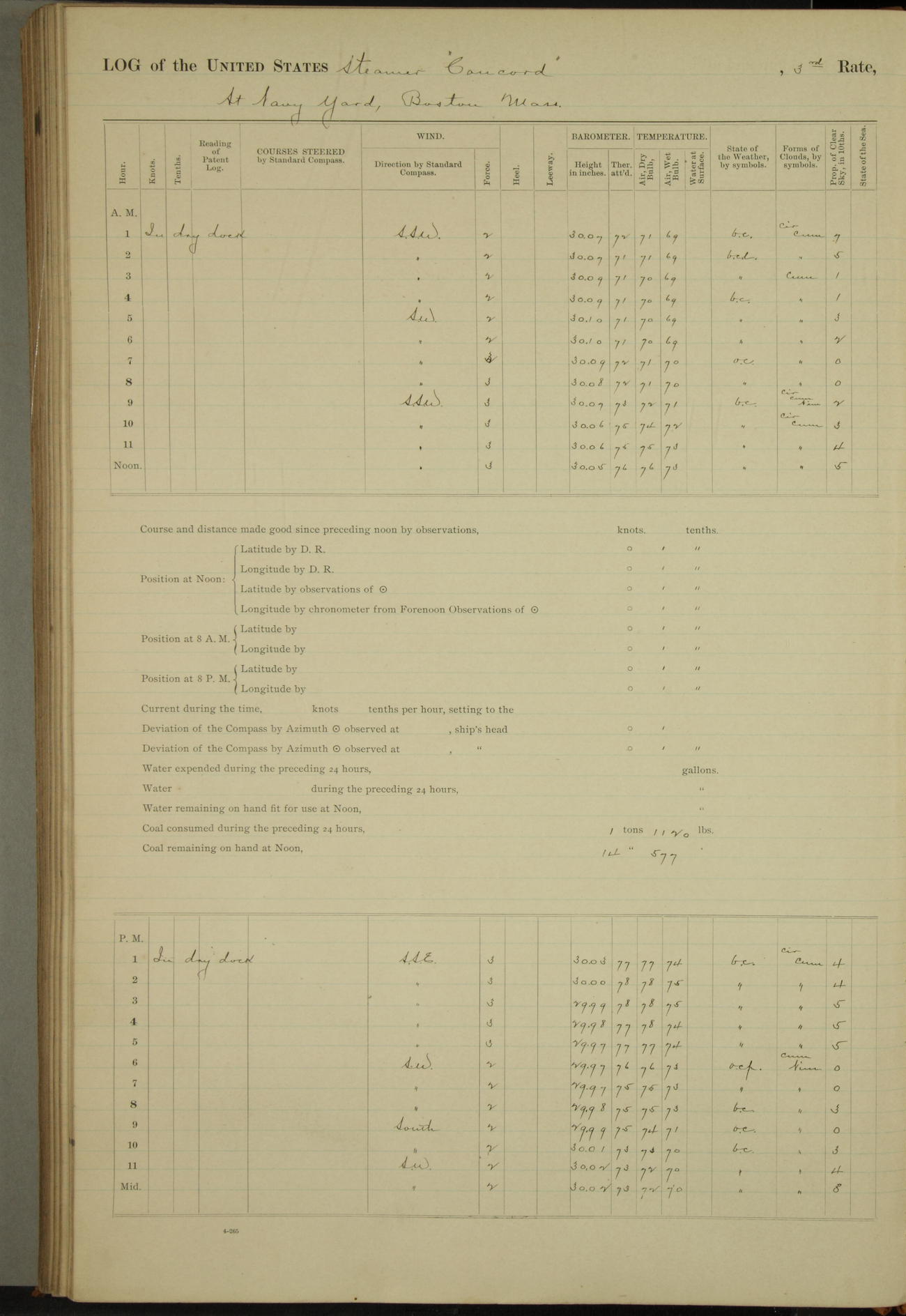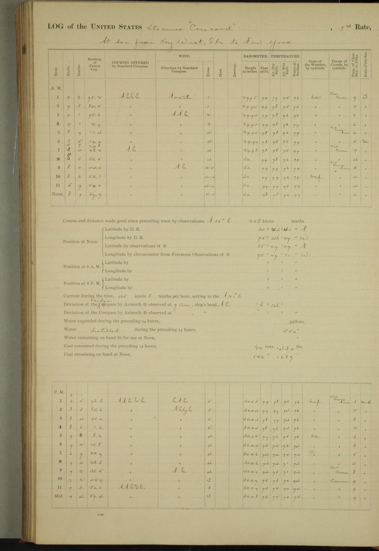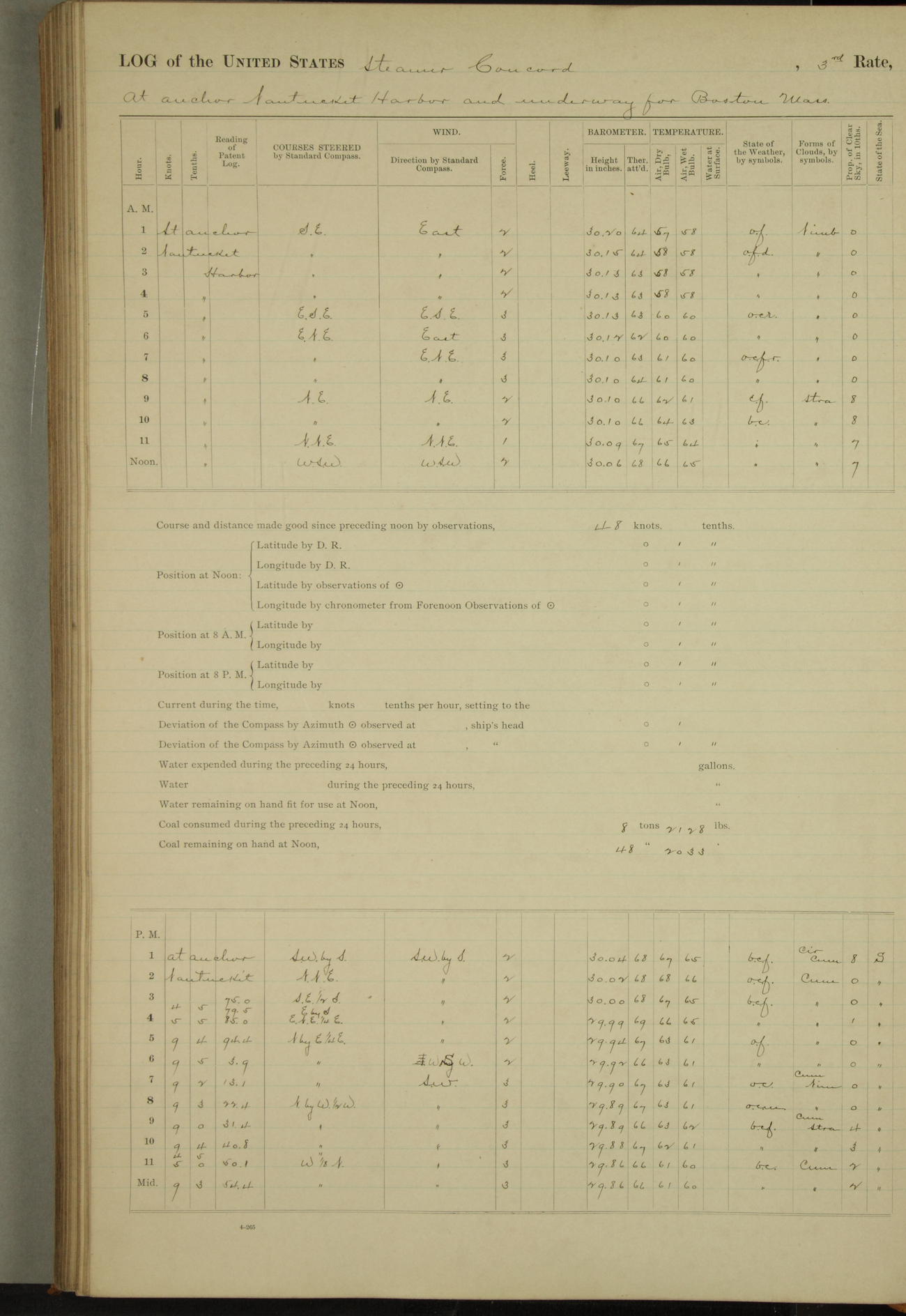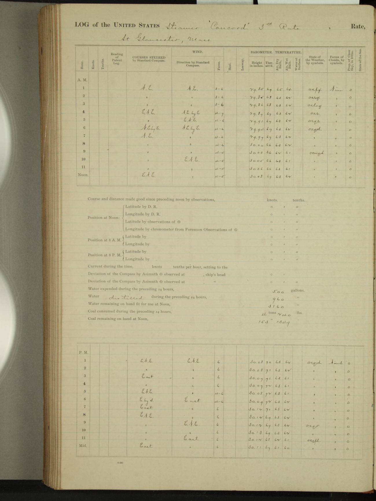 At 10:30 AM captain Joseph U Miller U.S.N. representing the Commandant of the Navy yard, officially turned this vessel over to the Commander Oliver A. Batcheller USN who, with the officers & crew on the Quarter deck read the order from the Navy Department detailing him to command this vessel: whereupon the U.S Str Concord was declared in commission and the colors & pennant were hoisted.