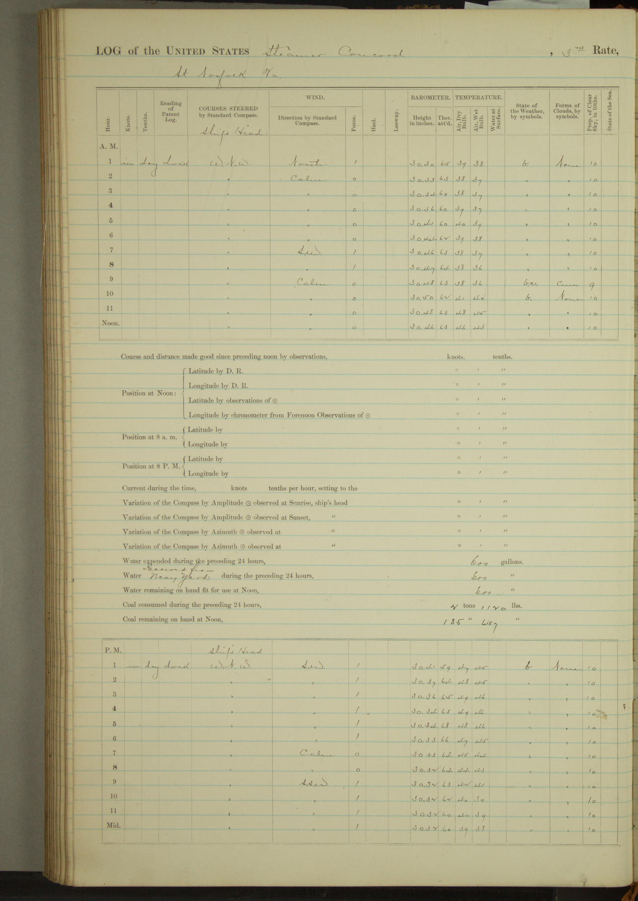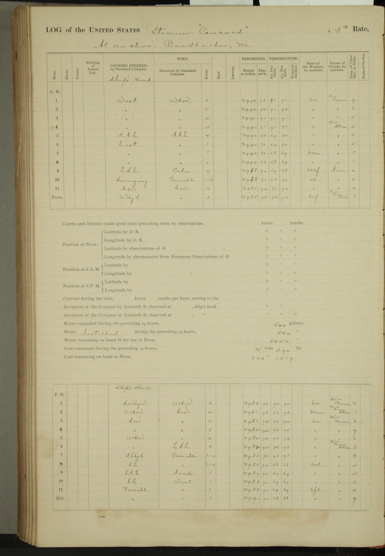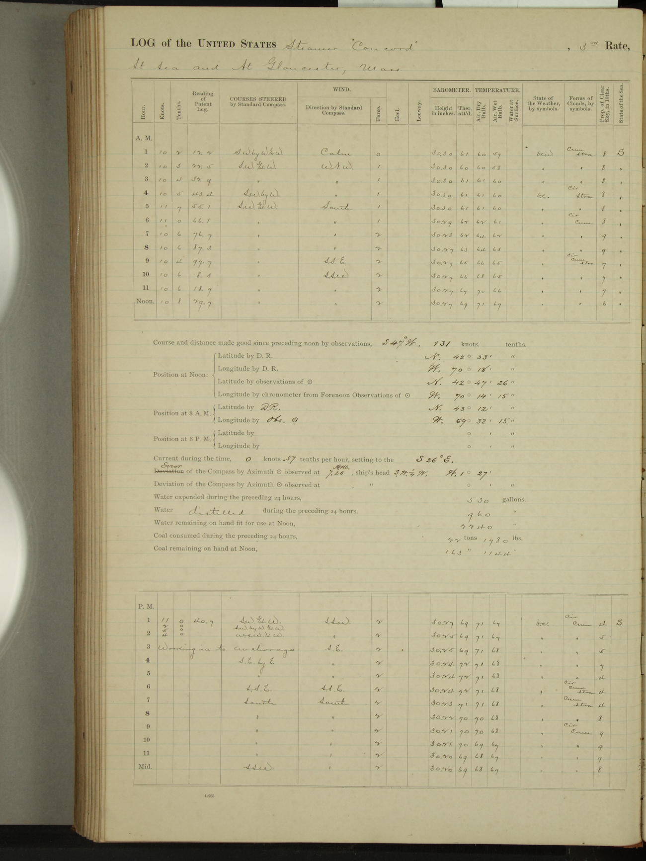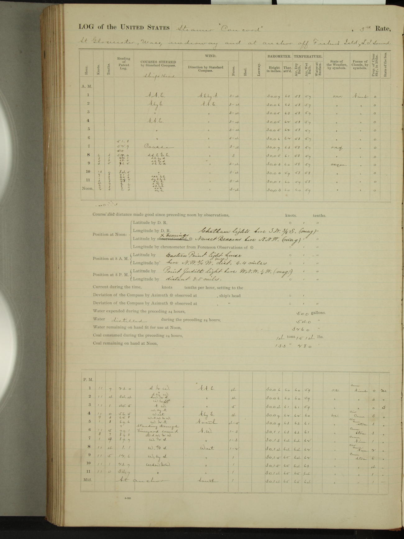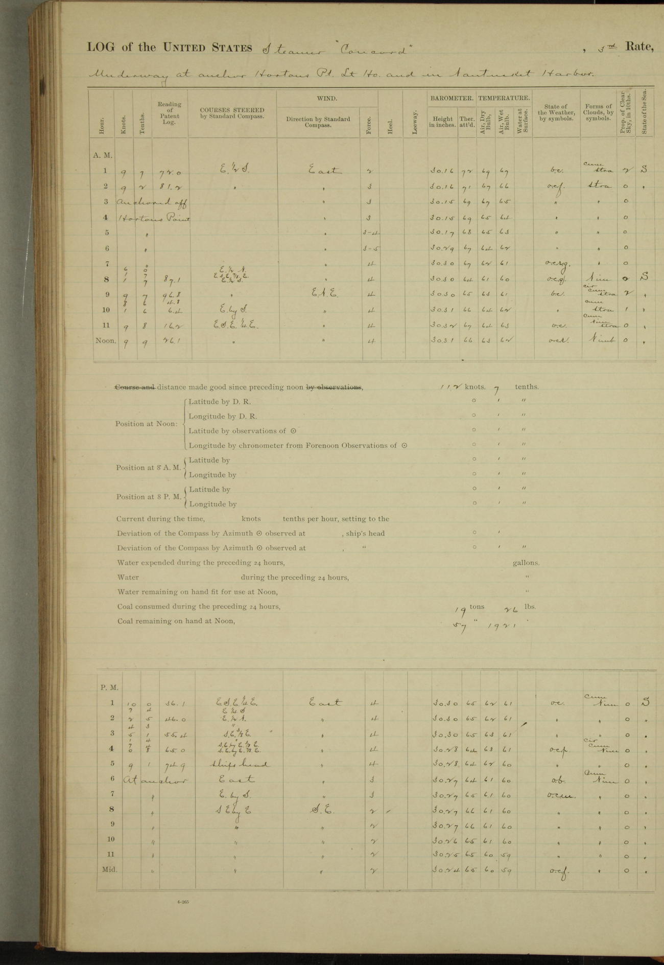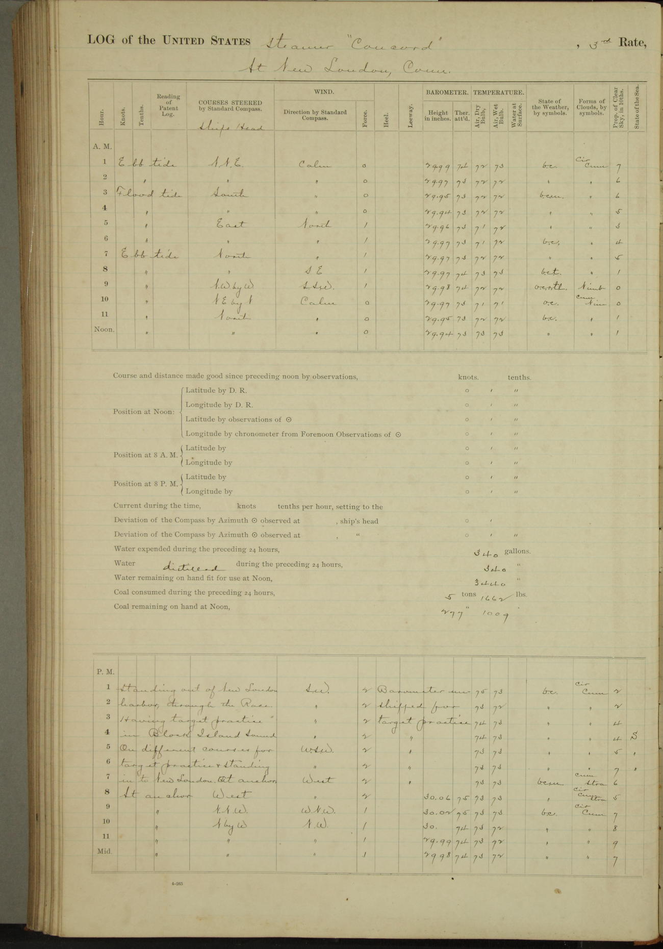 At 10:30 AM captain Joseph U Miller U.S.N. representing the Commandant of the Navy yard, officially turned this vessel over to the Commander Oliver A. Batcheller USN who, with the officers & crew on the Quarter deck read the order from the Navy Department detailing him to command this vessel: whereupon the U.S Str Concord was declared in commission and the colors & pennant were hoisted.