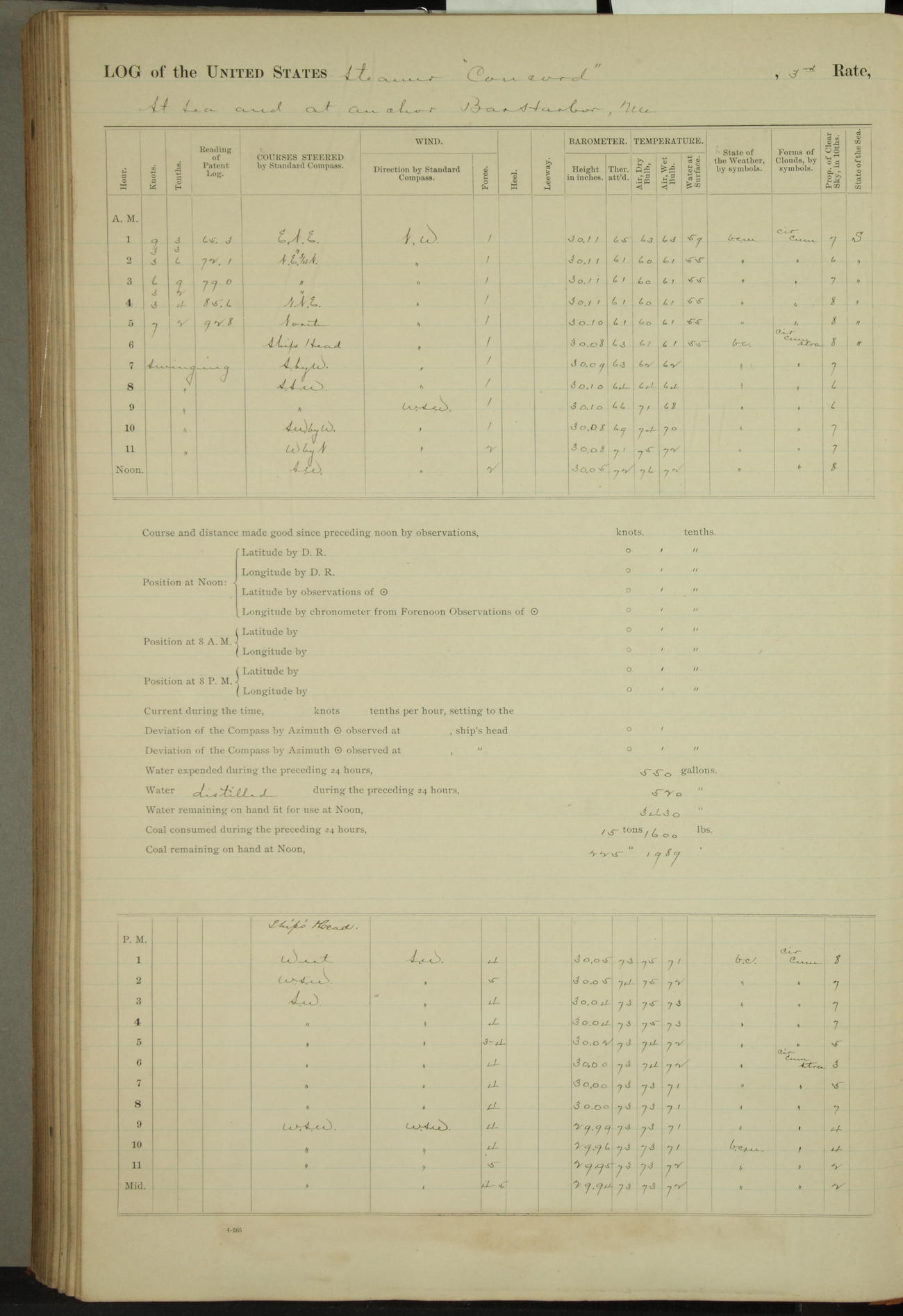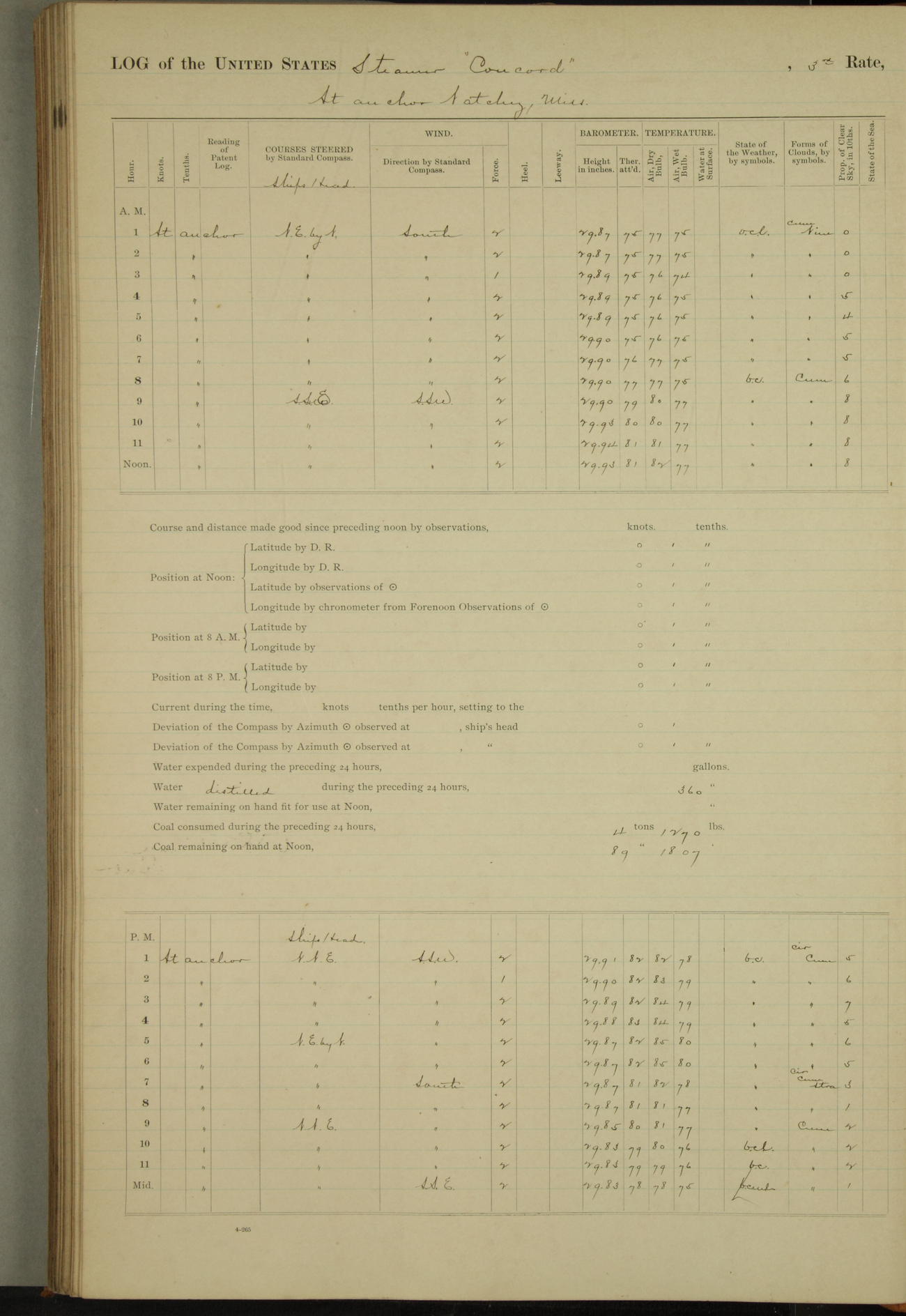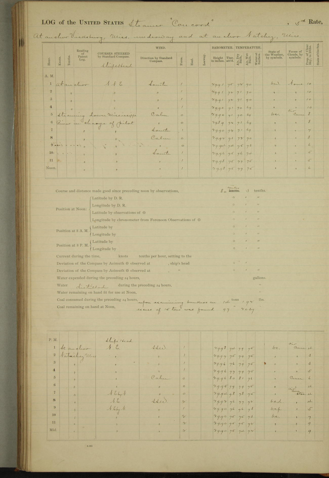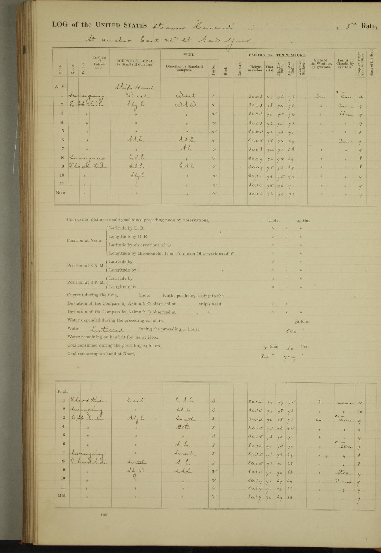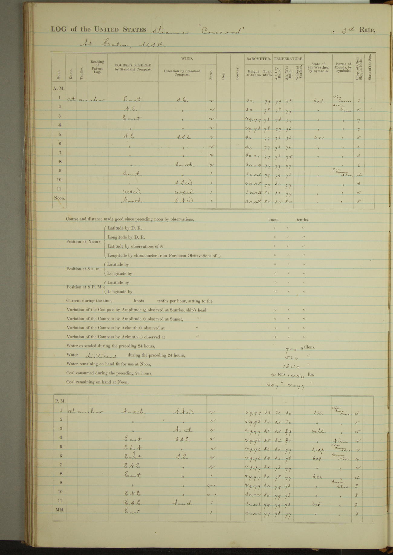 At 10:30 AM captain Joseph U Miller U.S.N. representing the Commandant of the Navy yard, officially turned this vessel over to the Commander Oliver A. Batcheller USN who, with the officers & crew on the Quarter deck read the order from the Navy Department detailing him to command this vessel: whereupon the U.S Str Concord was declared in commission and the colors & pennant were hoisted.