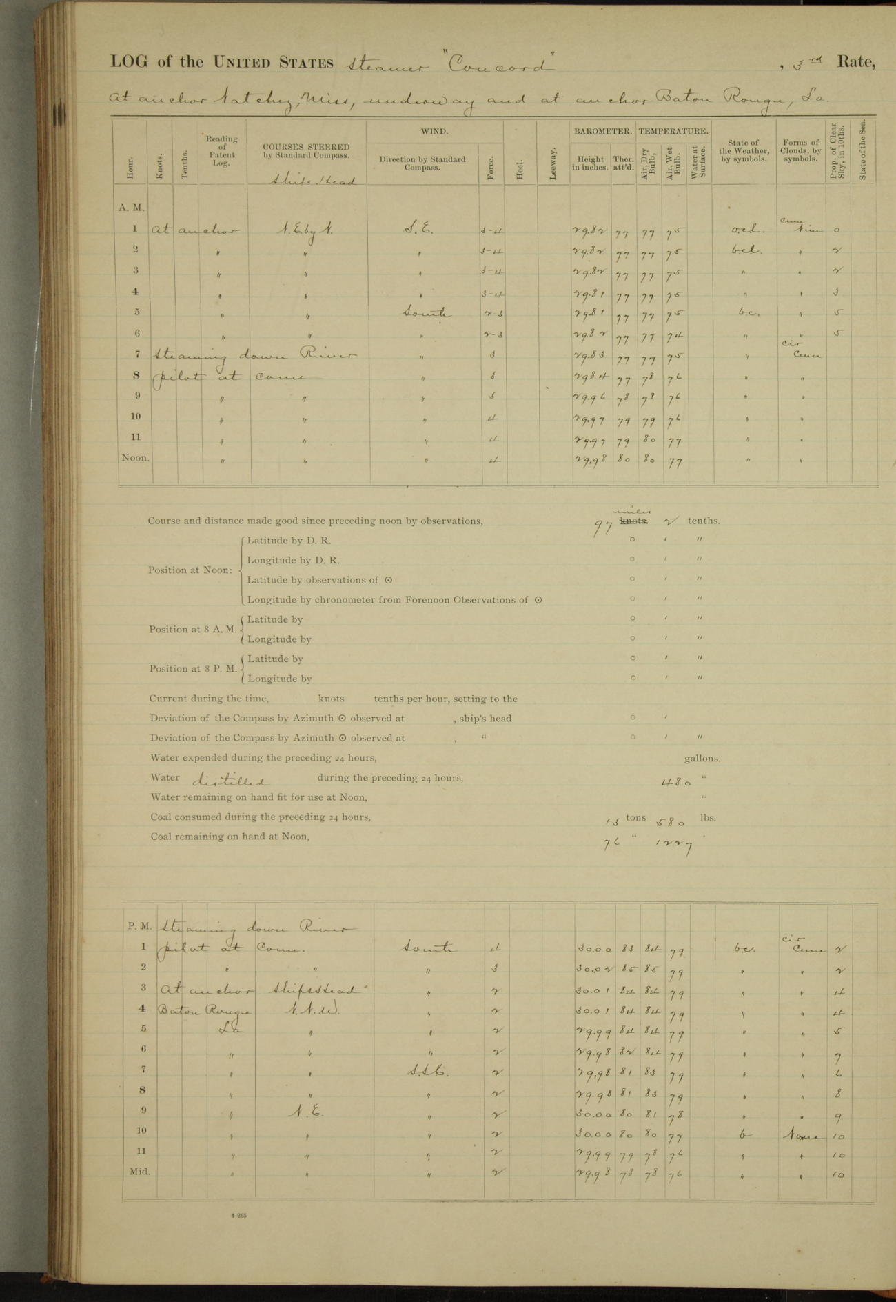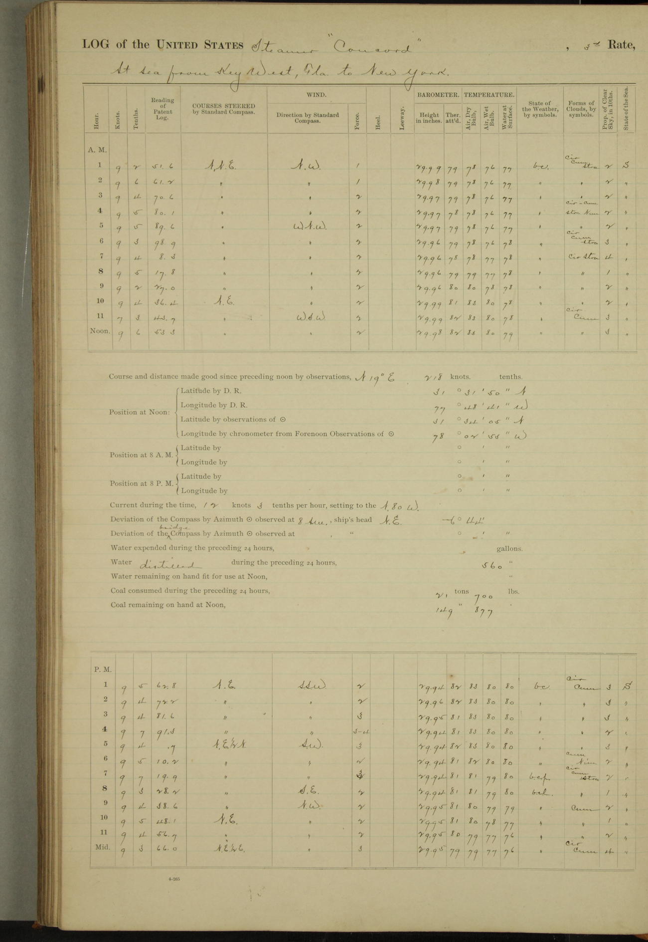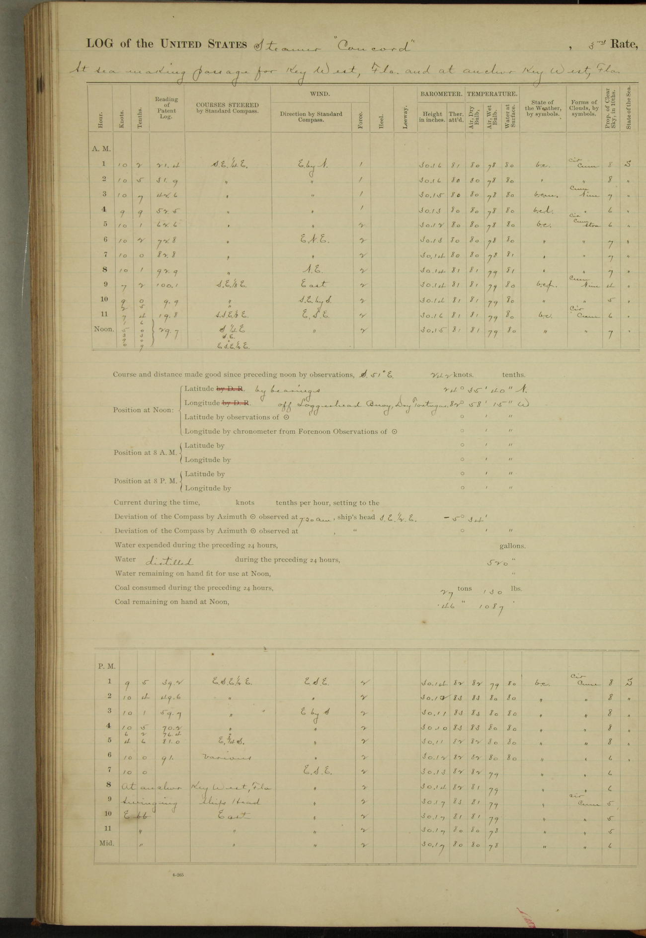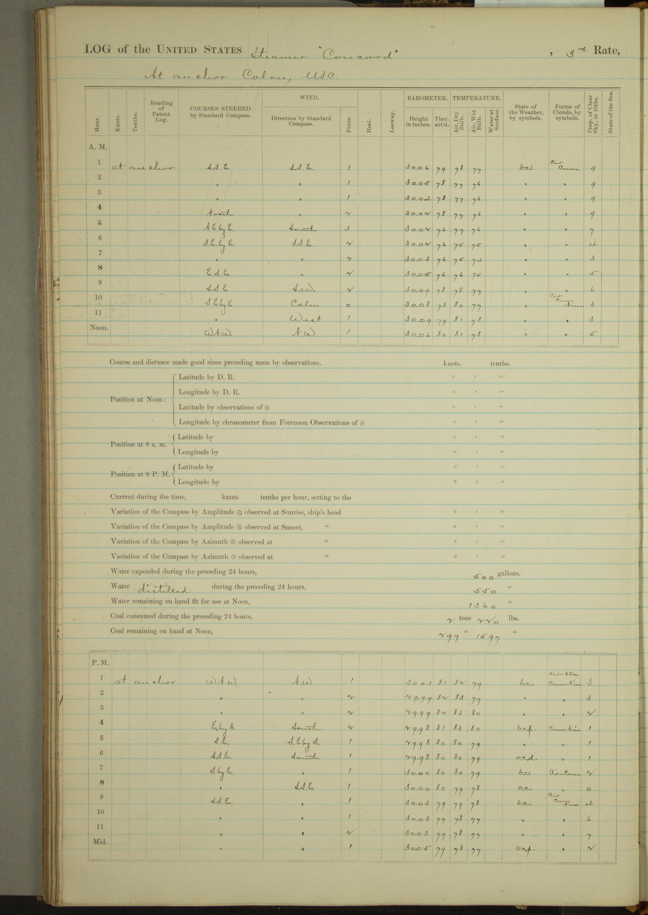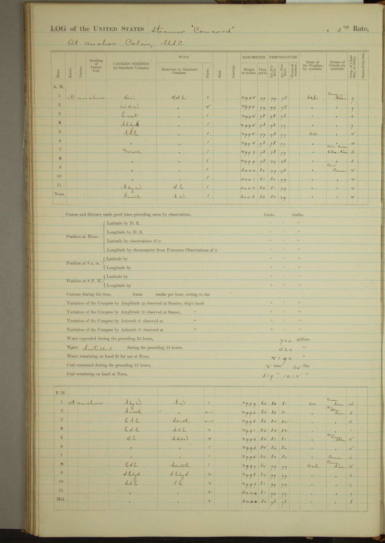 At 10:30 AM captain Joseph U Miller U.S.N. representing the Commandant of the Navy yard, officially turned this vessel over to the Commander Oliver A. Batcheller USN who, with the officers & crew on the Quarter deck read the order from the Navy Department detailing him to command this vessel: whereupon the U.S Str Concord was declared in commission and the colors & pennant were hoisted.