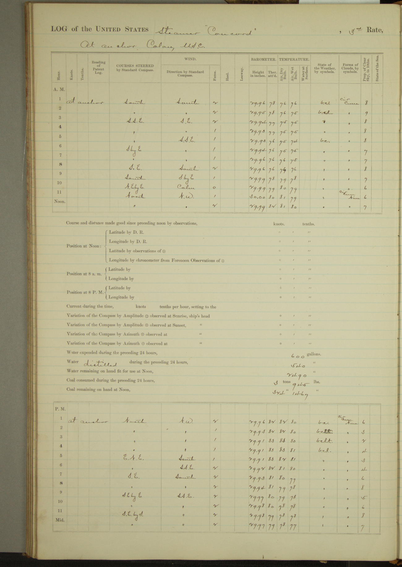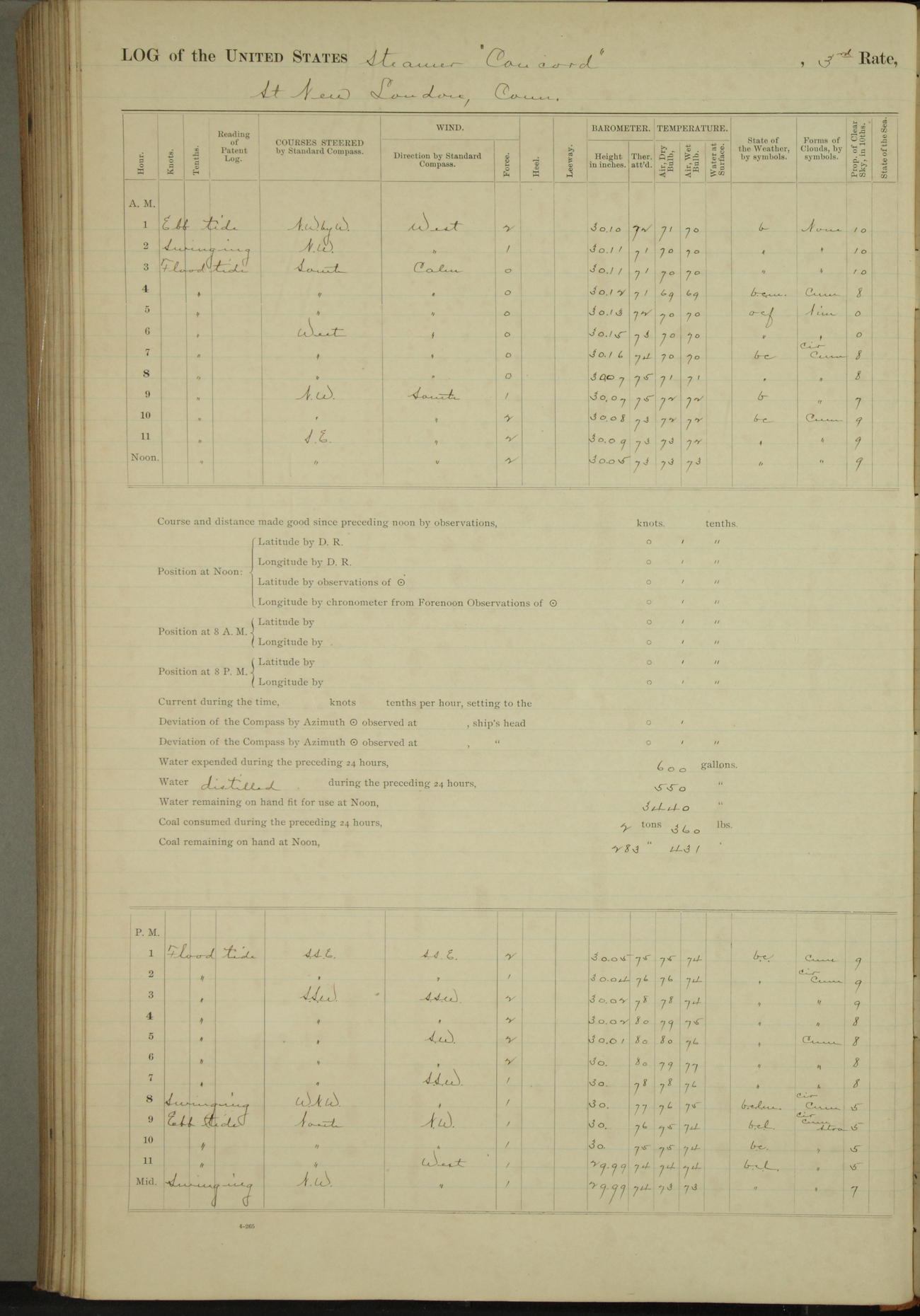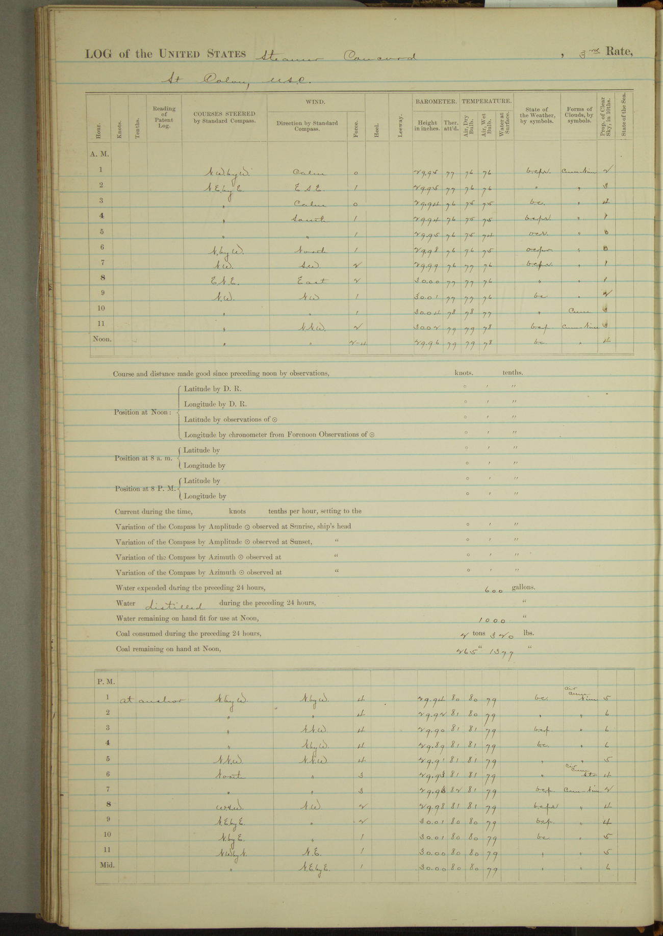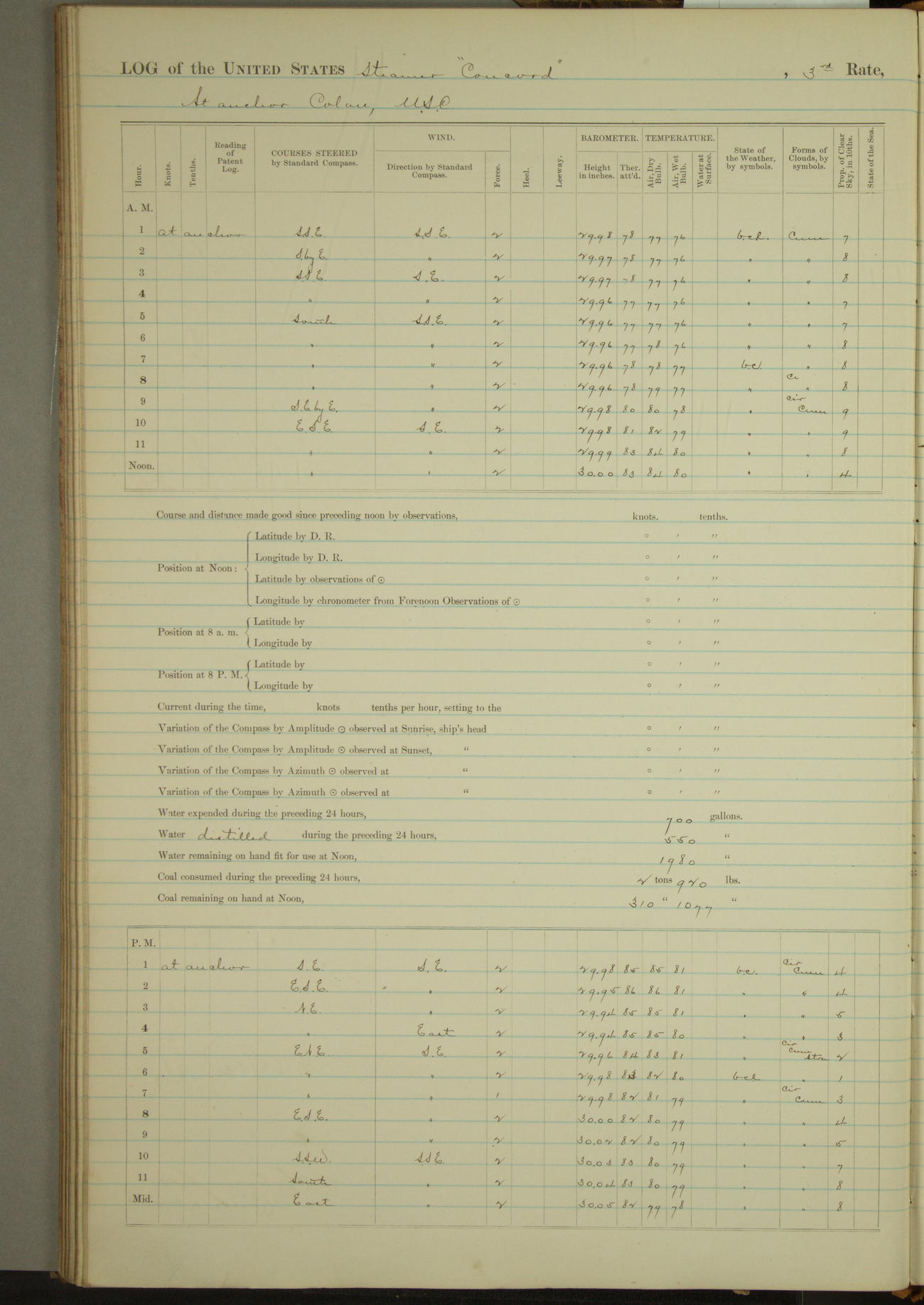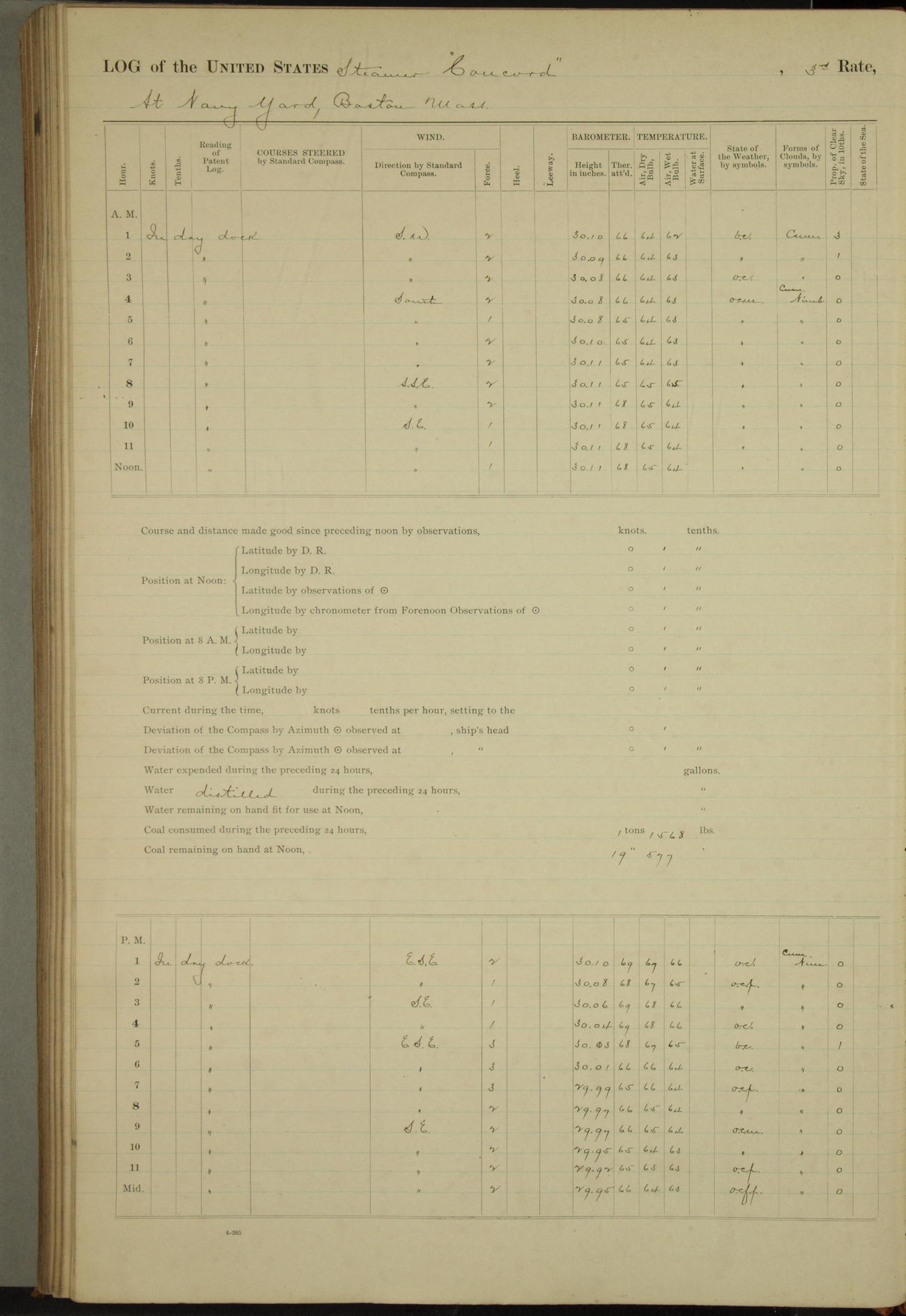 At 10:30 AM captain Joseph U Miller U.S.N. representing the Commandant of the Navy yard, officially turned this vessel over to the Commander Oliver A. Batcheller USN who, with the officers & crew on the Quarter deck read the order from the Navy Department detailing him to command this vessel: whereupon the U.S Str Concord was declared in commission and the colors & pennant were hoisted.