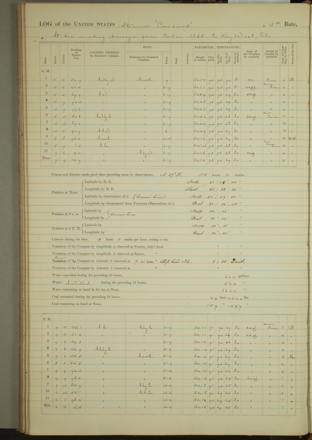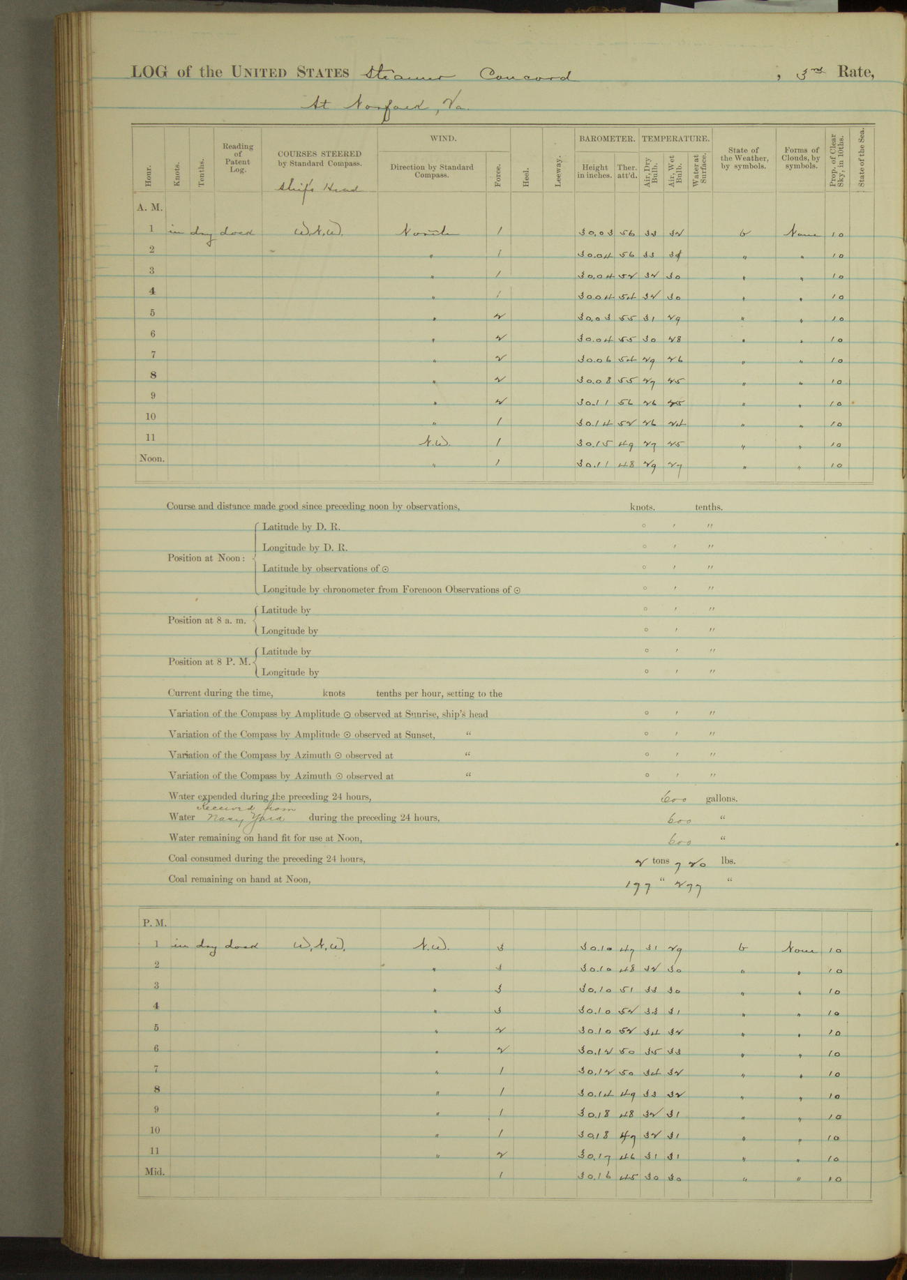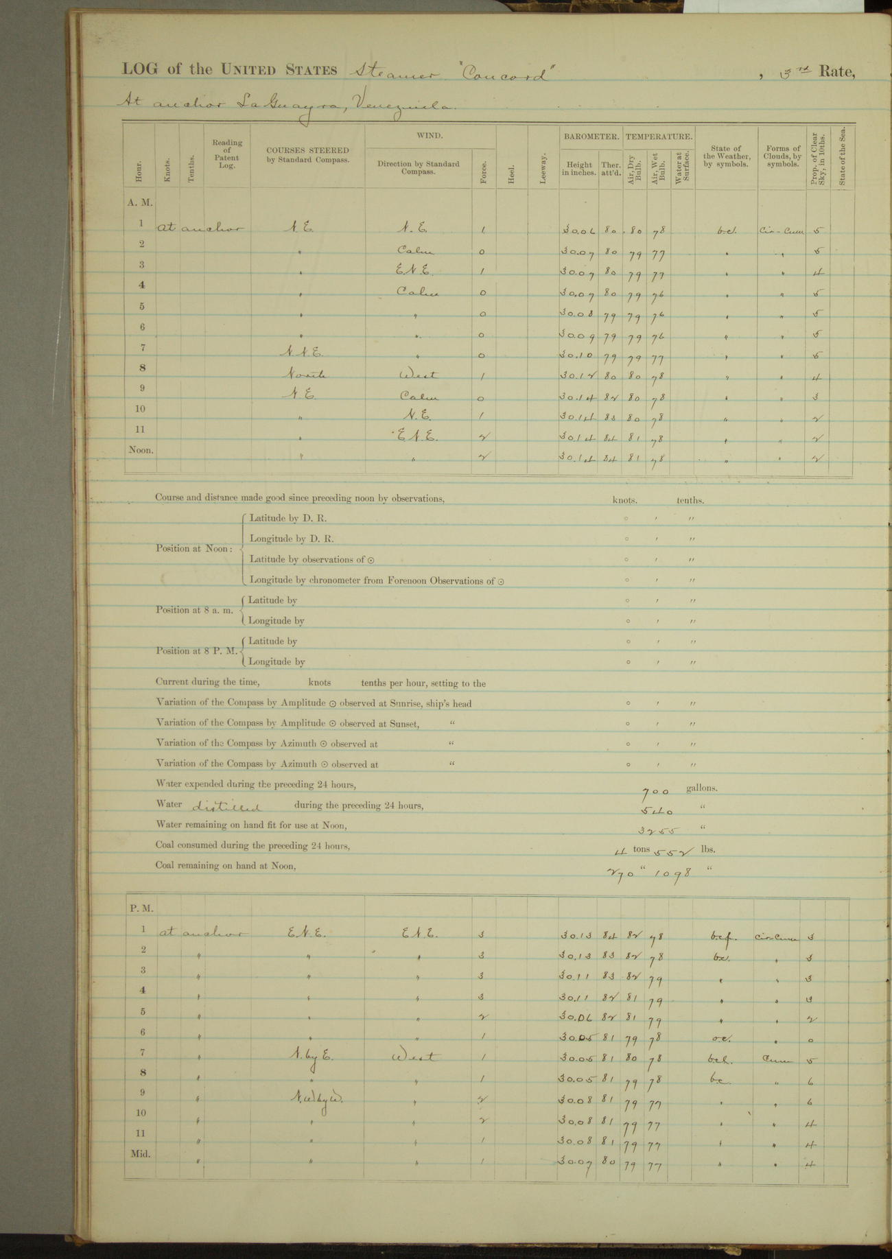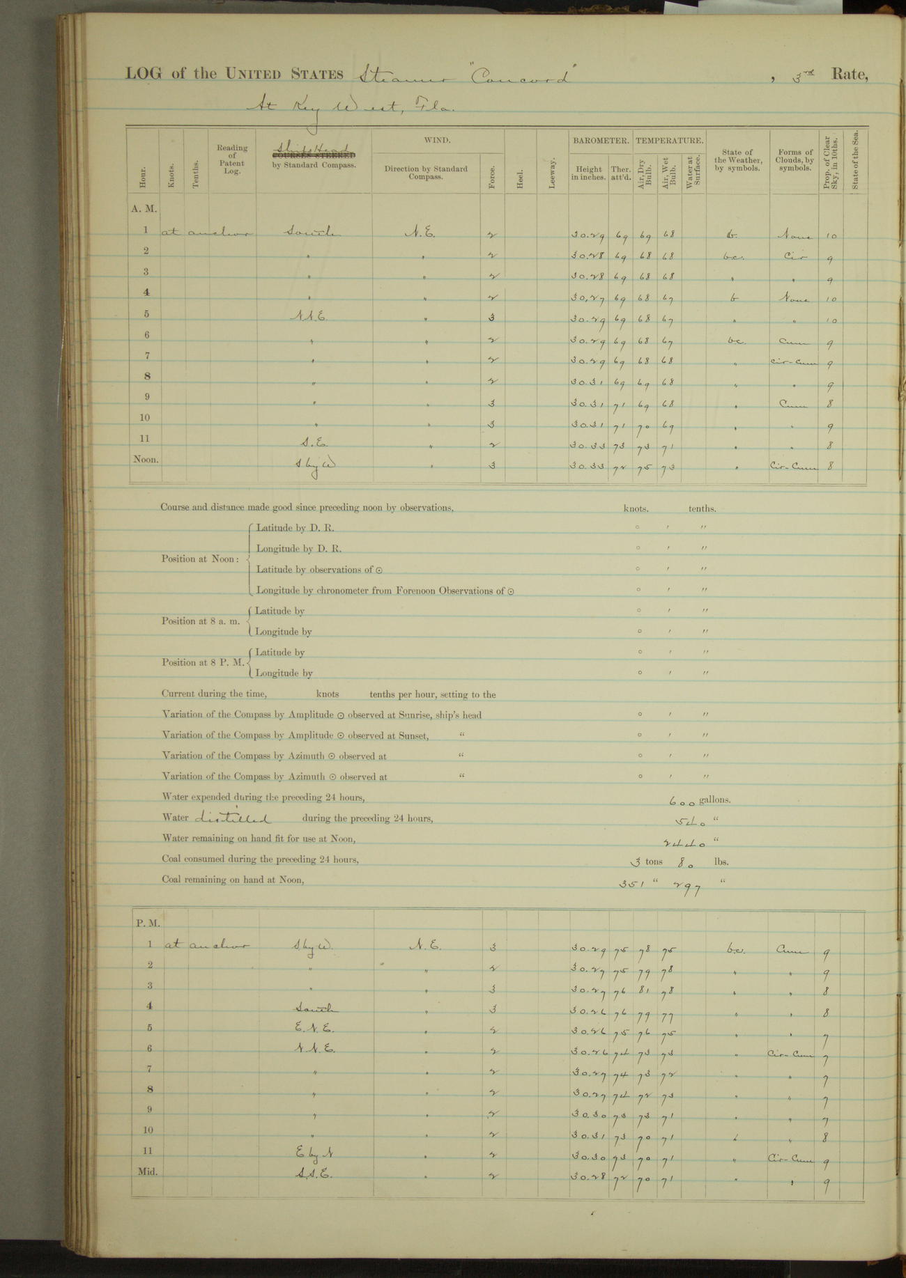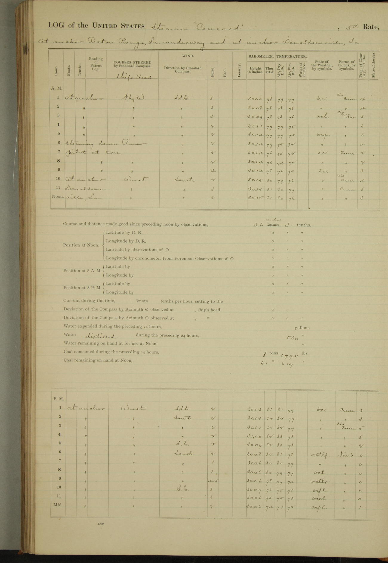 At 10:30 AM captain Joseph U Miller U.S.N. representing the Commandant of the Navy yard, officially turned this vessel over to the Commander Oliver A. Batcheller USN who, with the officers & crew on the Quarter deck read the order from the Navy Department detailing him to command this vessel: whereupon the U.S Str Concord was declared in commission and the colors & pennant were hoisted.