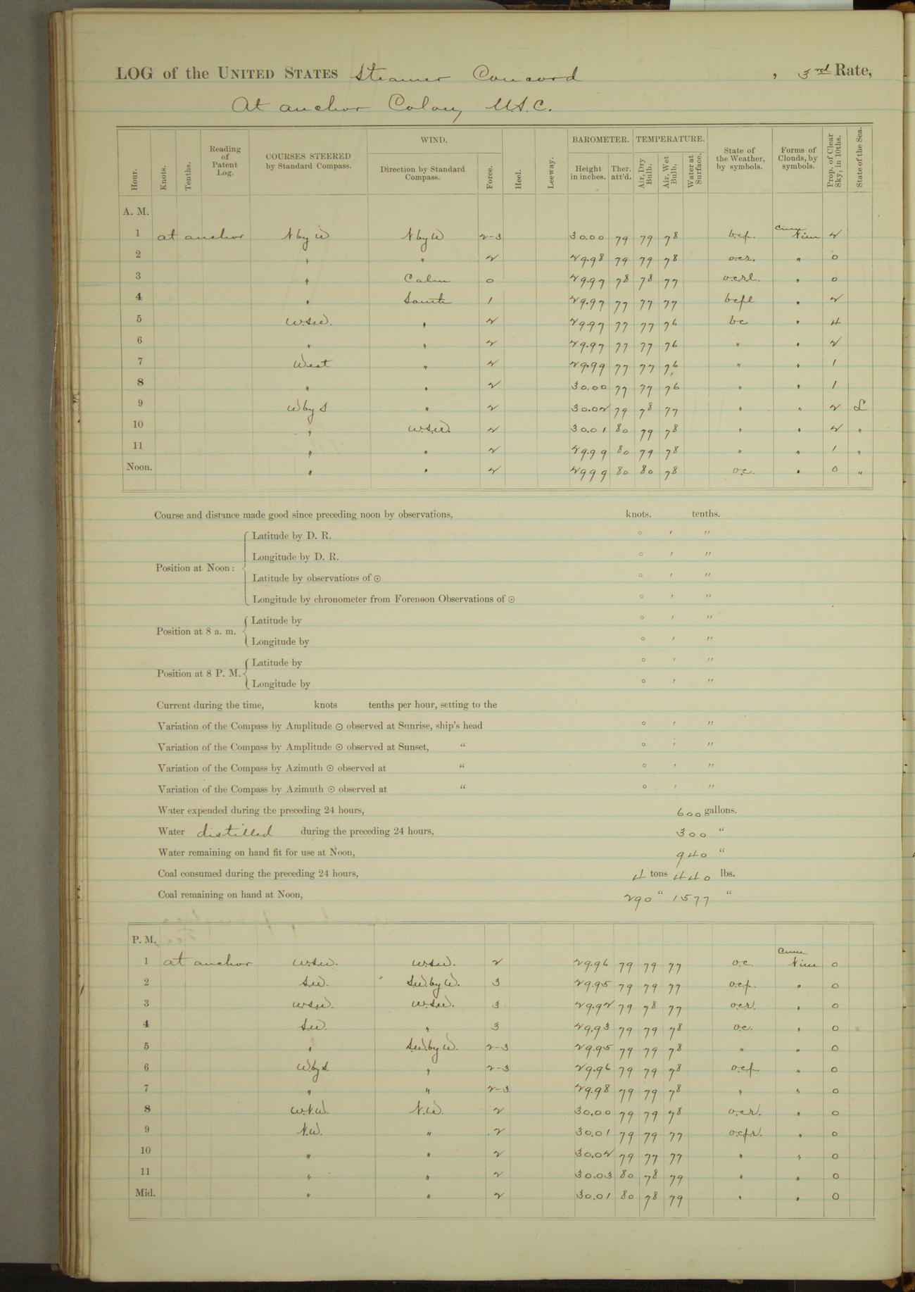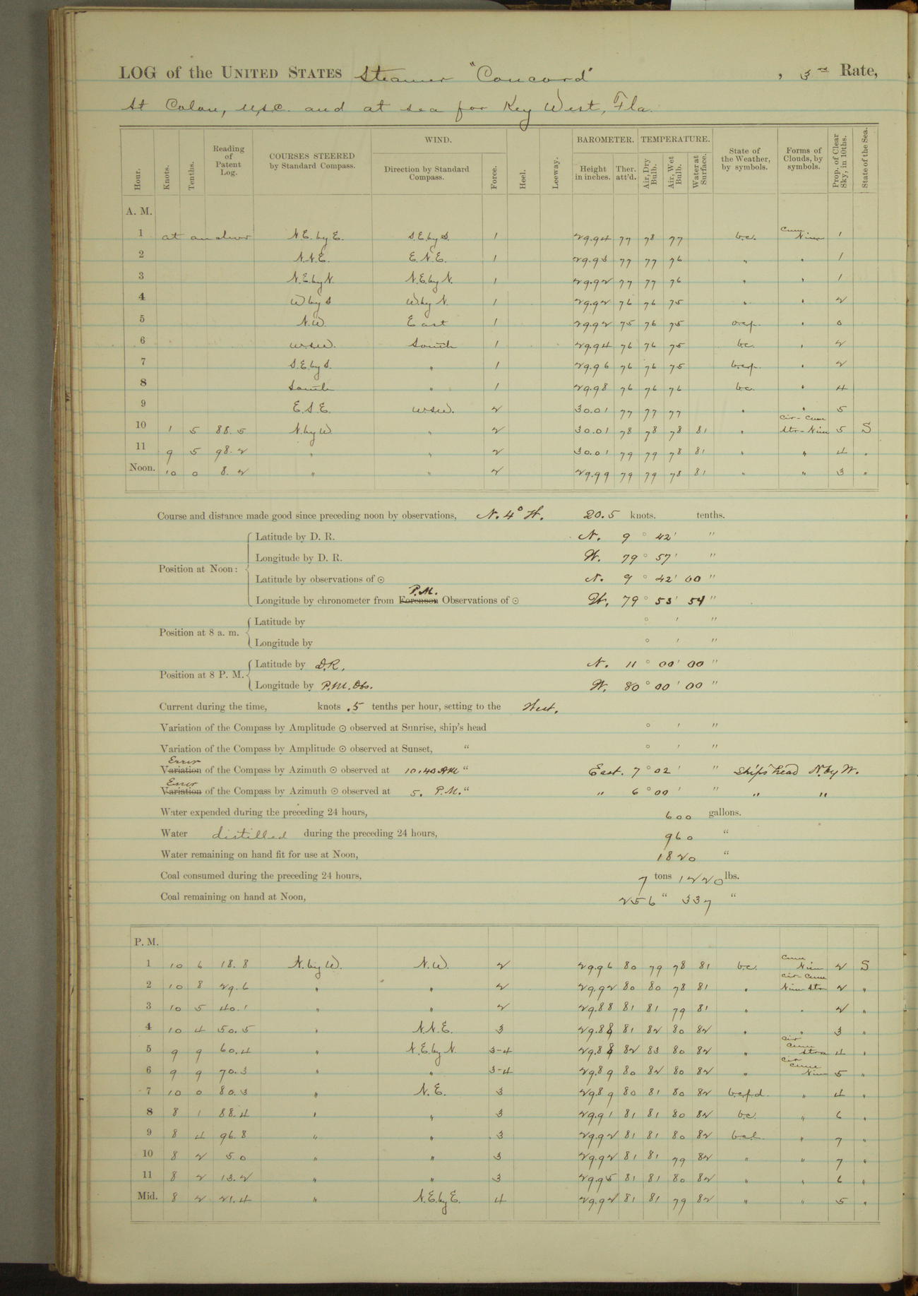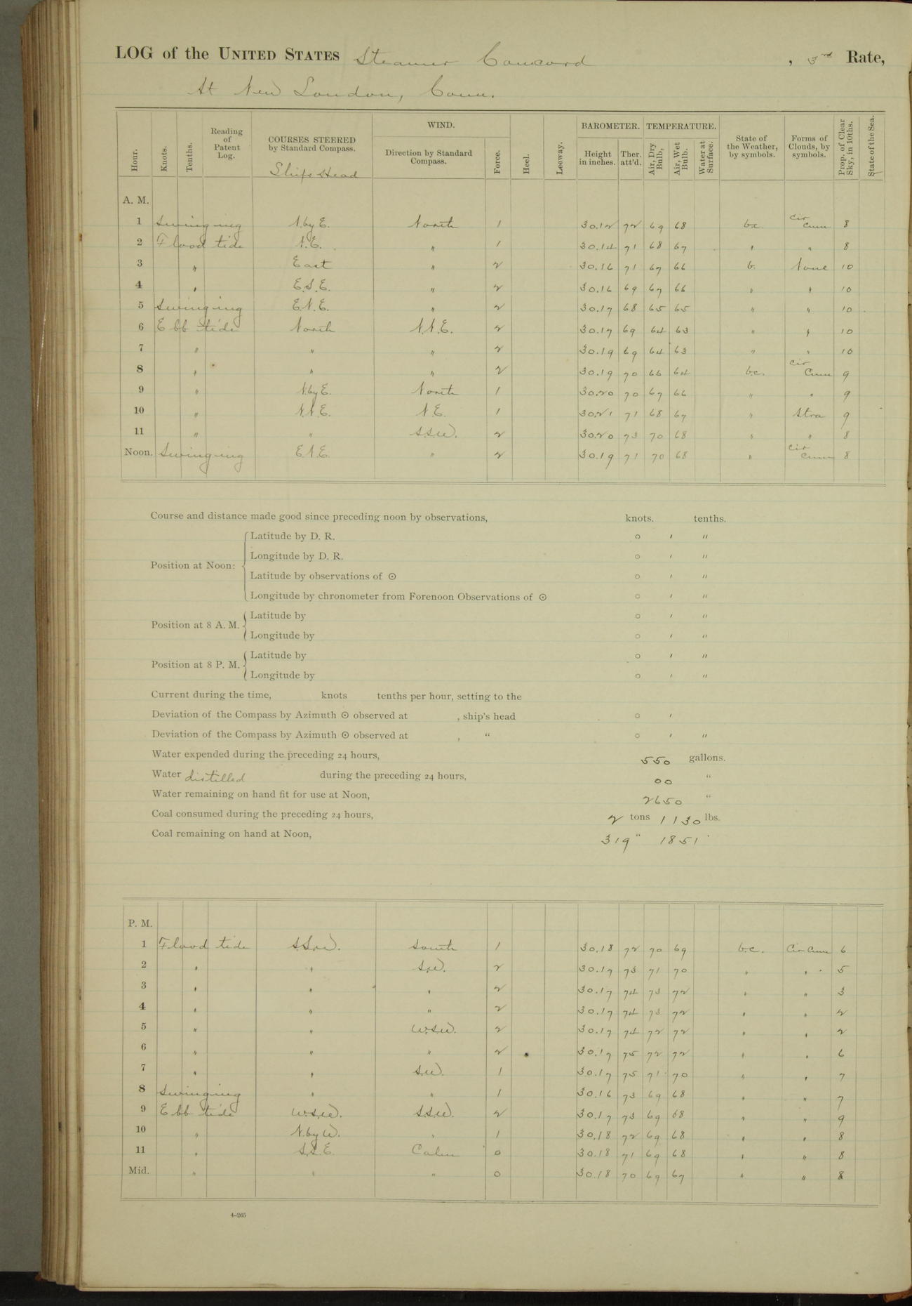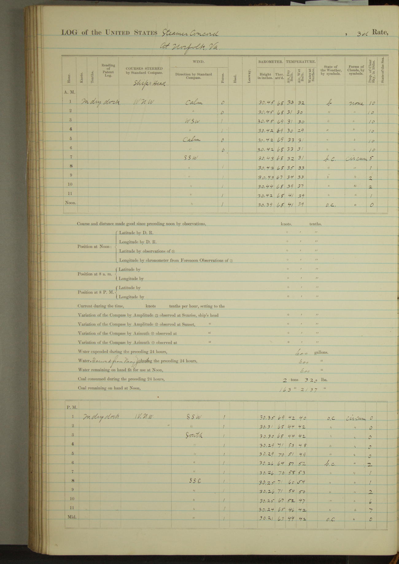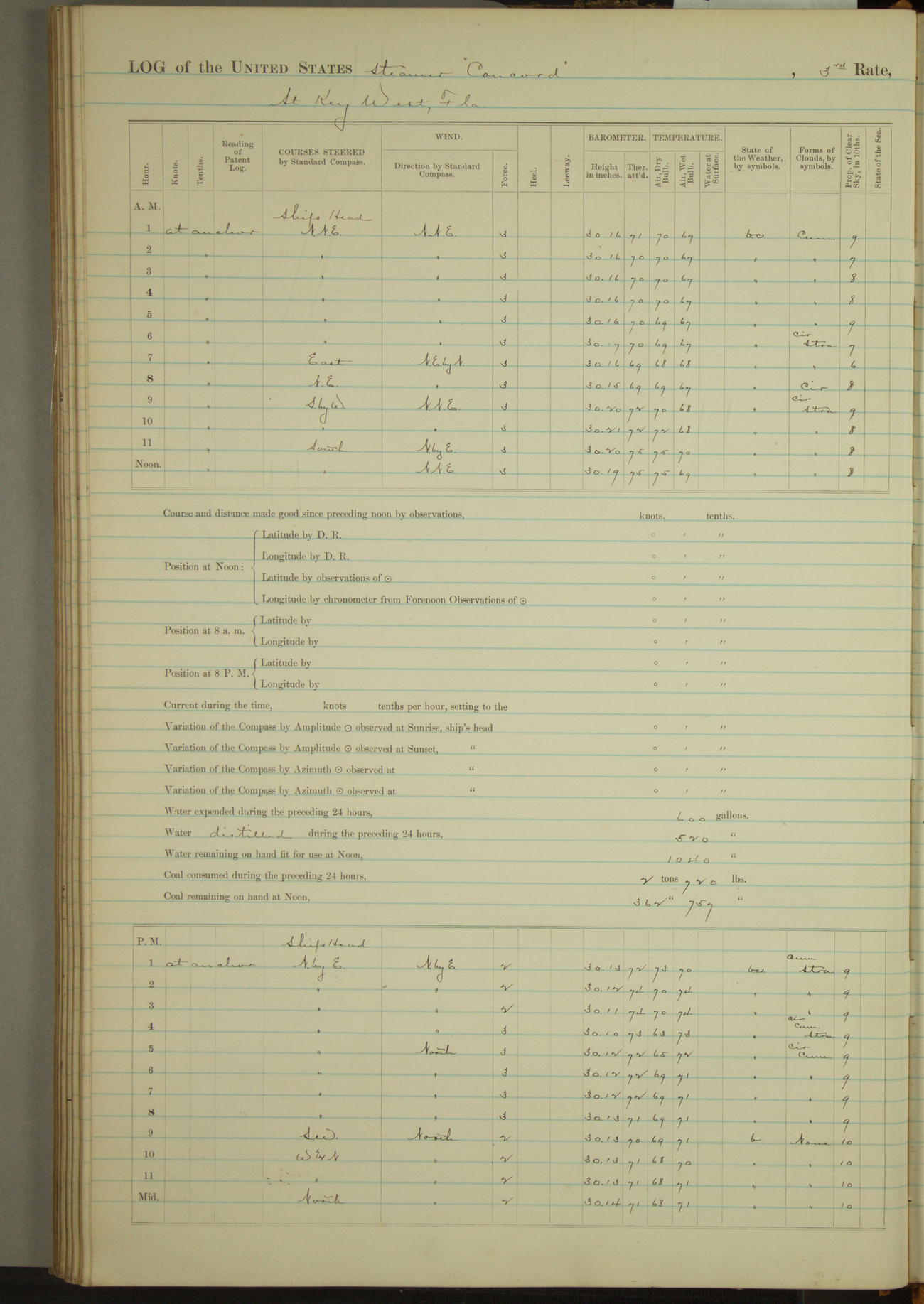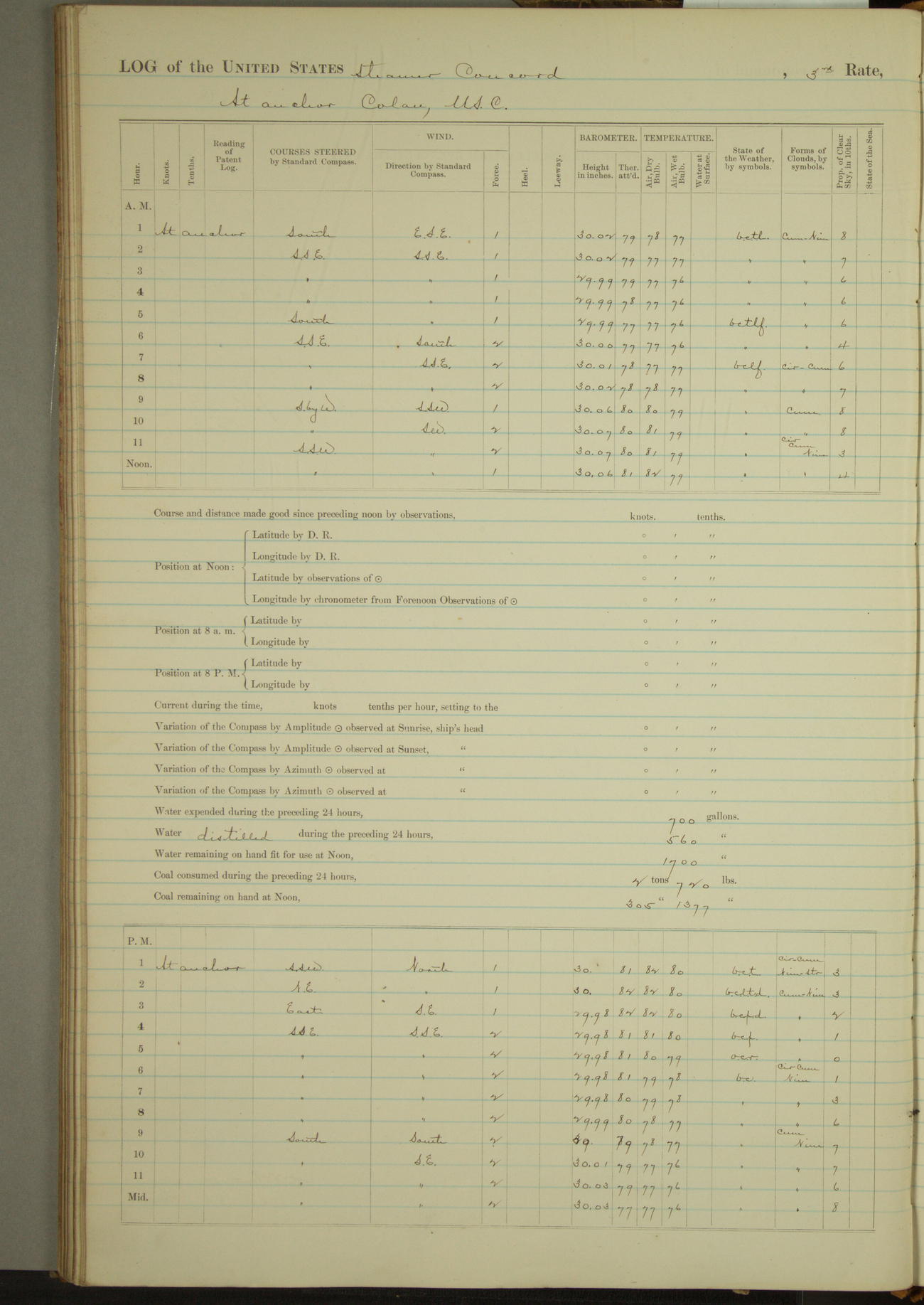 At 10:30 AM captain Joseph U Miller U.S.N. representing the Commandant of the Navy yard, officially turned this vessel over to the Commander Oliver A. Batcheller USN who, with the officers & crew on the Quarter deck read the order from the Navy Department detailing him to command this vessel: whereupon the U.S Str Concord was declared in commission and the colors & pennant were hoisted.
