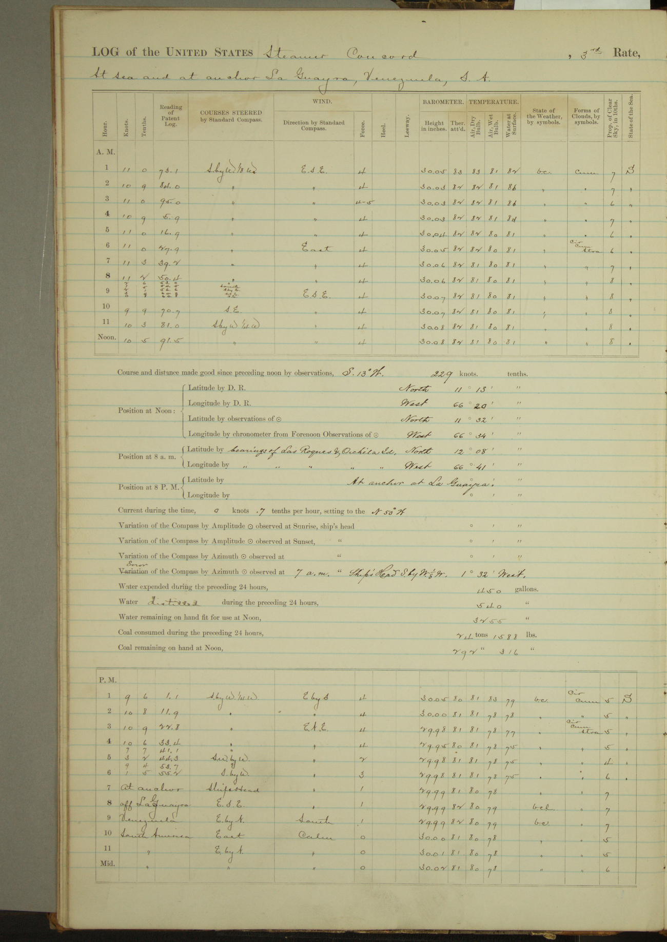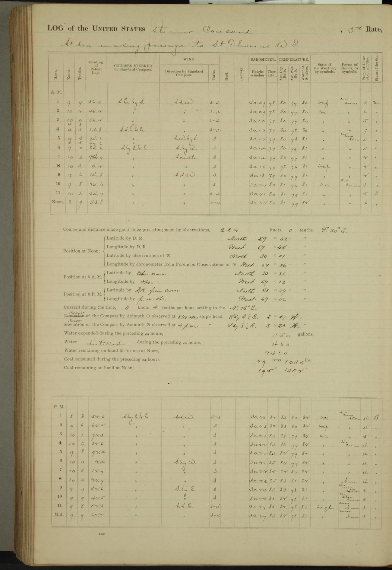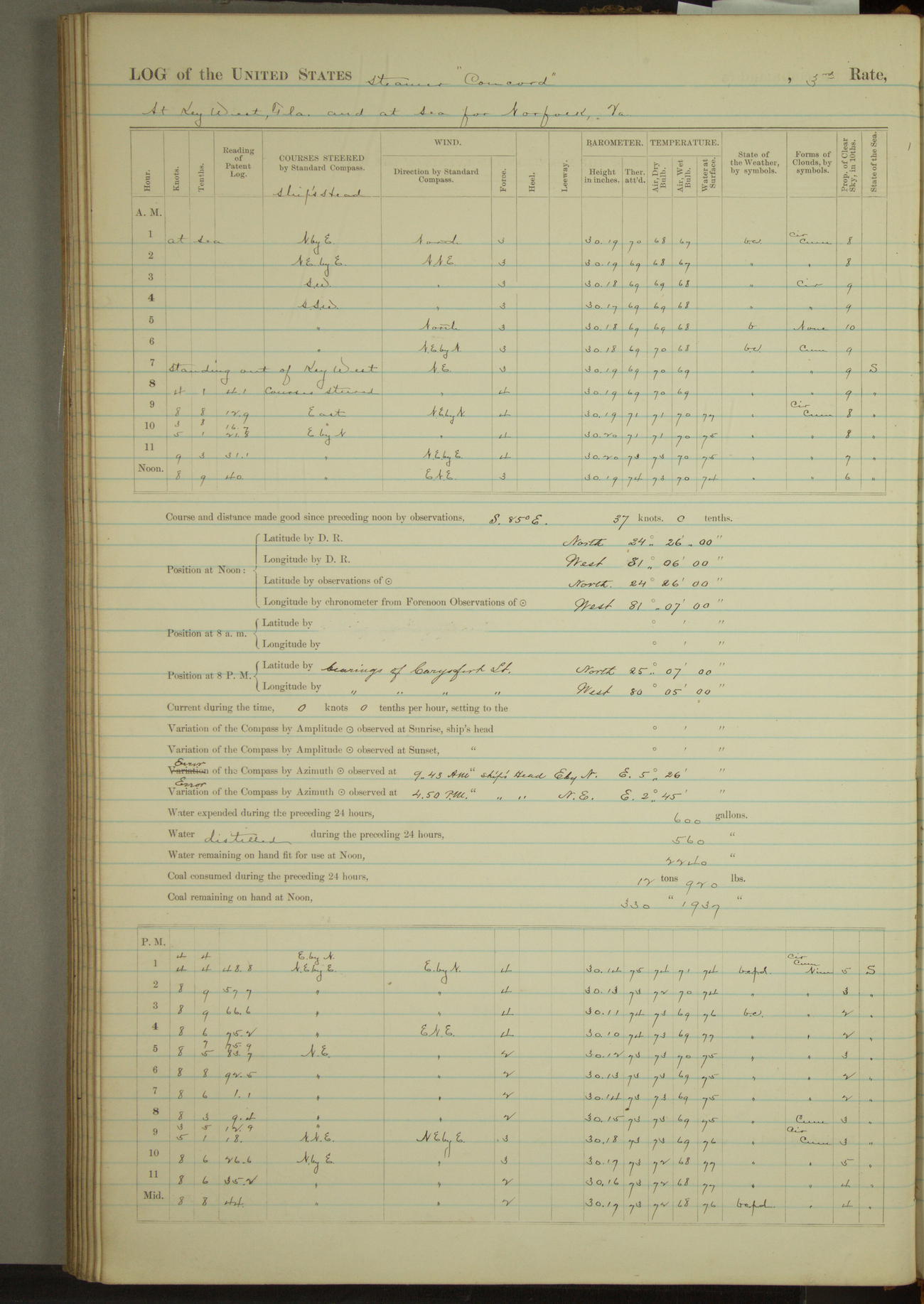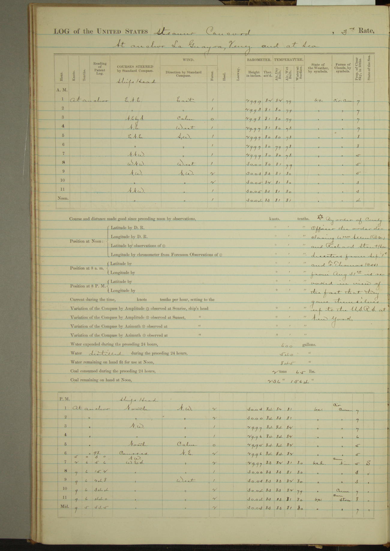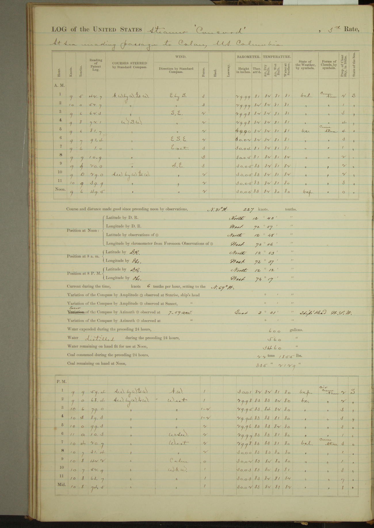 At 10:30 AM captain Joseph U Miller U.S.N. representing the Commandant of the Navy yard, officially turned this vessel over to the Commander Oliver A. Batcheller USN who, with the officers & crew on the Quarter deck read the order from the Navy Department detailing him to command this vessel: whereupon the U.S Str Concord was declared in commission and the colors & pennant were hoisted.