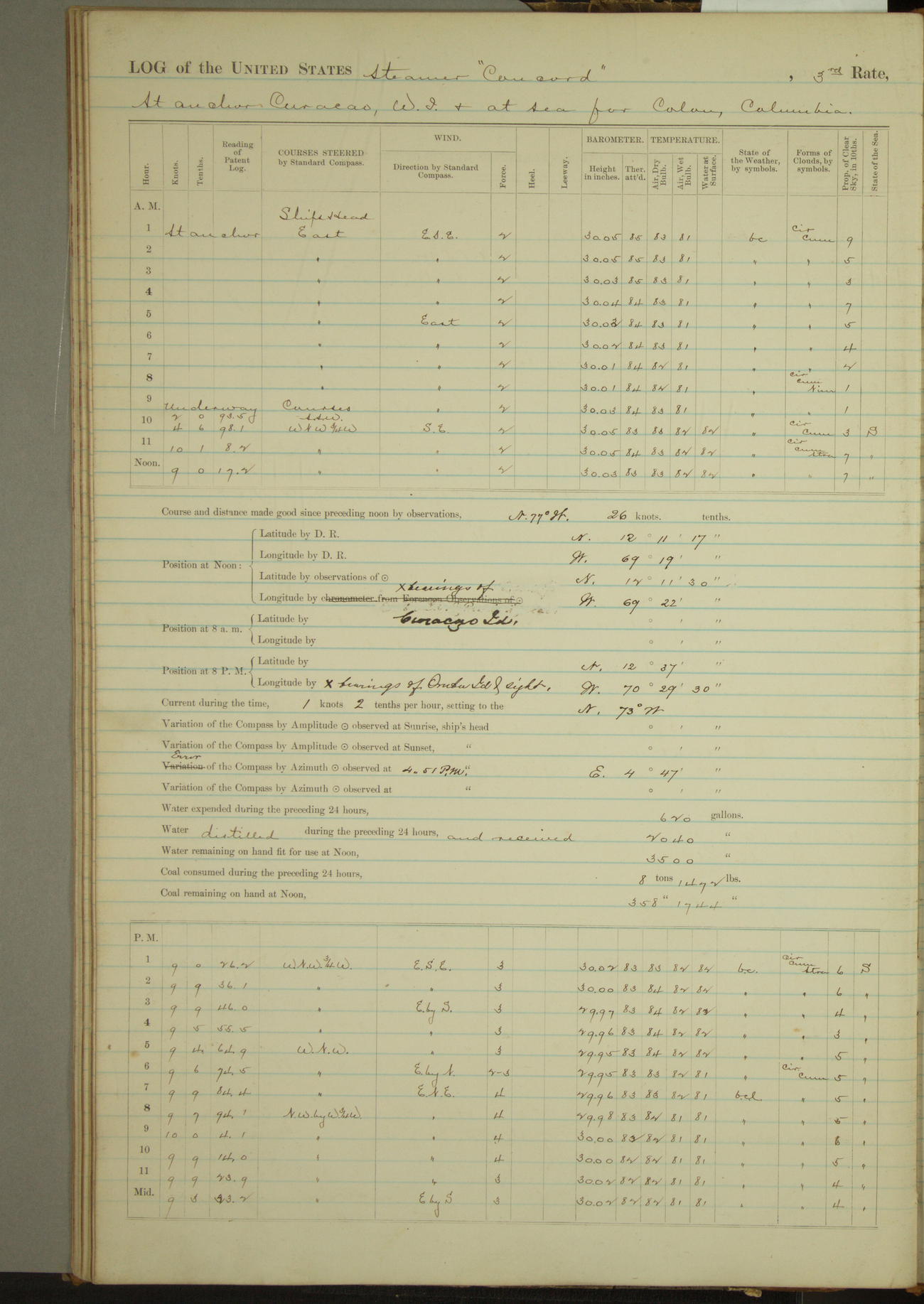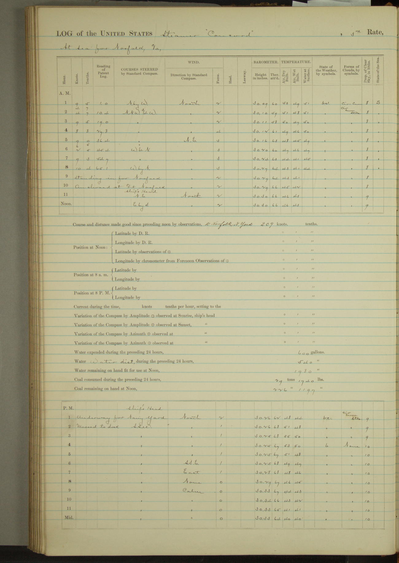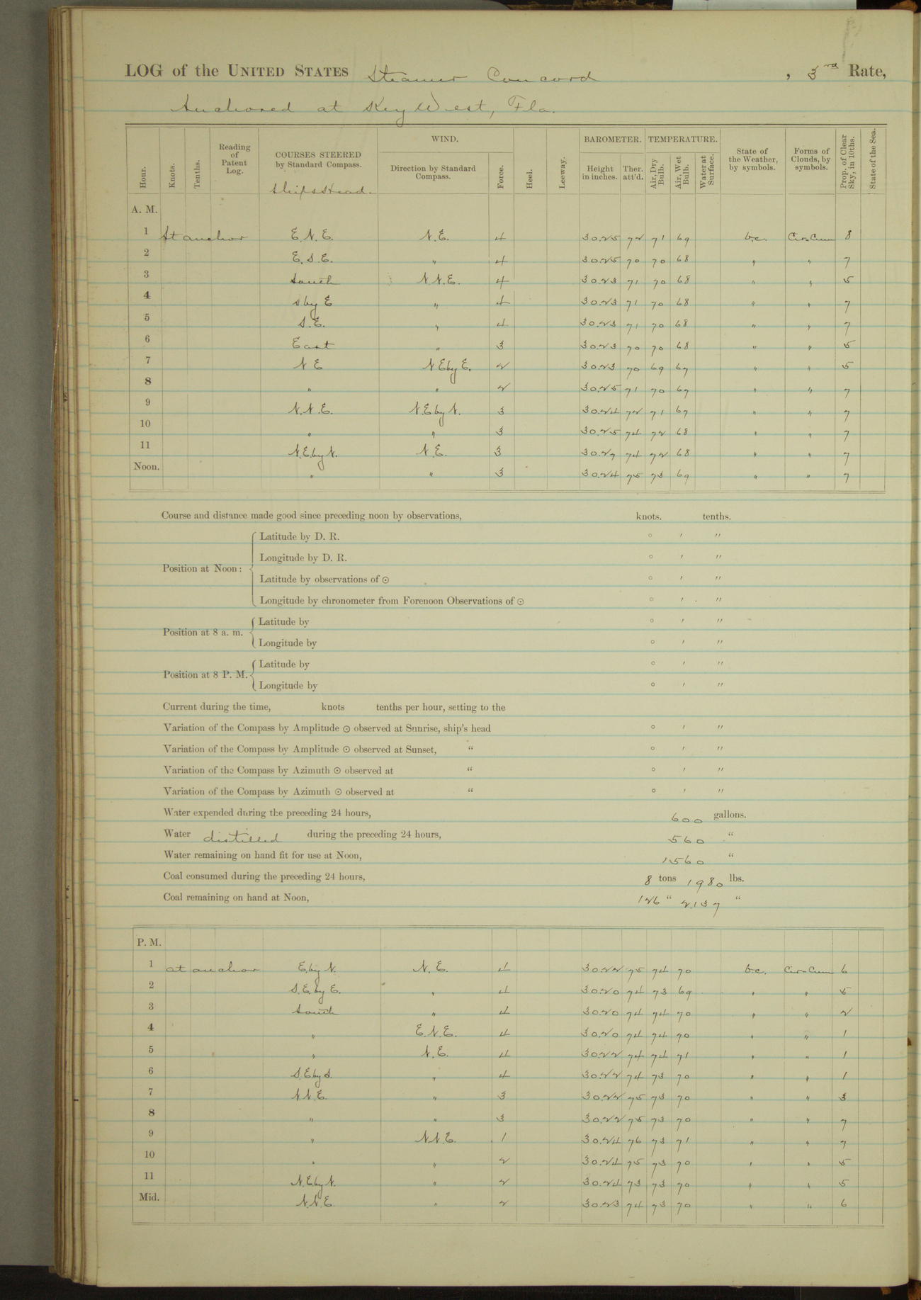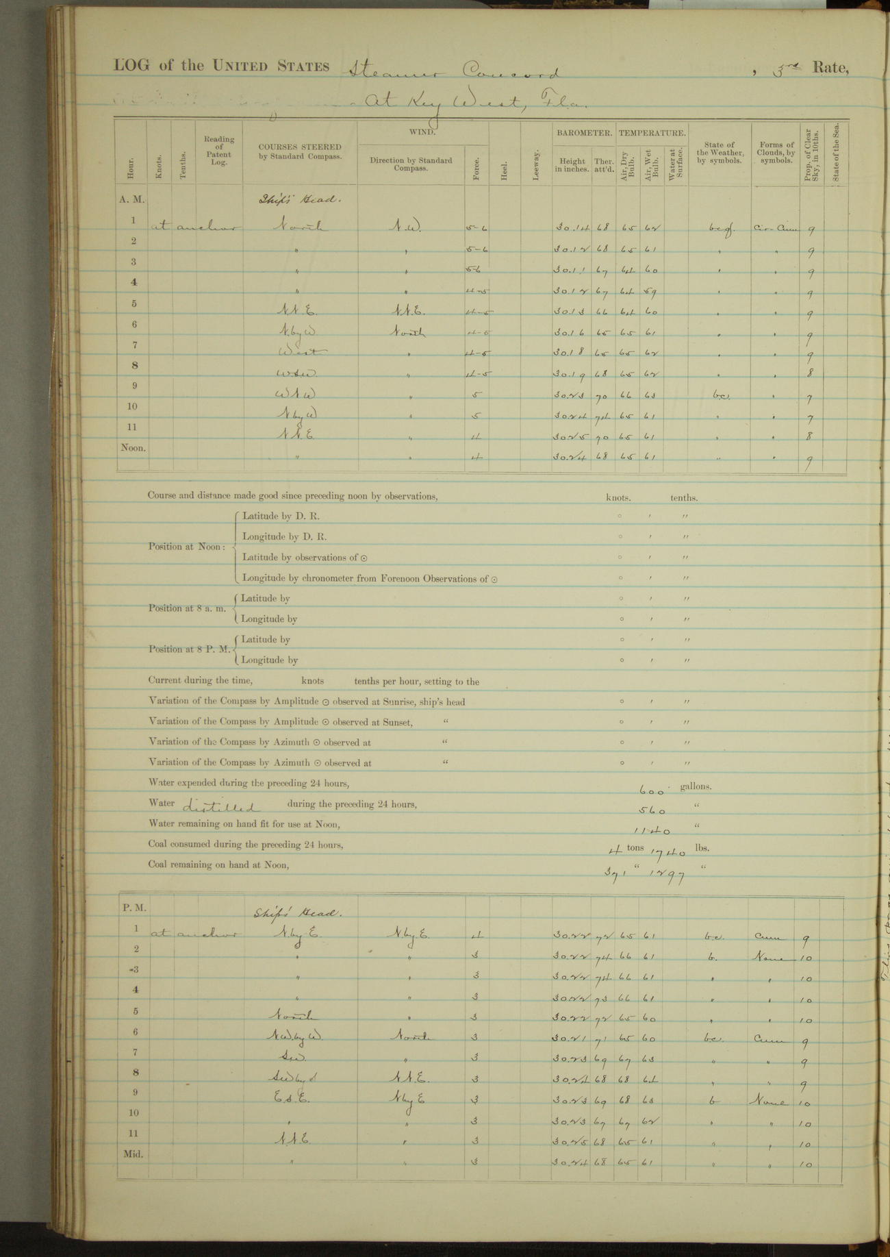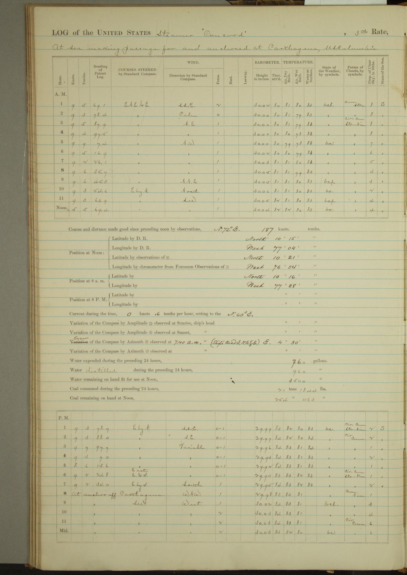At 10:30 AM captain Joseph U Miller U.S.N. representing the Commandant of the Navy yard, officially turned this vessel over to the Commander Oliver A. Batcheller USN who, with the officers & crew on the Quarter deck read the order from the Navy Department detailing him to command this vessel: whereupon the U.S Str Concord was declared in commission and the colors & pennant were hoisted.