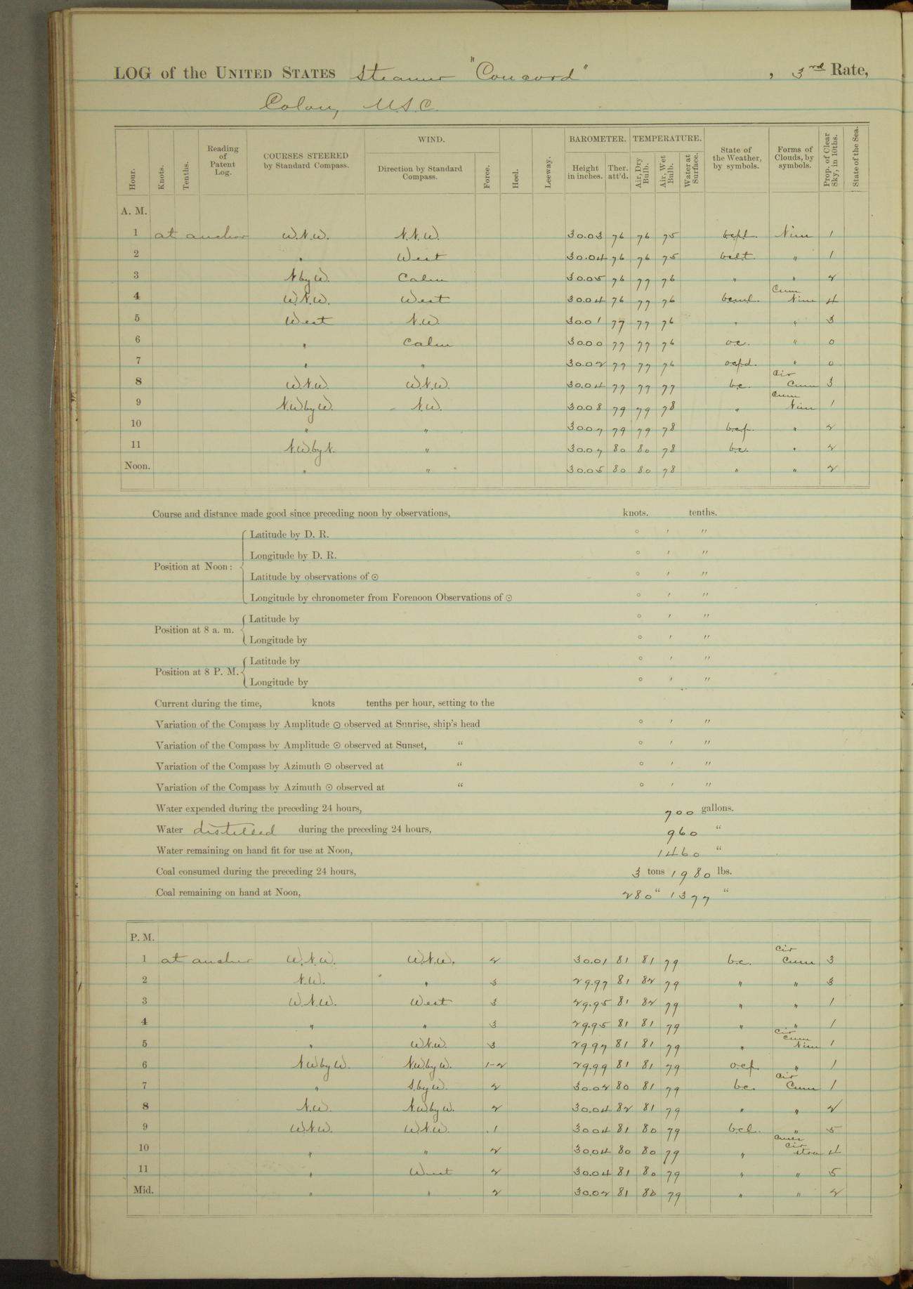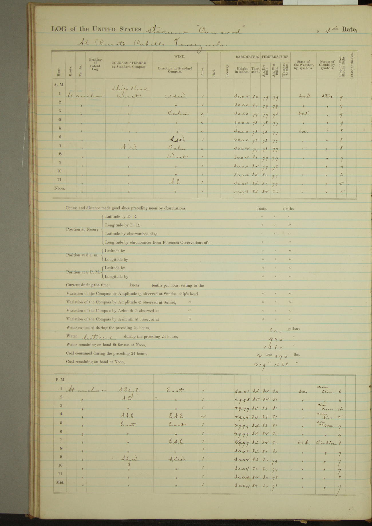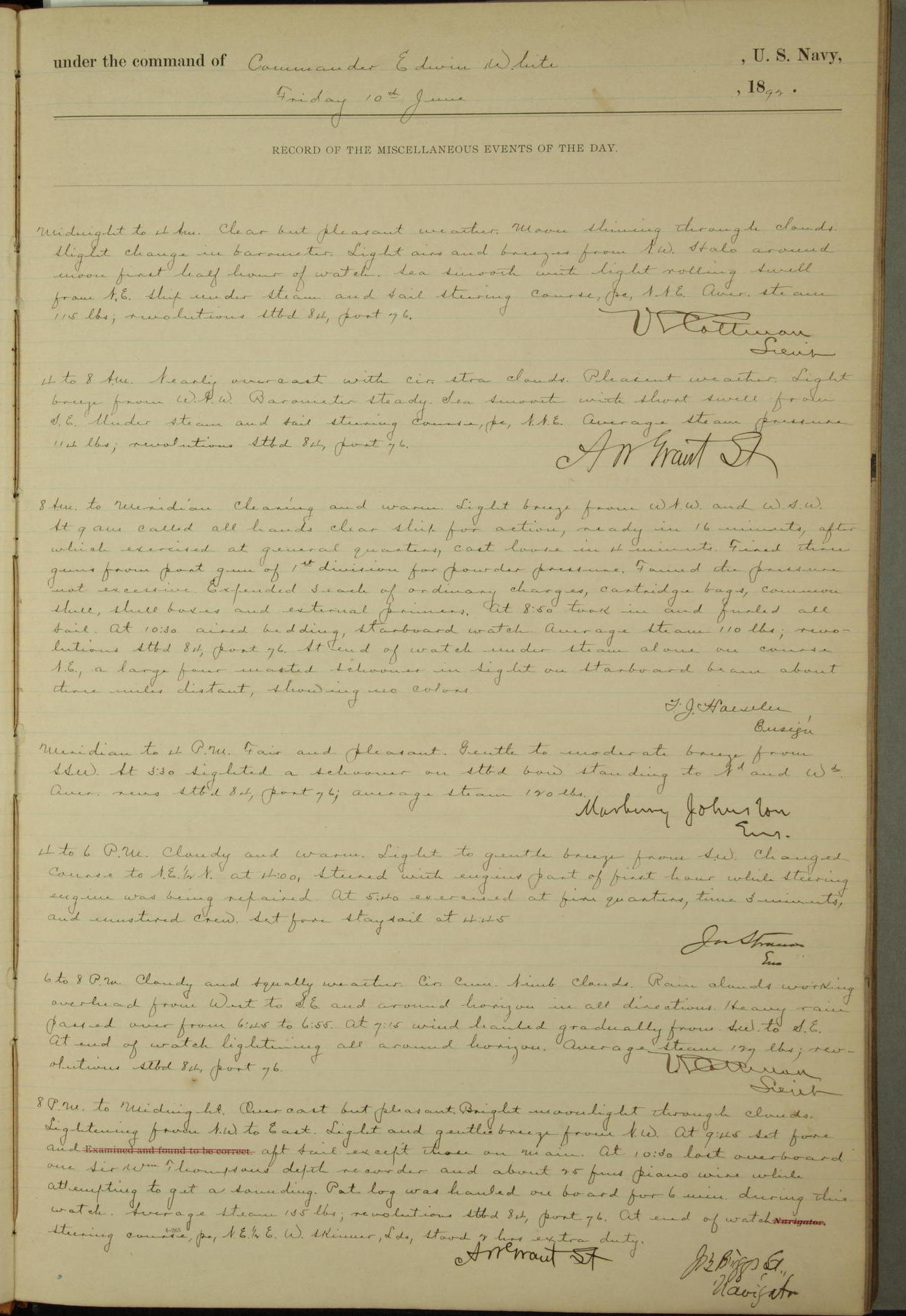 8 A.M. to Midnight. Overcast and cloudy. Light rain first hour. Barameter falling. Light airs from E.N.E. and calm. A.W. Grant, S?
