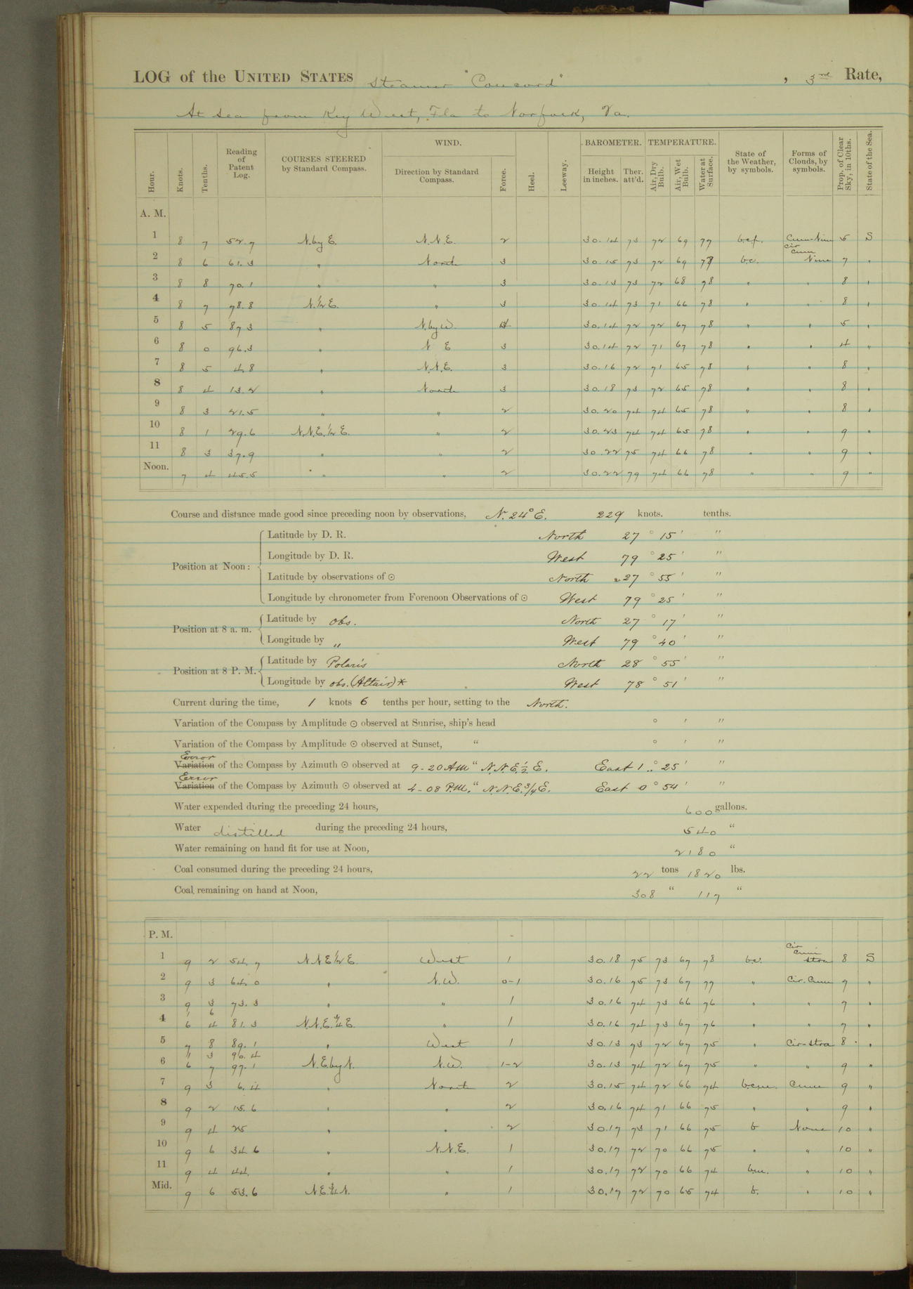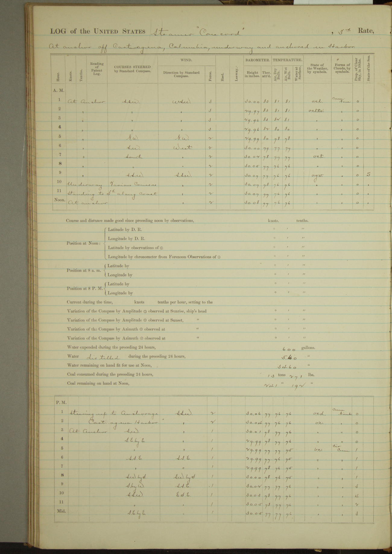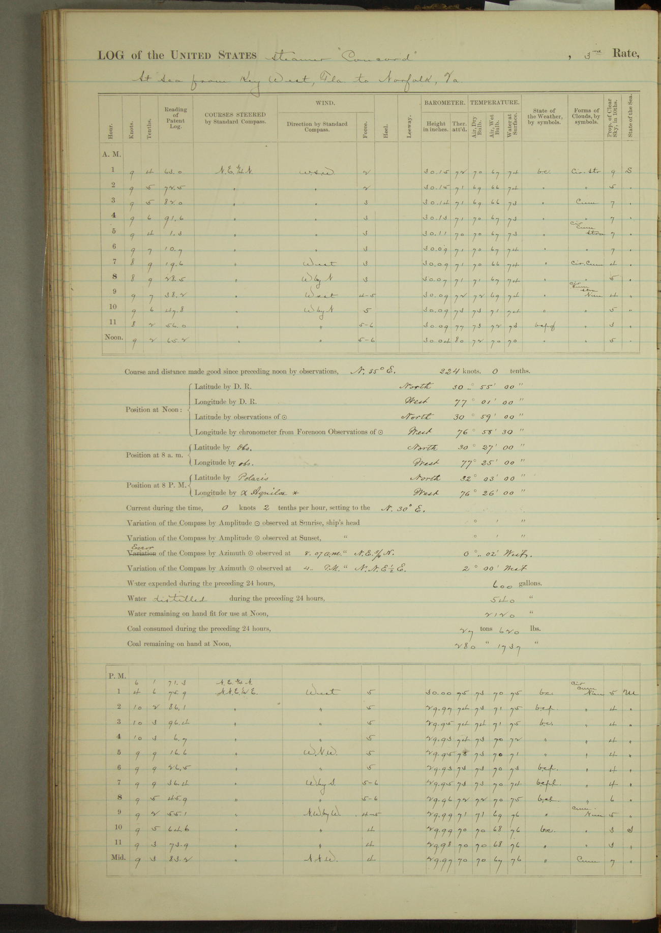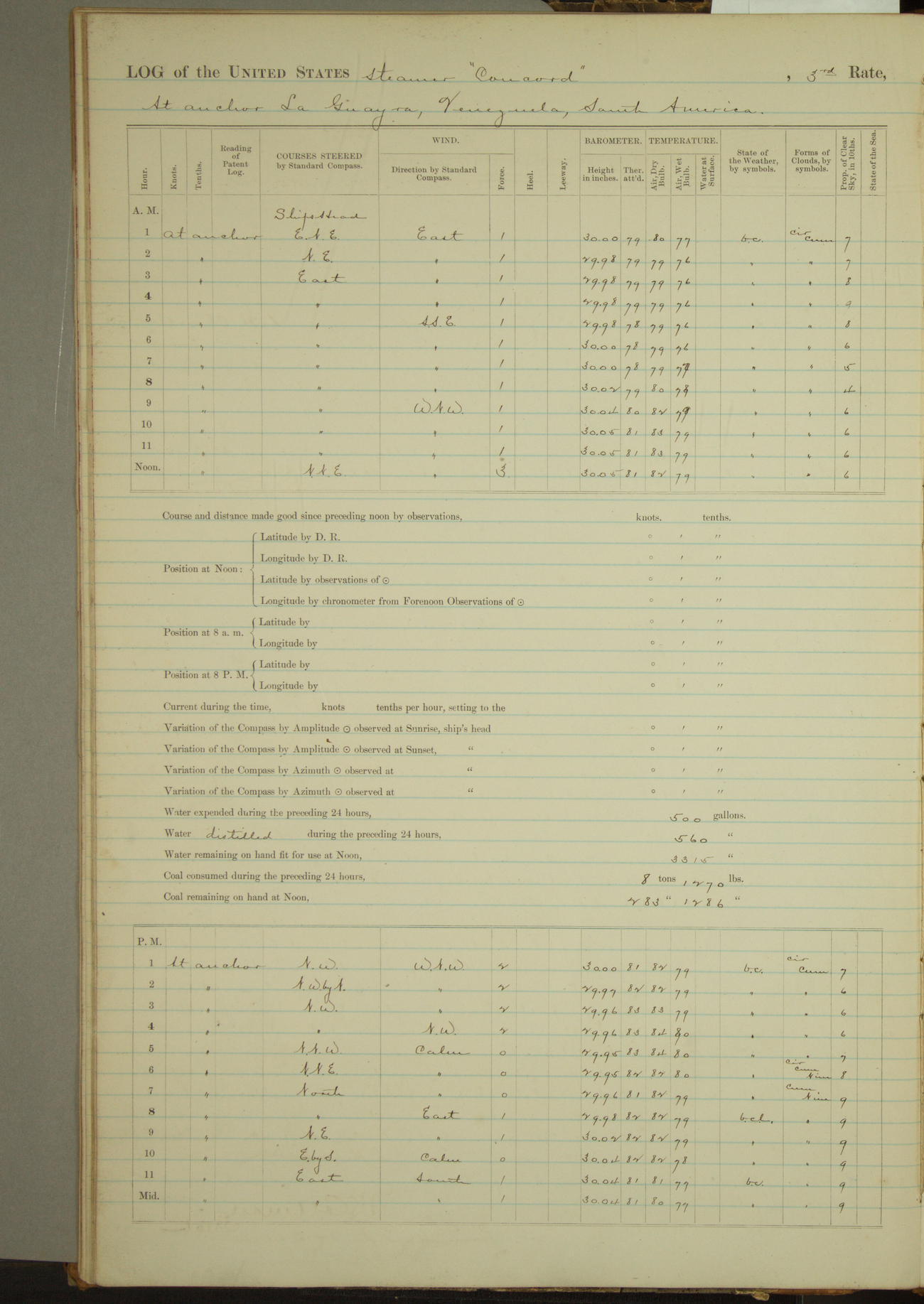 8 A.M. to Midnight. Overcast and cloudy. Light rain first hour. Barameter falling. Light airs from E.N.E. and calm. A.W. Grant, S?