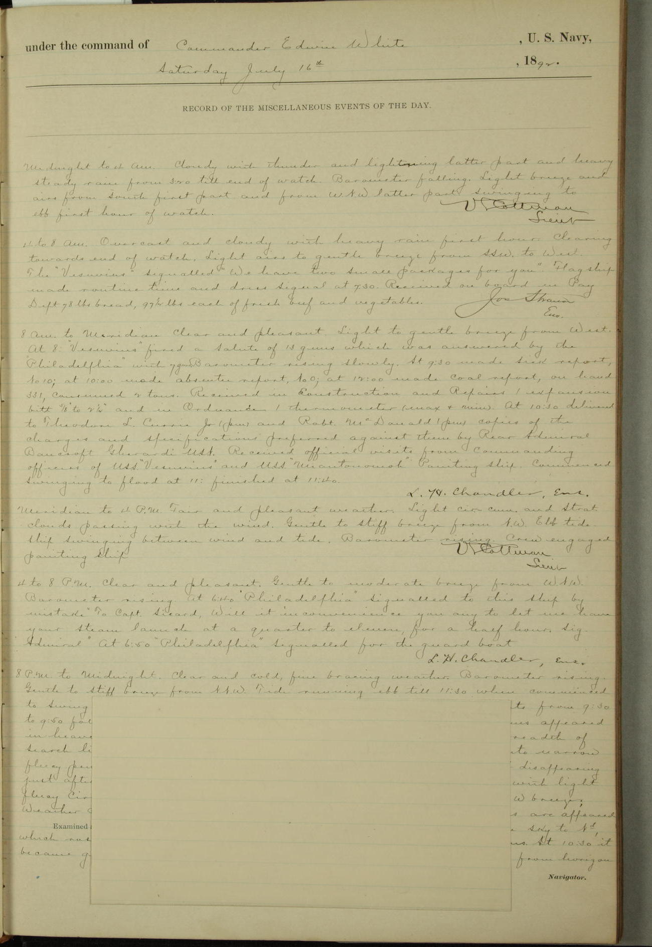 Commander Oliver A. Batcheller USN - At 10:30 a.m. Captain Joseph N. Miller U.S.N., representing the Commandant of the Navy Yard, officially turned this vessel over to Commander Oliver A. Batcheller U.S.N. who, with the officers & crew on the Quarter deck read the order from the Navy Department detailing him to command this vessel: whereupon the U.S. Str. Concord was delcared in commission and the colors & Pennant were hoisted.