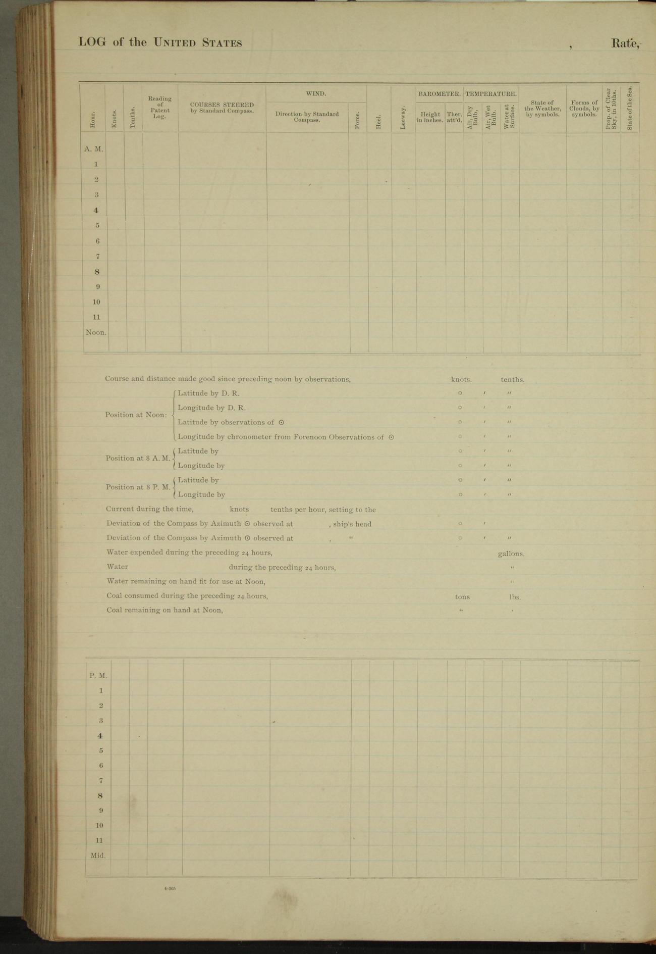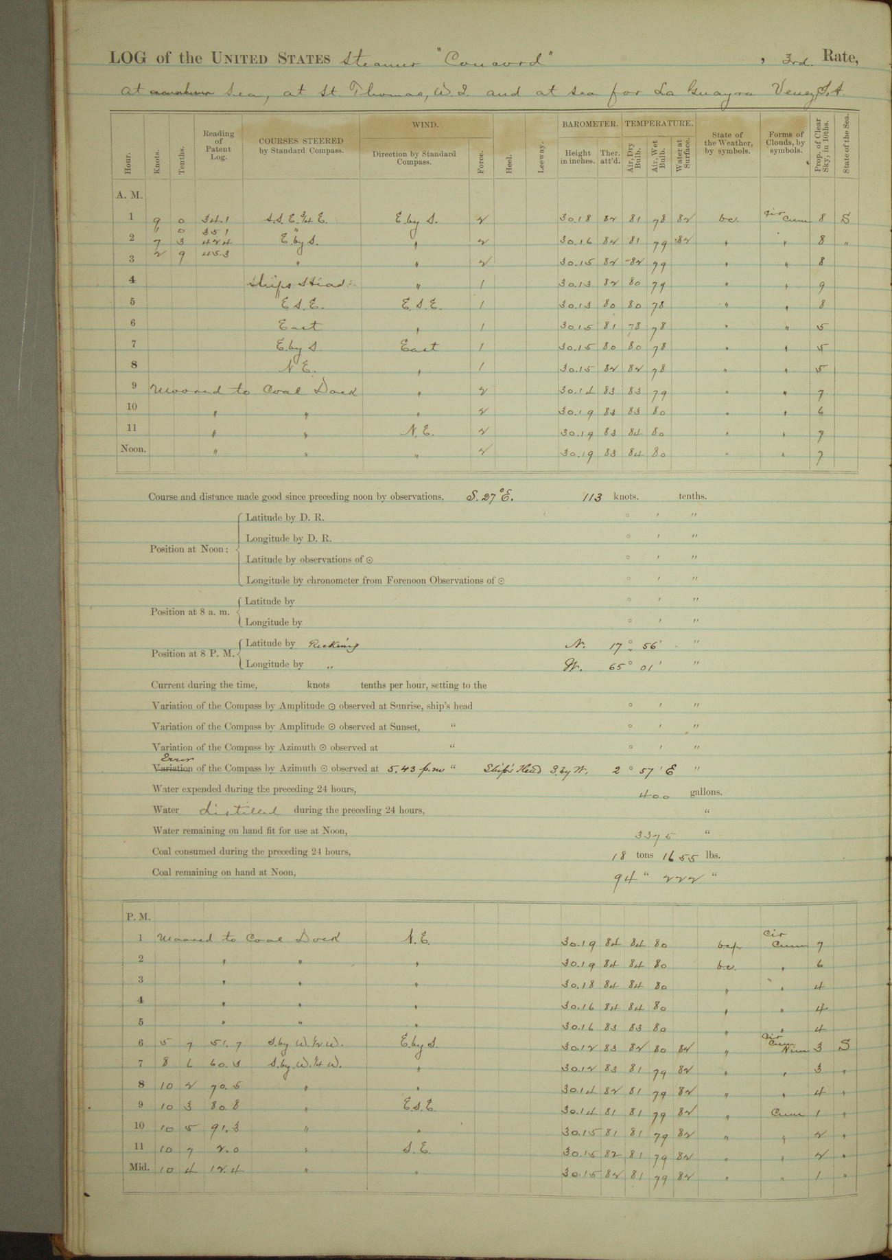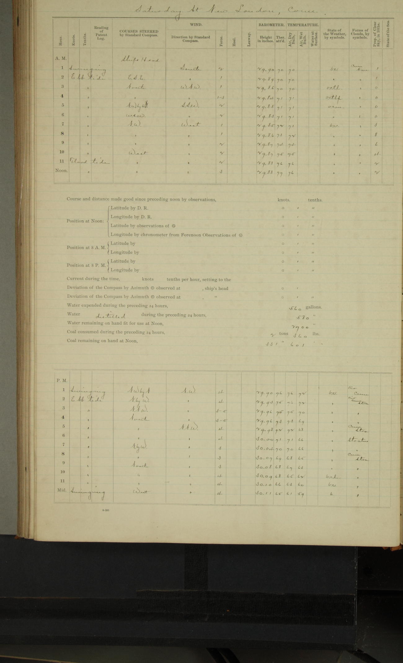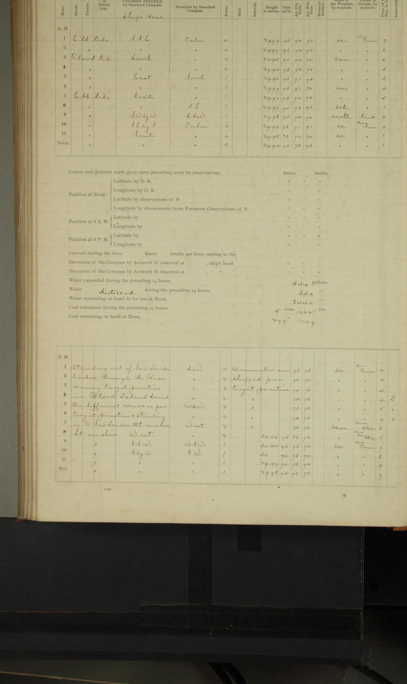 4 to 8P.M. Cloudy but pleasant weather. Barometer falling. Light breeze and air from SSW. M Sullivan was unhorsed from seating charge by order of commanding officer.