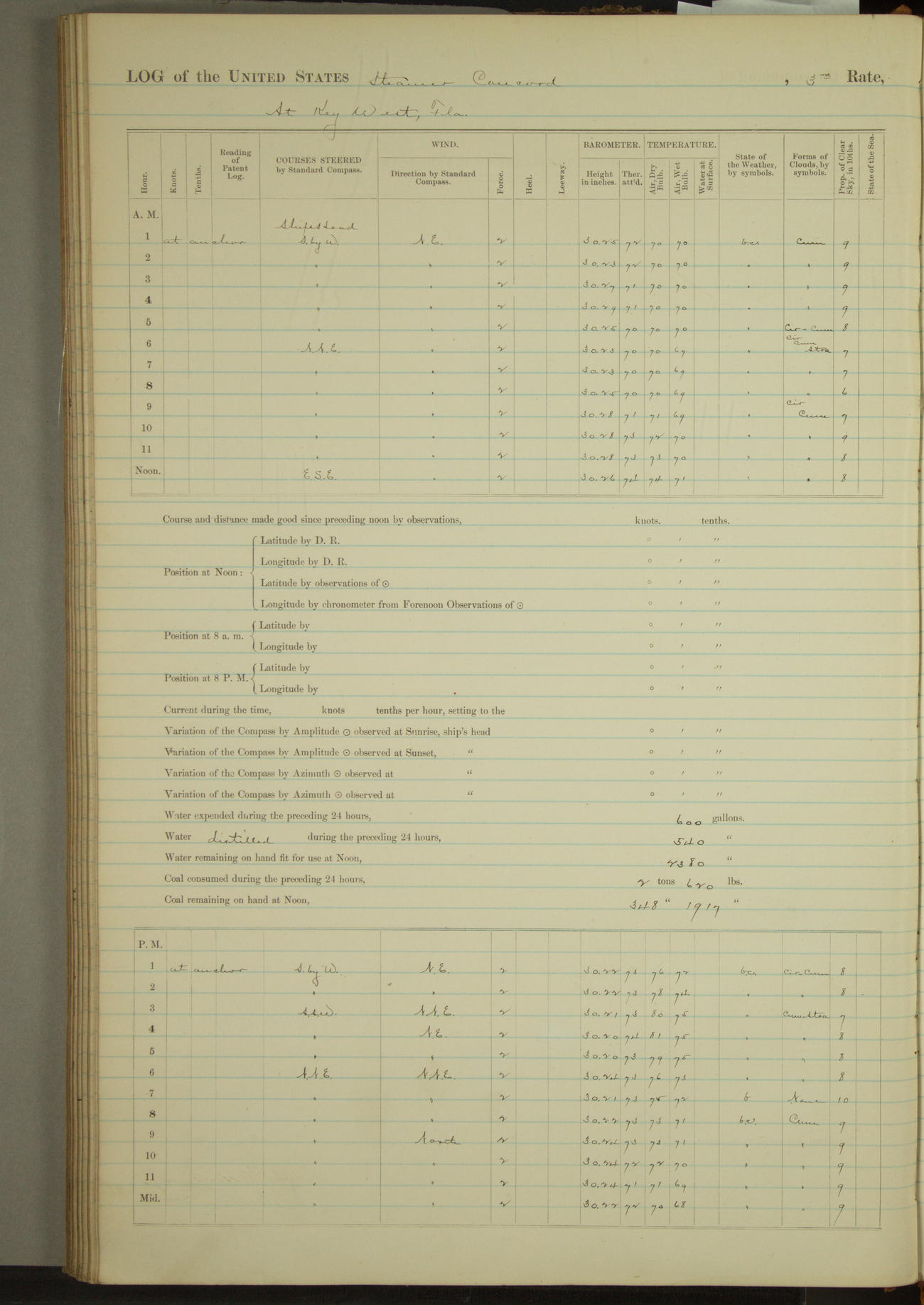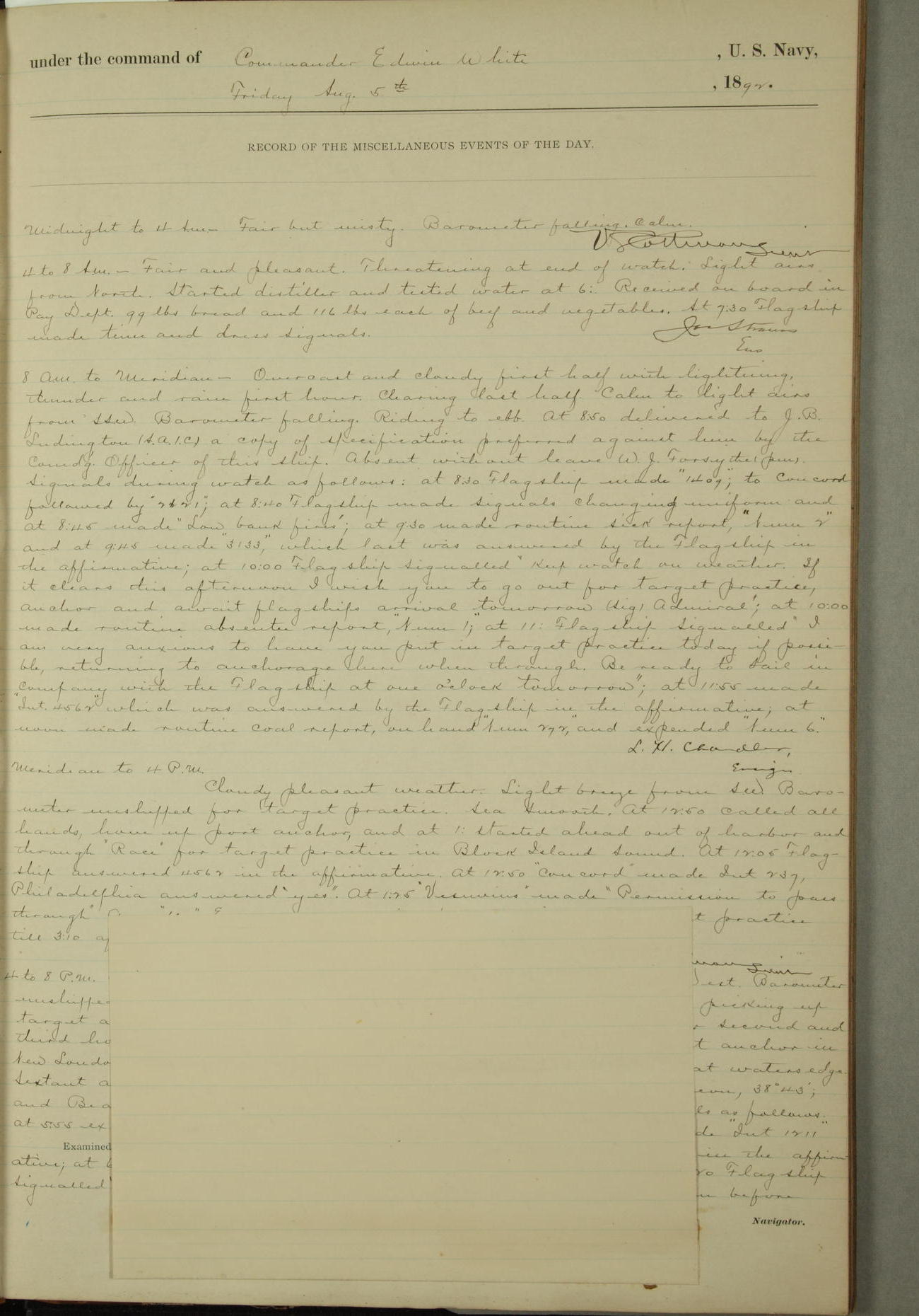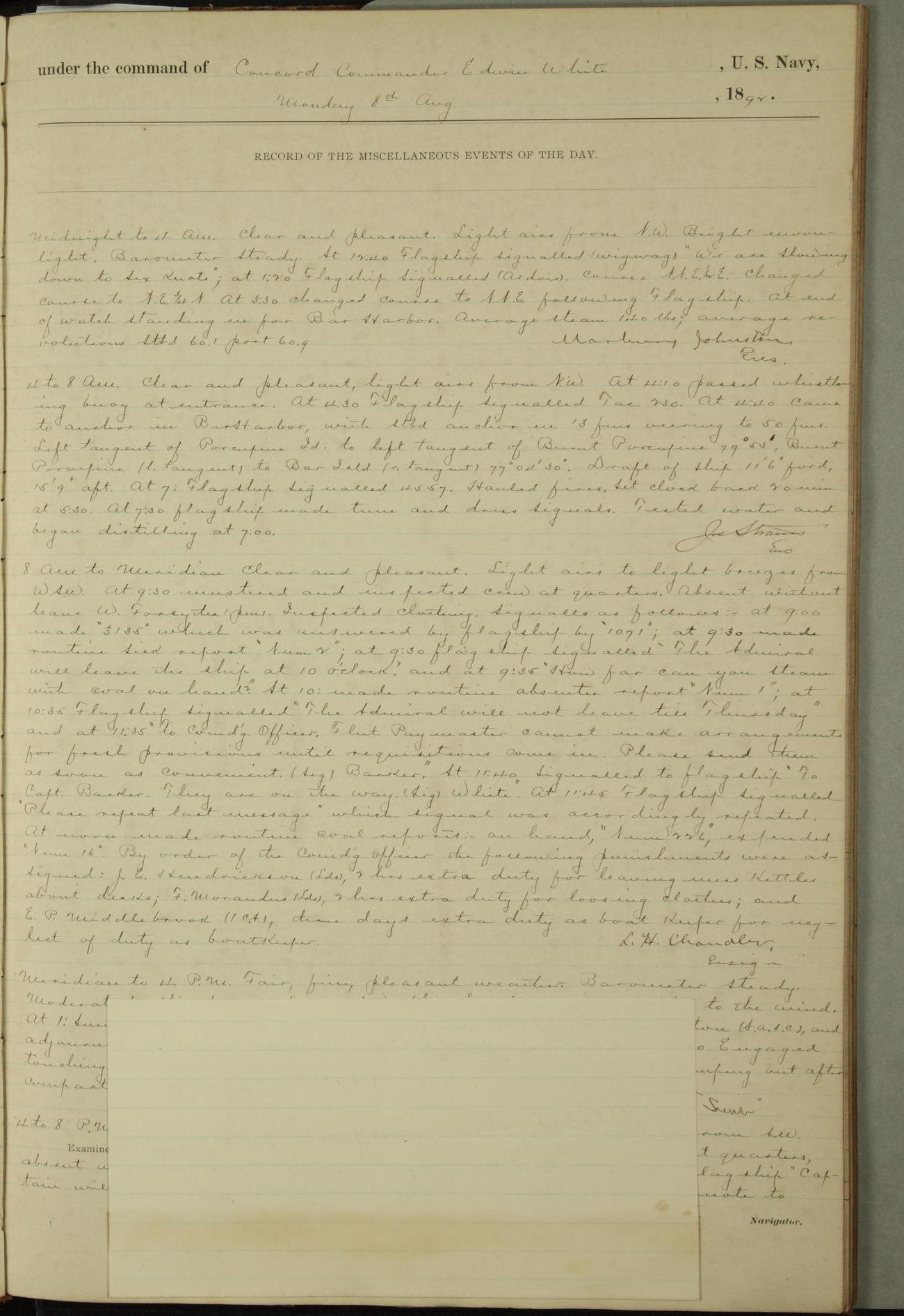 4 to 8 P.M. Overcast, coudy and raining. Light airs from E.N.E. Barameter steady. At 4:50 ??? crew at quarters. At 4:15 connected up boiler "D", disconnected and allowed fires to die out in boiler "A". L. H. Chandler, Ens.