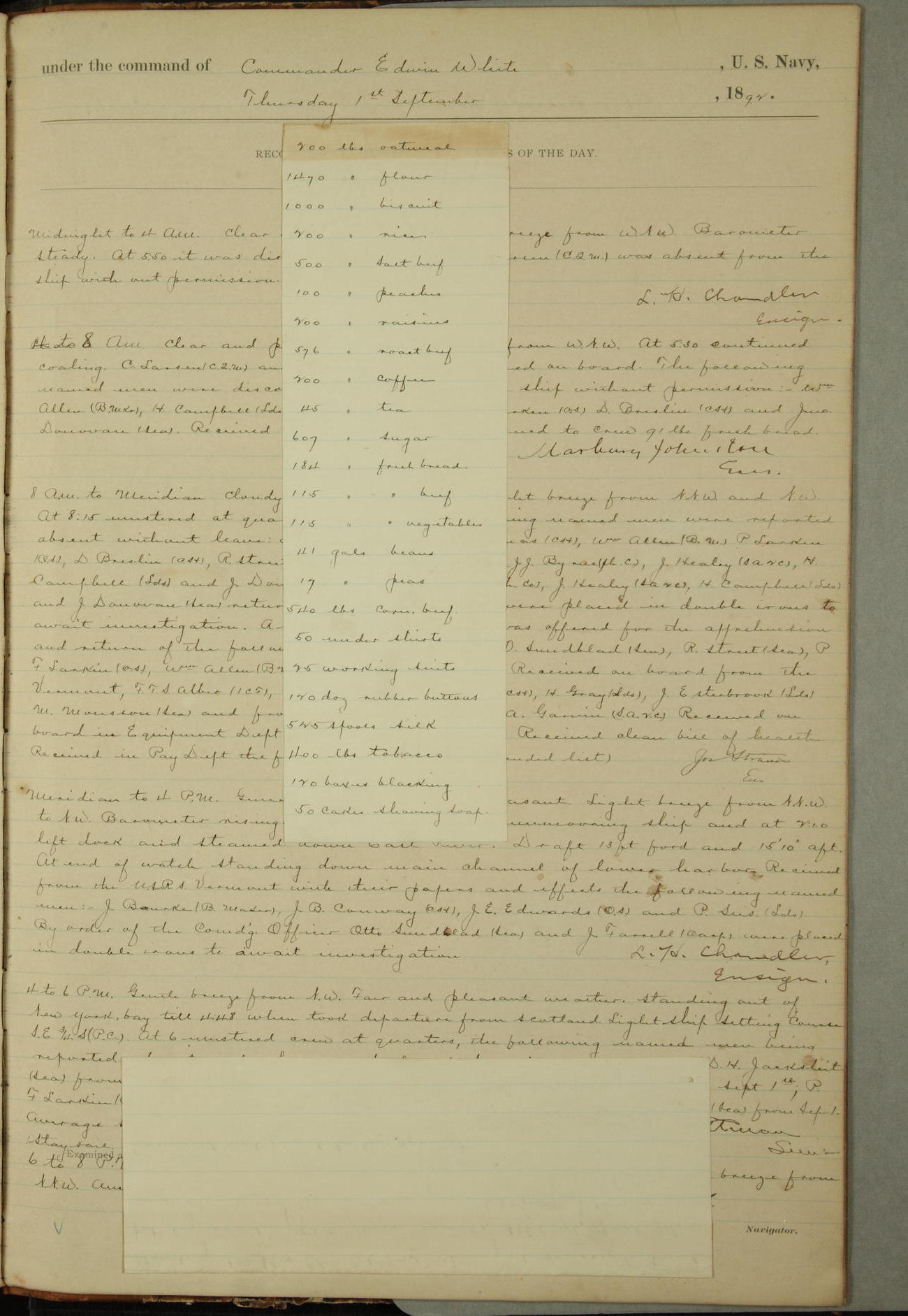 4 to 8 AM. Cloudy and cool. Lith airs from East and E.N.E. Received in Pay Dept. 100 lbs bread and 125 lbs each of beef and vegatables. Jos Strain. En