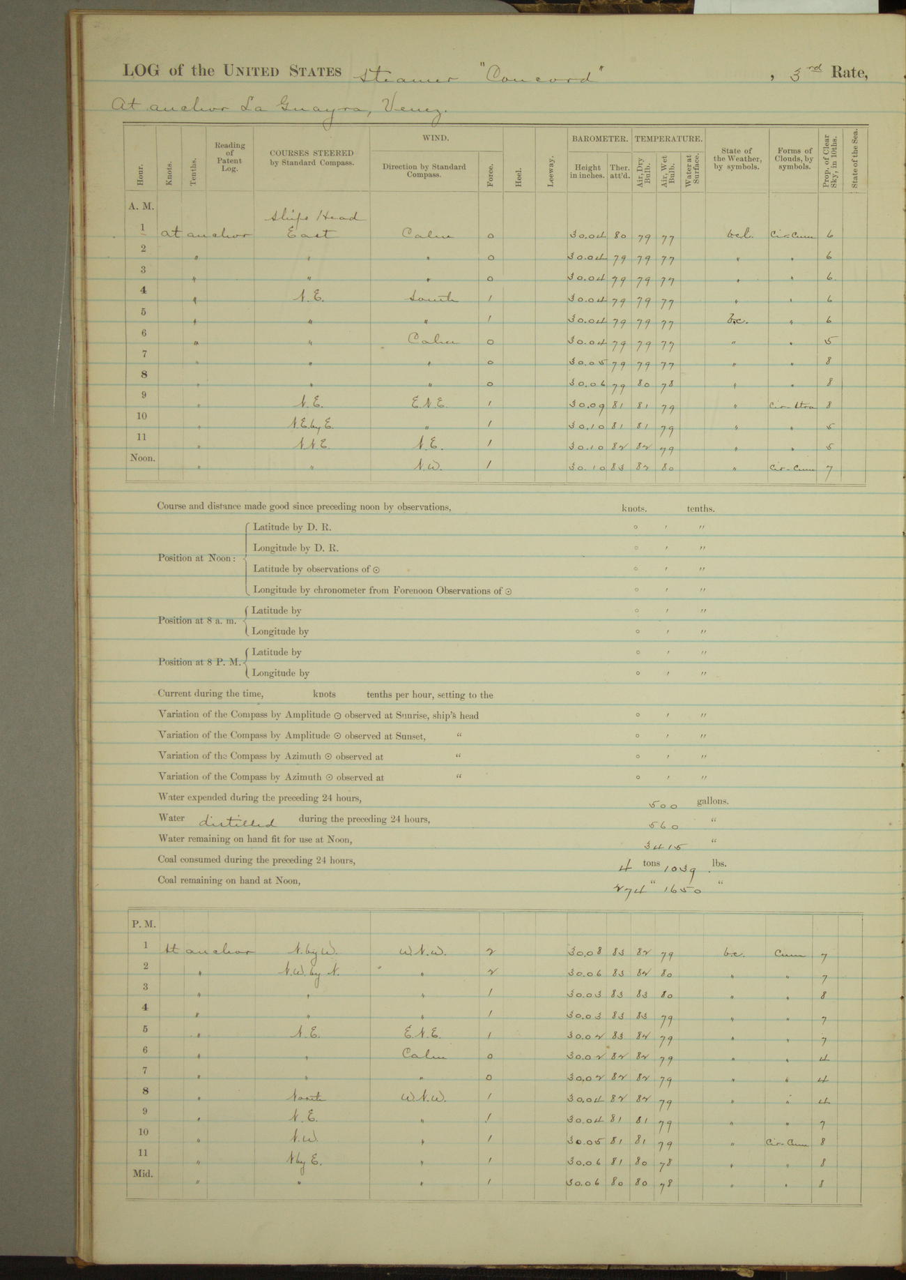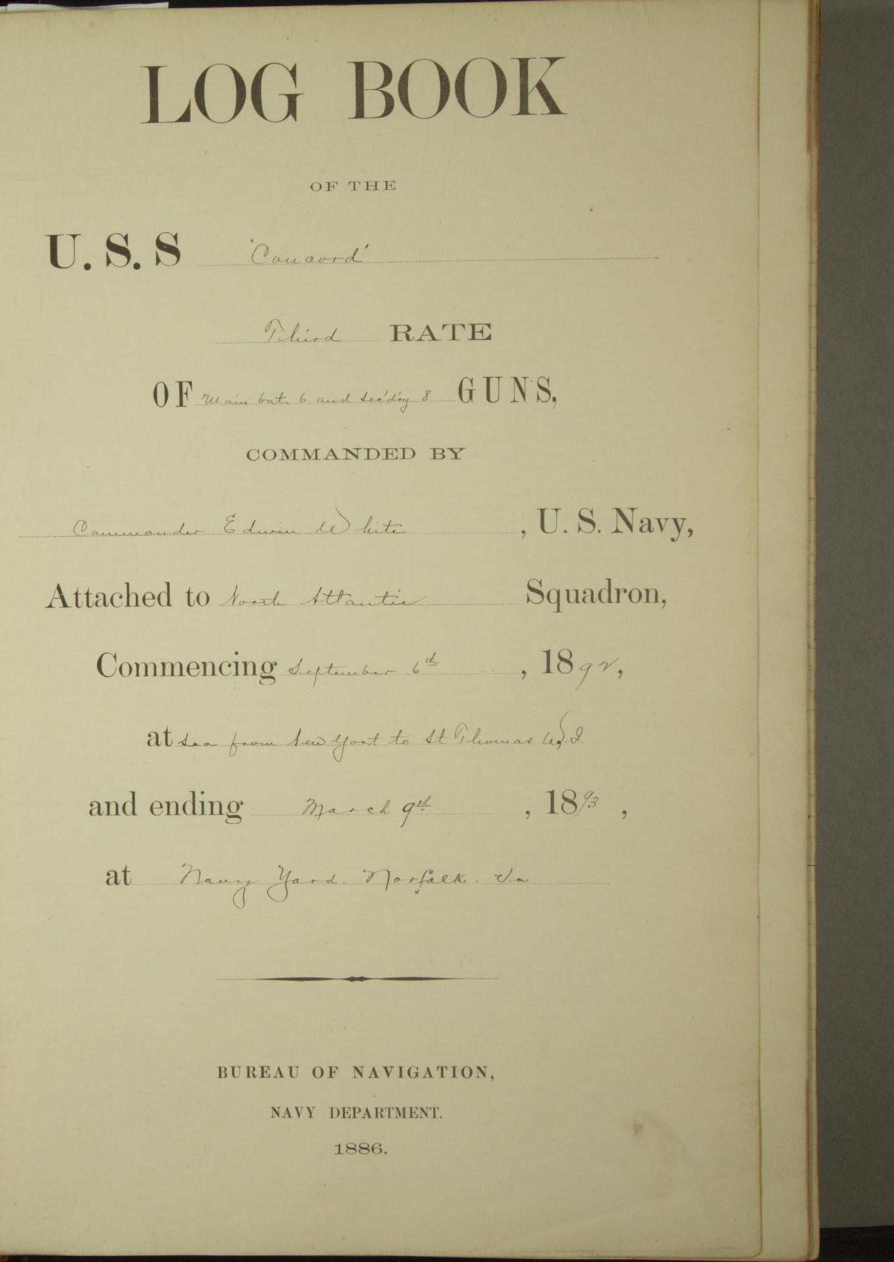 LOG BOOK OF THE U.S.S. Concord 3rd RATE OF 6 - Main battery. 8 Sec. battery GUNS, COMMANDED BY Commander Oliver A. Batcheller, U.S. Navy,