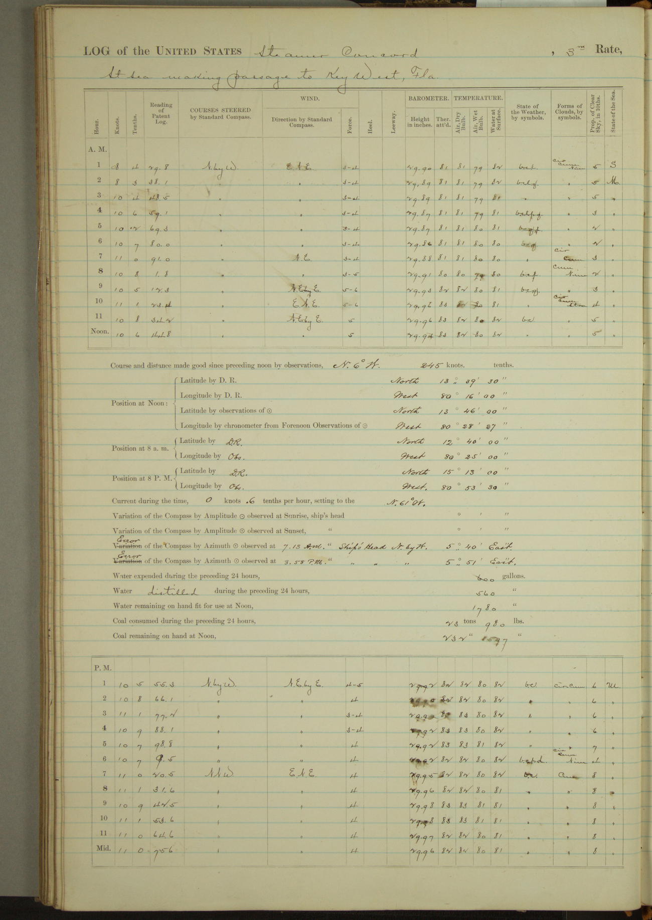 The following is a list of the officers:- Commander Oliver A. Batcheller U.S.N., Commanding officer:- Lieut Comdr E.P. Wood USN., Executive officer, Lieut John B. Briggs USN., Navigator, Lieuts Vincendon L. Cottman & Char Laird USN., Lieut (Junior grade) albert W Grant USN., Ensigns Joseph Straues & Levi C. Bertololette, USN., Surgeon Reinus C. Persons USN., Paymaster Jas A Ring USN., Chief Engineer Robt B Hine USN., Passed Asst Engineer E R Gruman USN., & W~h Pays masters clerk Jonathan Brooks USN., and the following men:- Jno Blocktye (sea) Alfred L Lawson (Sea) Daul C lewis (Sea) M Martin (Sea) Patrick Dilson (Sea) Jas Chilton (Sea) Dane McCariley (Sea) Jno Donovan (Sea) ~. Sullivan (Sea) Robt J Uiddrie (Sea Gunner) E.J. Bourke (Sea Gunner) K. ~uaney (Sea Gunner) E. Brandt (Sea Gunner) Peter Jessen (Sea) Geo henry (Sea) A Wright (Sea)Wm Leonard (Sea) Fred Miller (OS) Geo Brown (lds) Geo W Connell (Pds) Jas Hindley (lds) Alf J. Percell (Pds) Wm Schuawau (Pds) W S Popple (Pds) J.E. Overton (Pds) Jas J Byrne (lds) Wm J Shaw (lds) Juo Glenn (pds) Juo M Plunckett (lds) Jno J. Mc Guiness (lds) Juo Phillips (lds) J A Wei~ls (lds) Thor H Gord (ord) J. McCaffray (ldr) Adam Haas (lds) Wm Davis (~) wm Rhodes (~) Chas R.smith (~) Andrew alsen (~) Jas Sheehan (~) Jackson Holmes (~) Juo Hannon (~) Juo Couley (~) L Deagan (CH) D. Breslin (CH) Thor Ahern (CH) Jas H McGlane (CH) P.J. Fitzgerald (CH) J.J. Reardon (CH) M.J. Glynes (CH) David Sullivan (CH) Geo Turner (CH) Parrick O’Brian (CH) J F Tobin (CH) Juo A Burnett (lds) Henry La Watt (lds) D Flanagan (lds)
