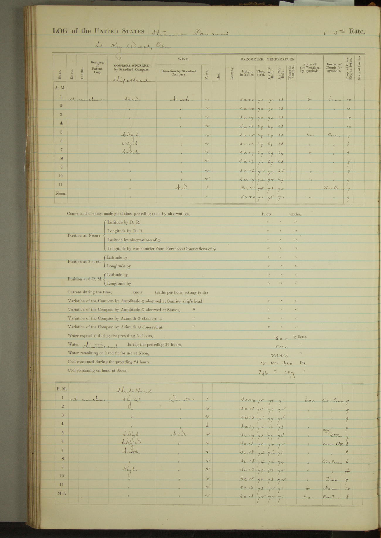 Midnight to 4 a.m. clear and cold. Blue sky. Bright midnight. Calms and light airs from W.S.W. Barometer Steady.