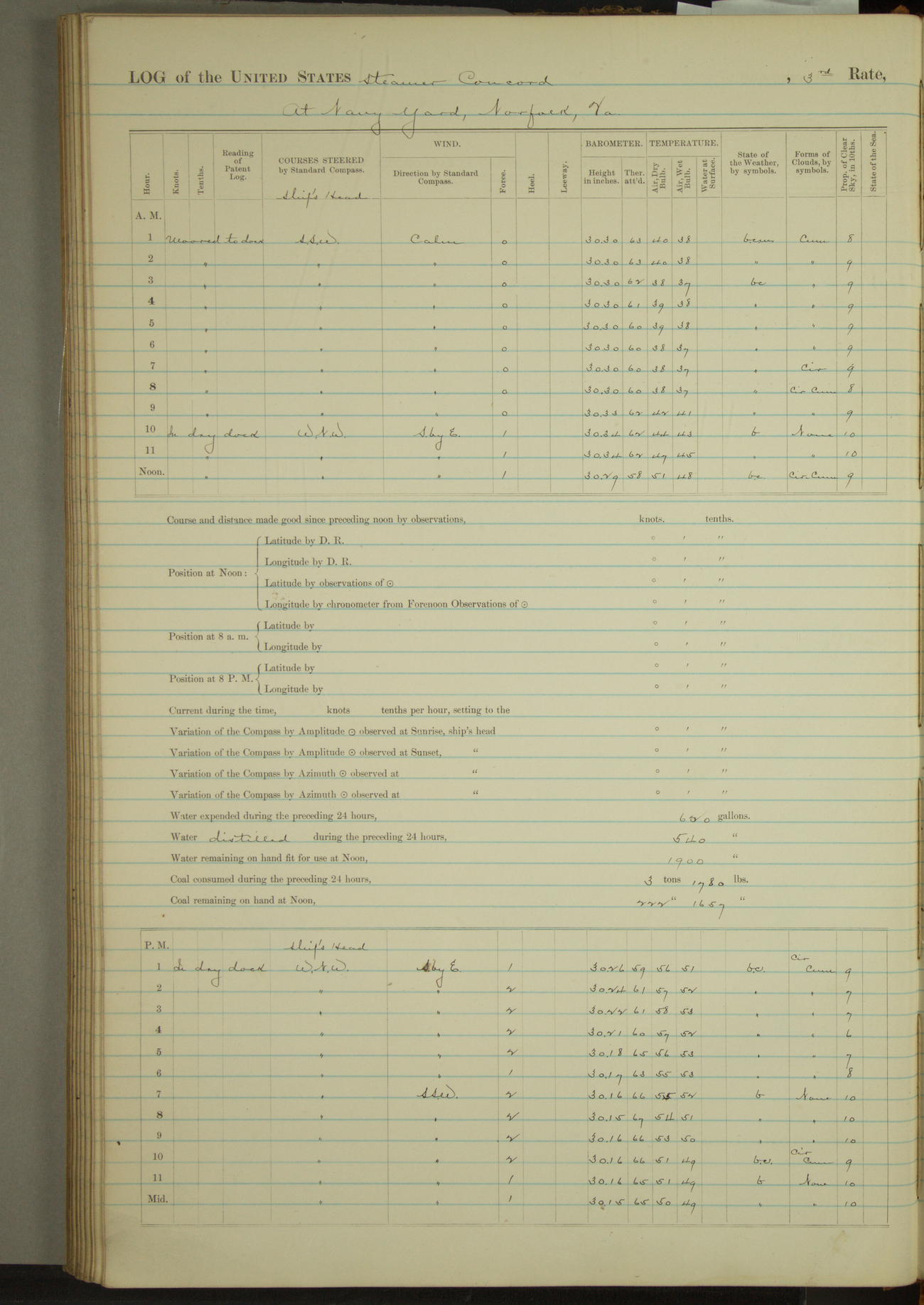 Moored to dock. Navy yard. No instruments for observations.