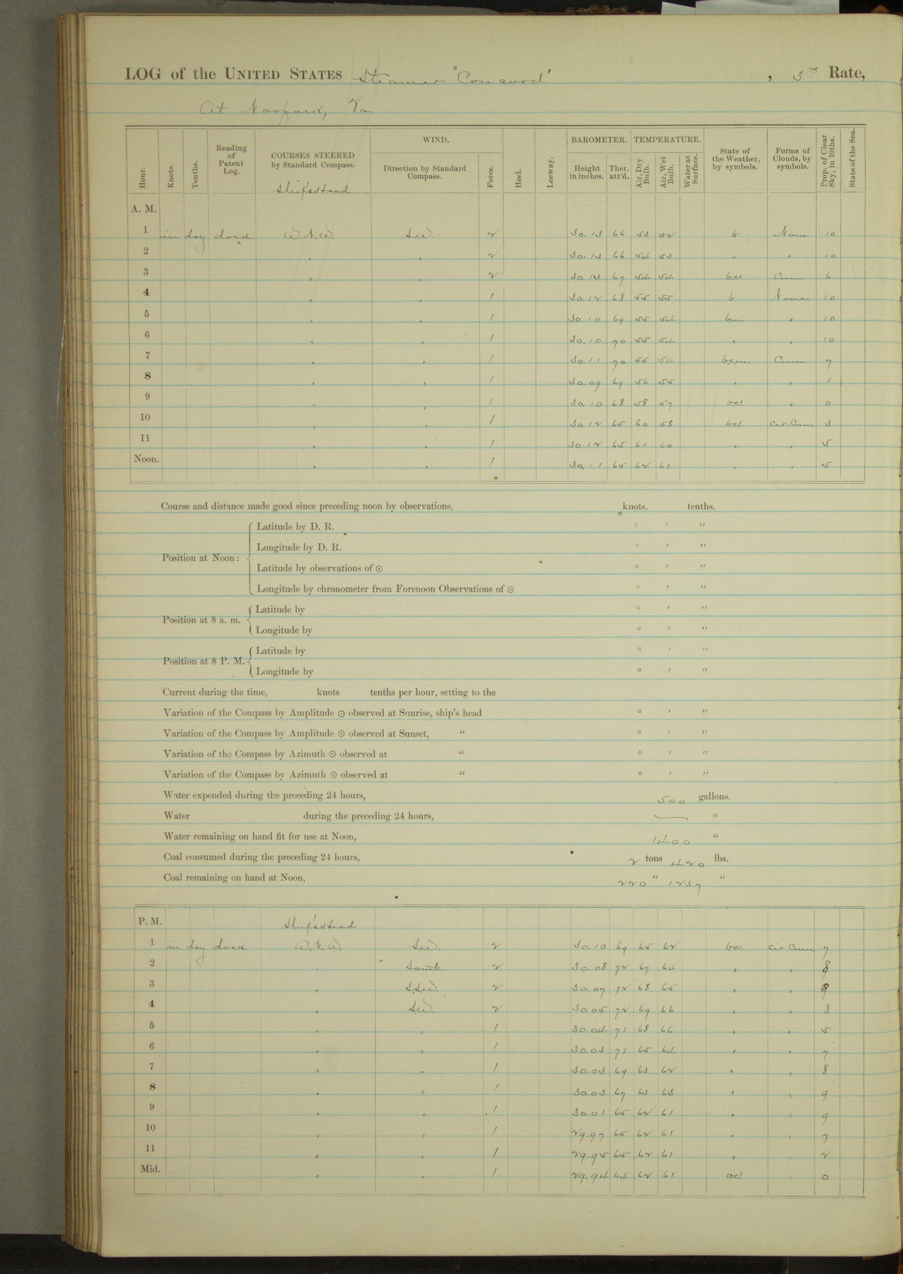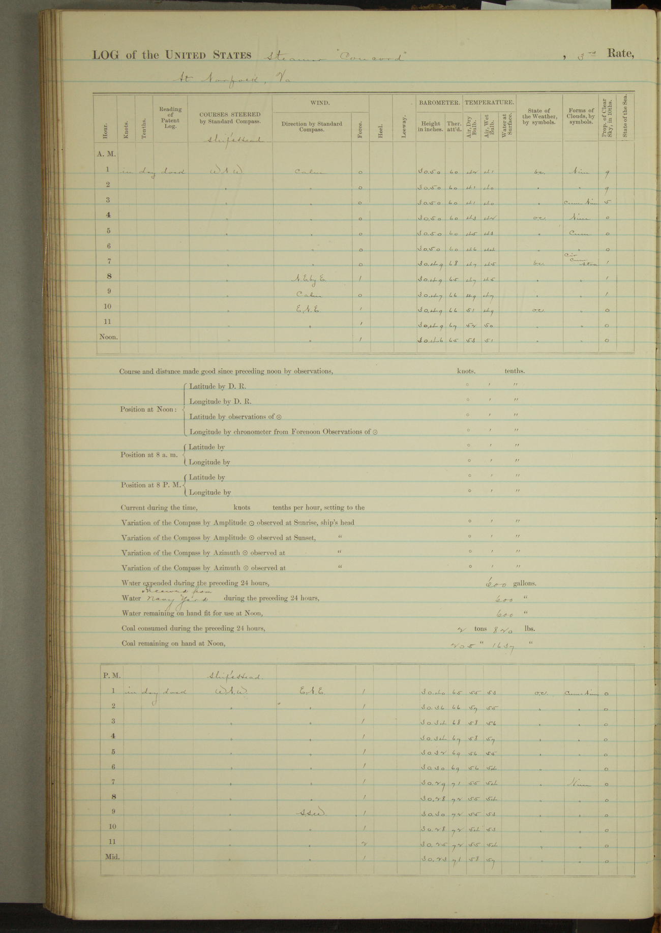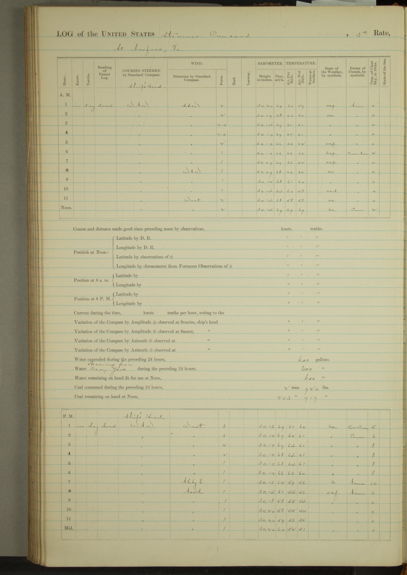 At 1 Marine guard, consisting of one Sergeant, 1 Corporal, and 15 privates reported on board being transfered from Marine barracks. List of Marine guard:- Sergt Jas M Foley, Corpl Jus Delaney, Privates Jus Clifford, Geo Colter, Theo L. Currie, Jus M Cueseck, Thos Dalton, Henry T Jones, Harry Kern, Willis B. Knowlton, Lanbert Kuhu, Hugh McFadden, Juo McGlade, Jeremiah M. O’Keefe, Fred’k Rahn, Timothy Sullivan, Jas H. Wilson.