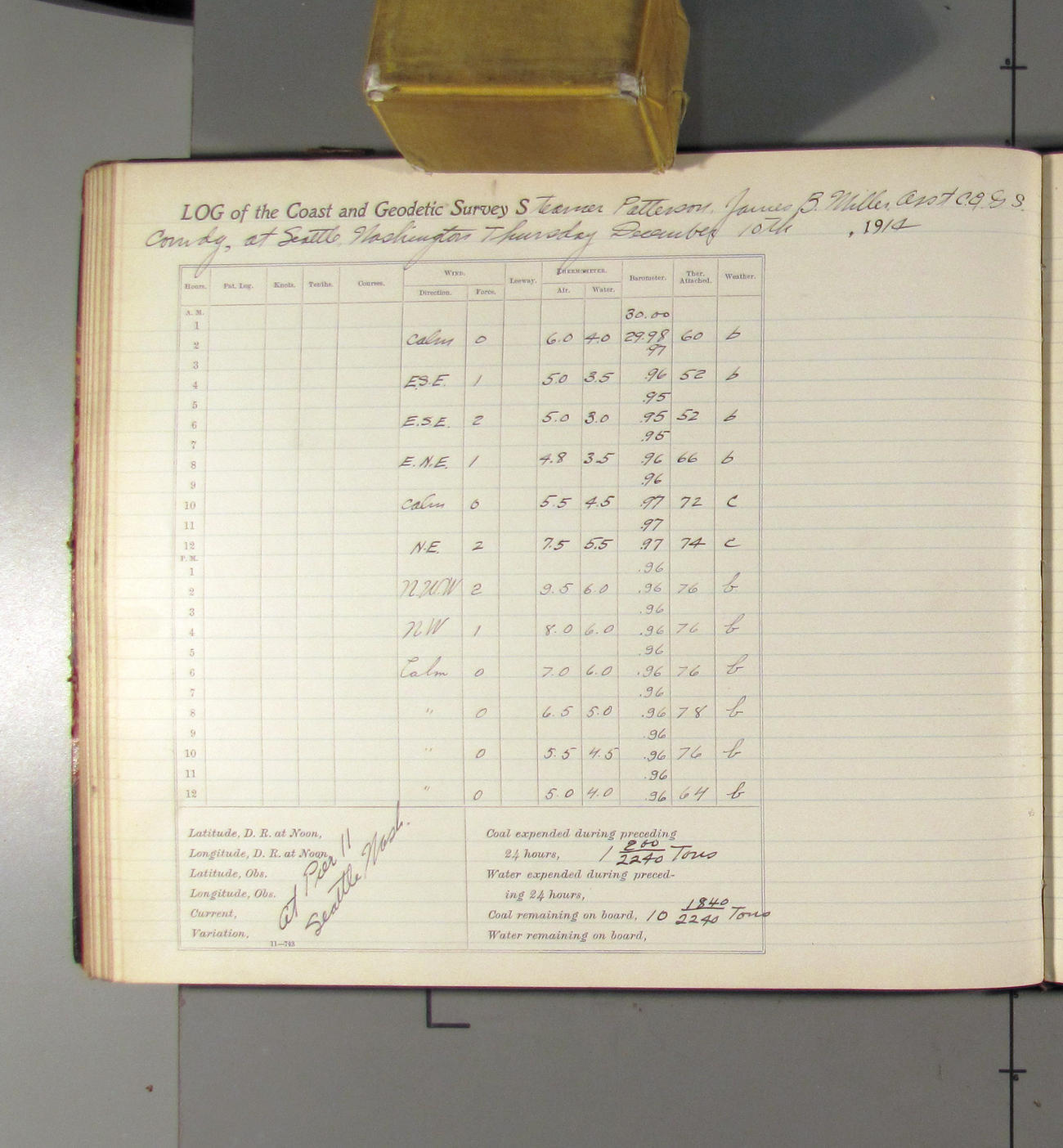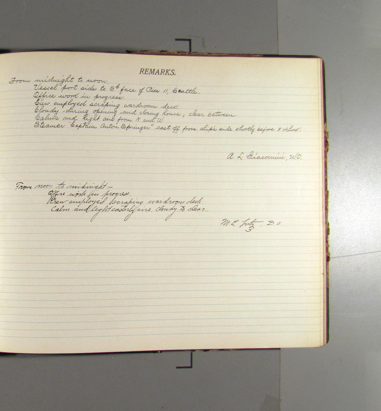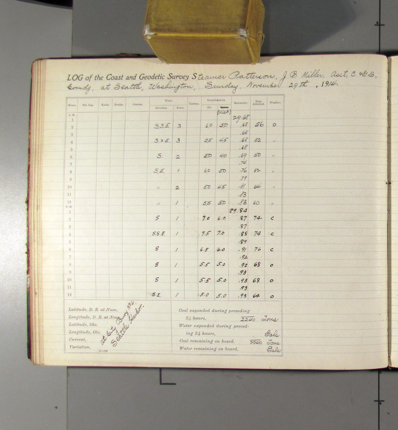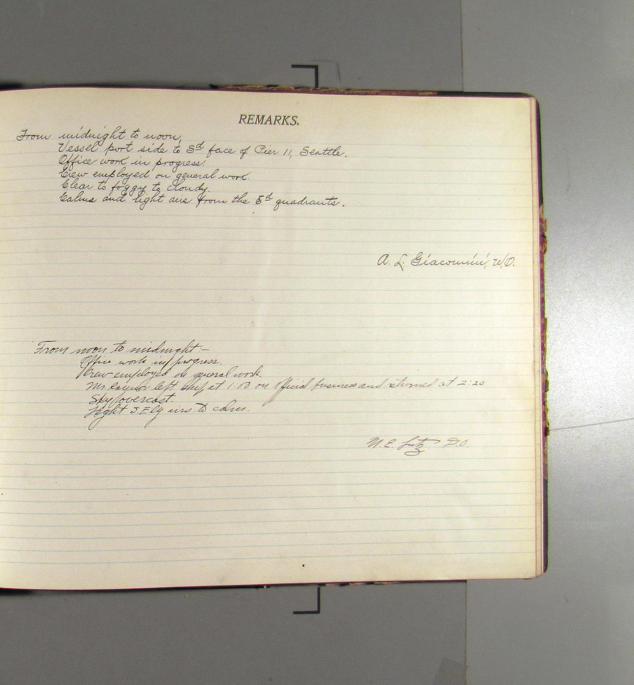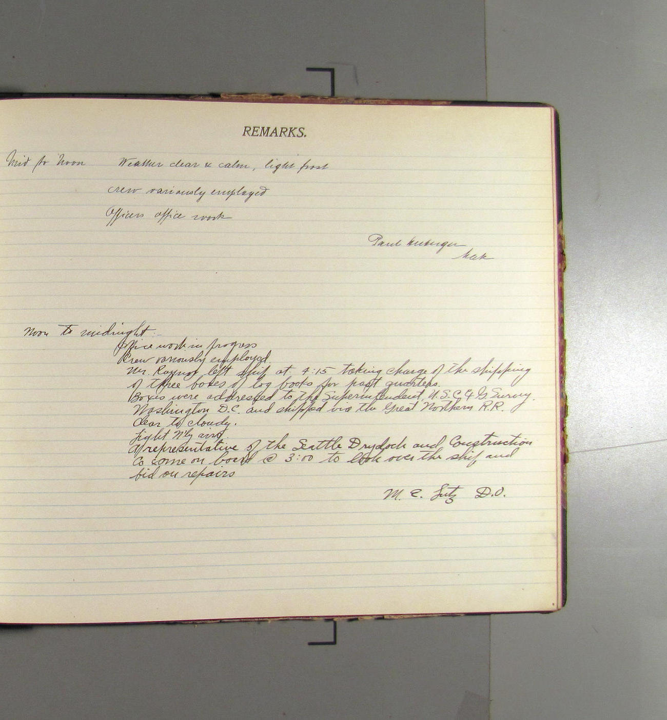 Noon to midnight. Office work in progress. Crew variously employed. Mr. Raynor left ship at 4:15 taking charge of the shipping of three boxes of log books for past quarters. Boxes were addressed to the Superintendent, USC&G Survey Washington DC and shipped via the Great Northern RR. Clear to cloudy. Light N'ly airs. A representative of the Seattle Drydock and Construction Co come on board @ 3:00 to look over the ship and bid on repairs
