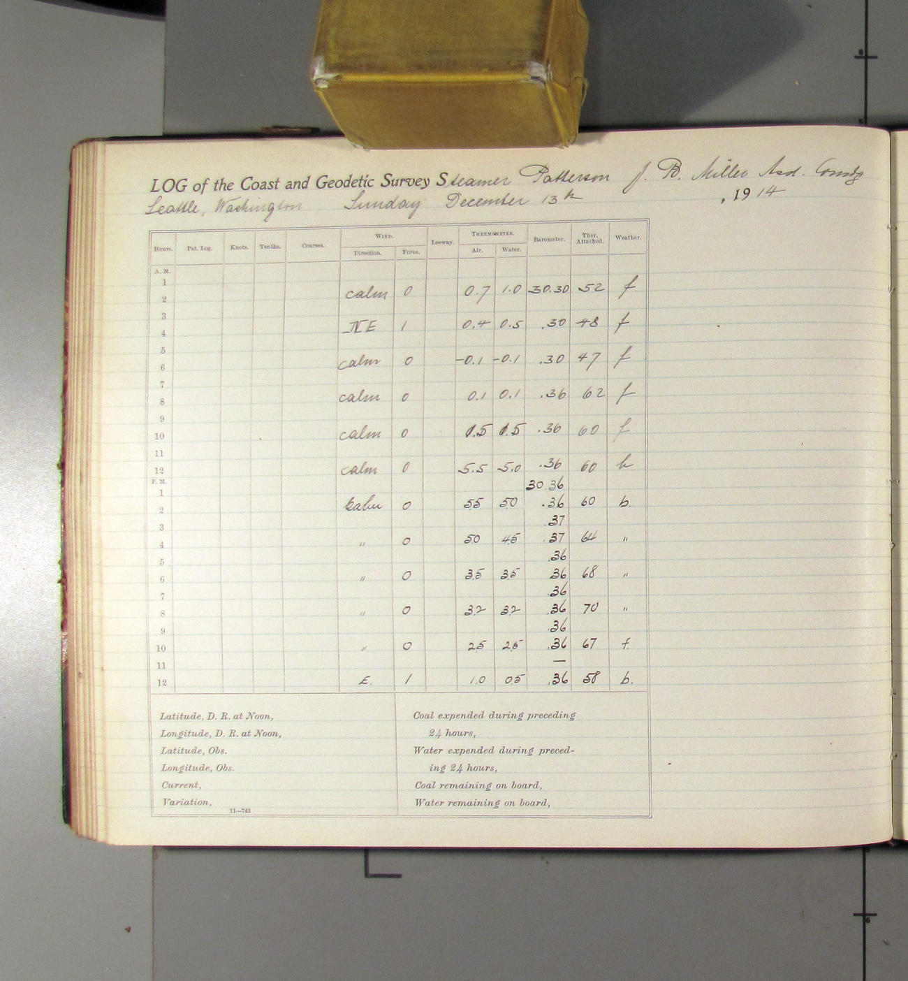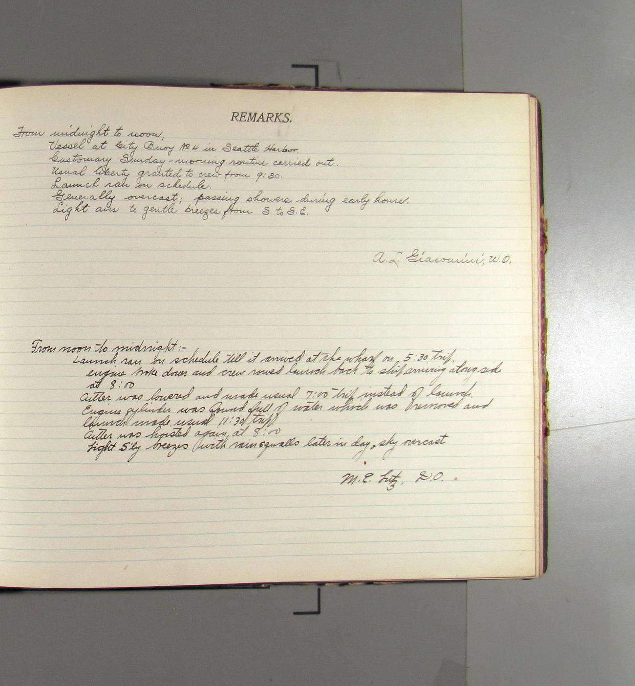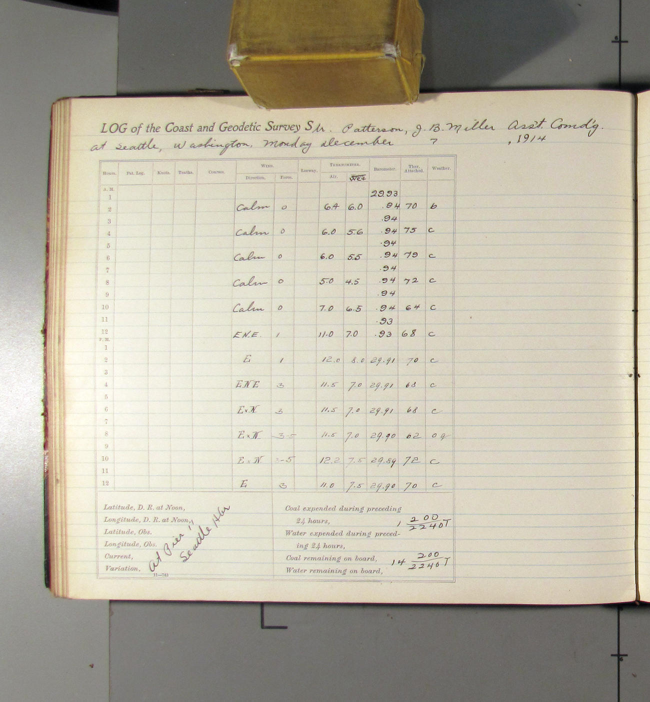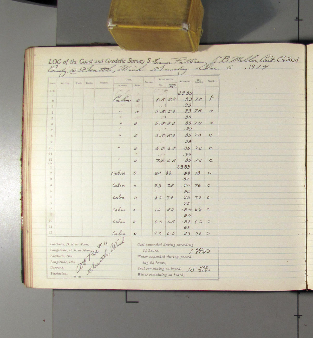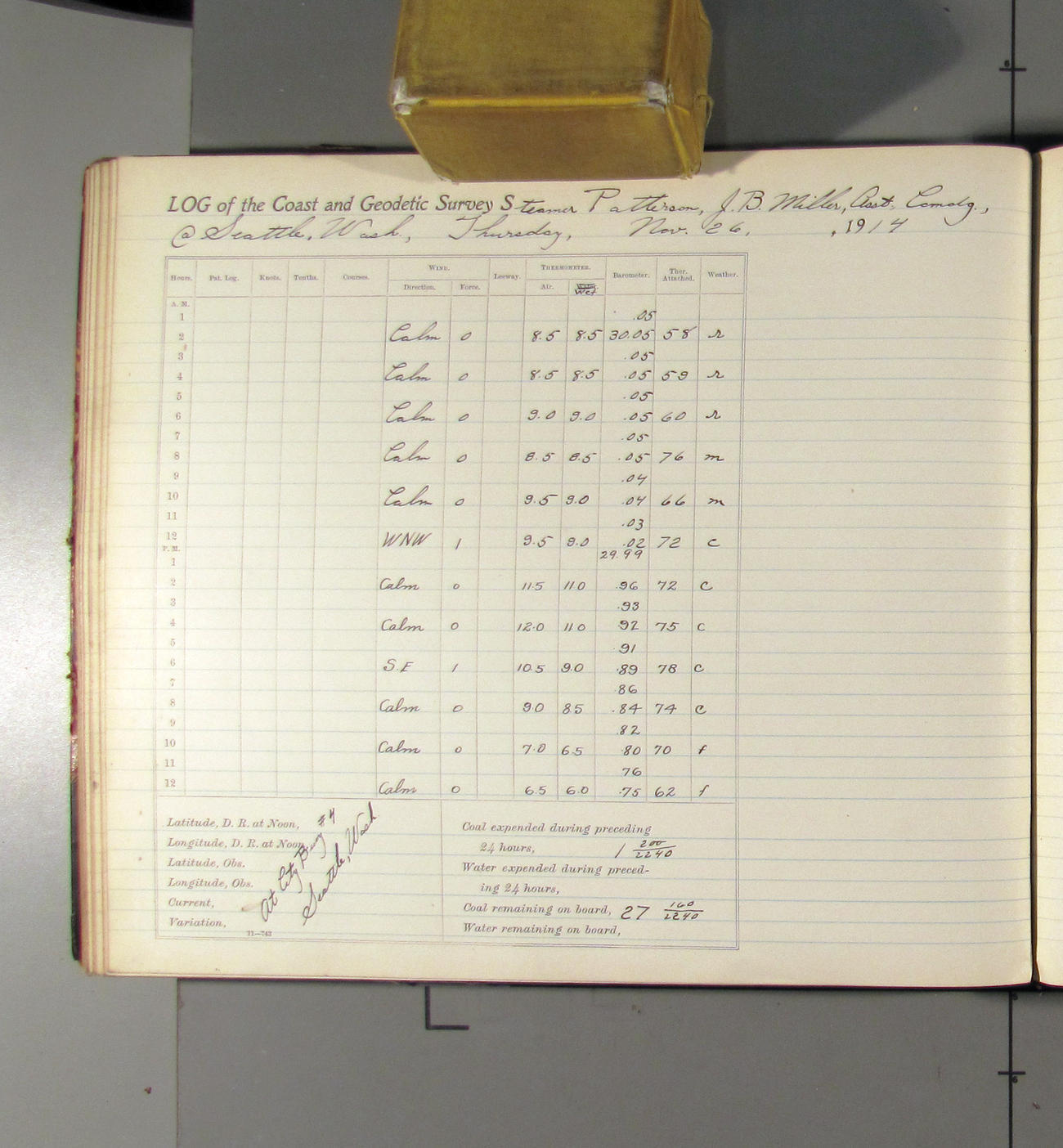 Noon to midnight. Office work in progress. Crew variously employed. Mr. Raynor left ship at 4:15 taking charge of the shipping of three boxes of log books for past quarters. Boxes were addressed to the Superintendent, USC&G Survey Washington DC and shipped via the Great Northern RR. Clear to cloudy. Light N'ly airs. A representative of the Seattle Drydock and Construction Co come on board @ 3:00 to look over the ship and bid on repairs