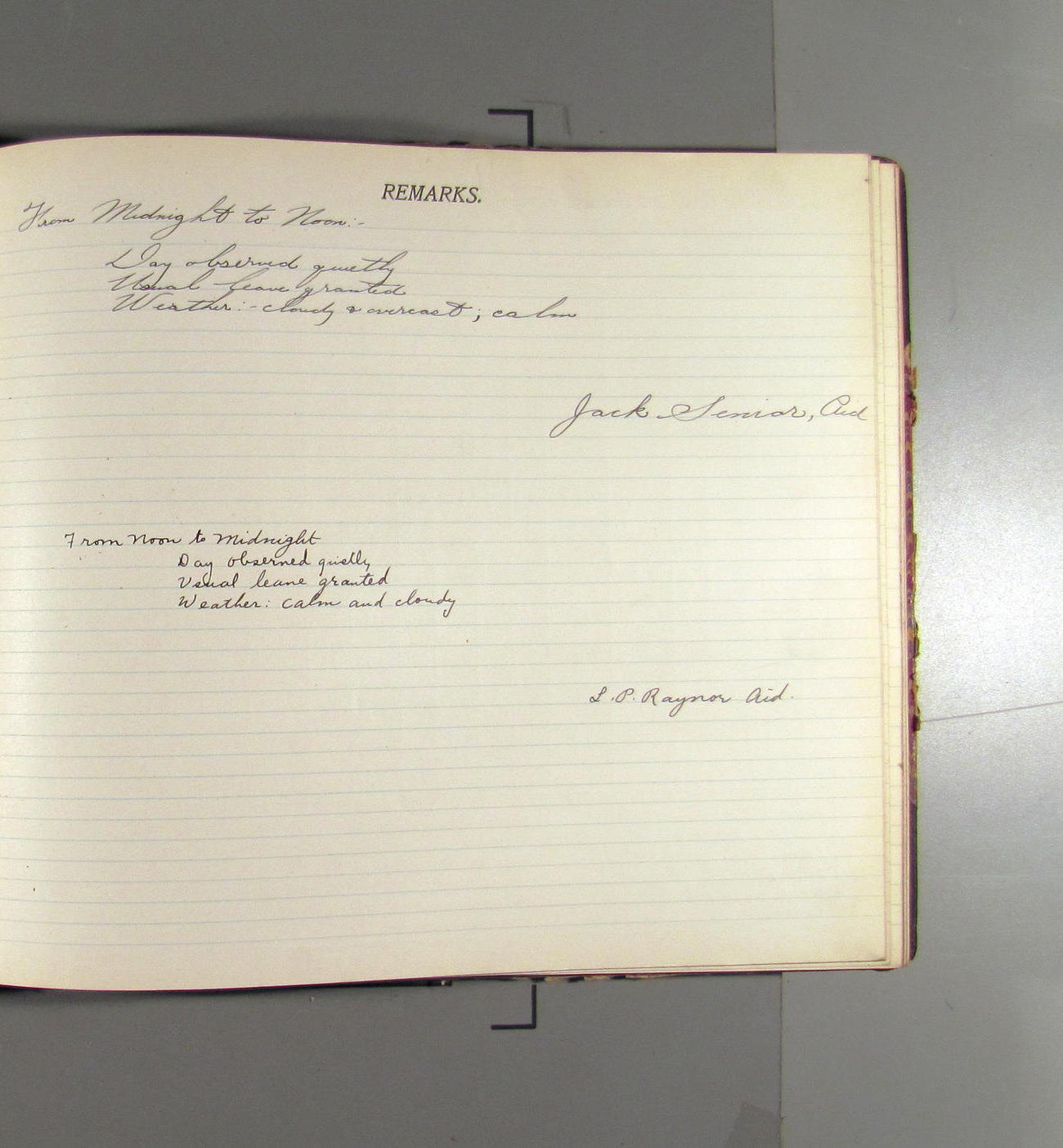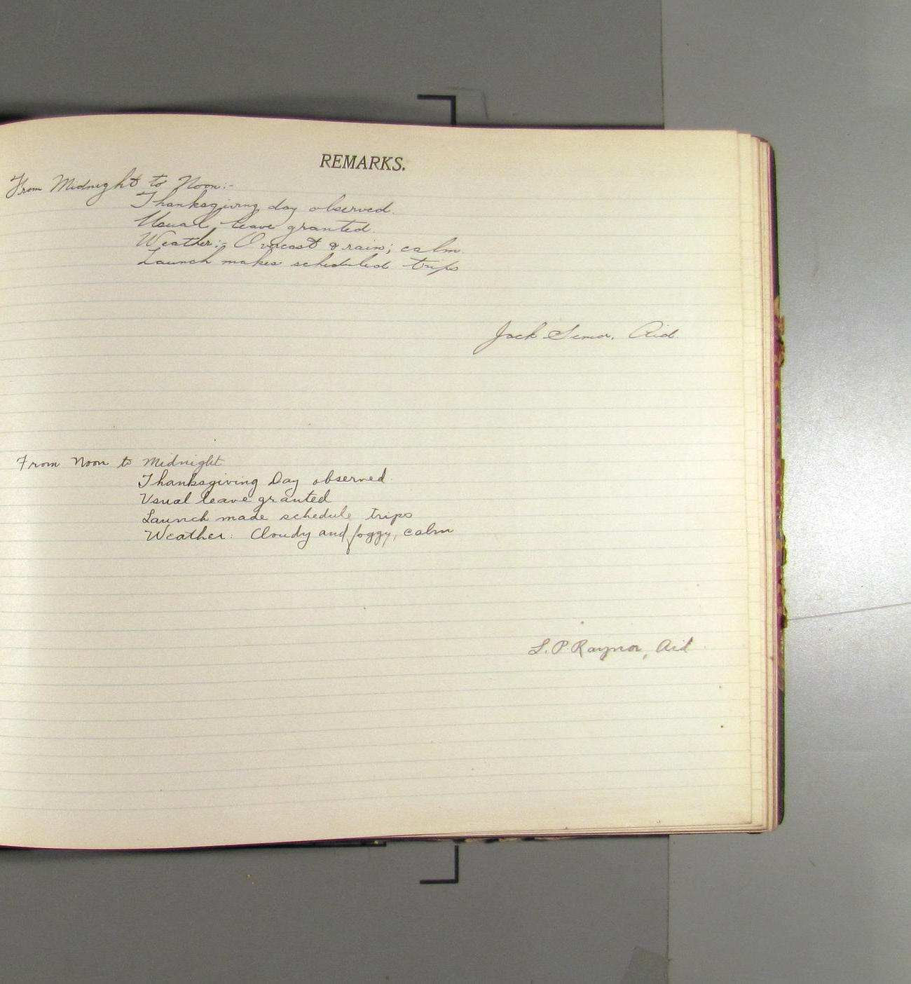 From noon to midnight. Office work in progress. Crew employed on general work. Mr. Raynor left ship at 1:00 on official business and returned at 2:20. Sky overcast Light SE'ly airs to calm