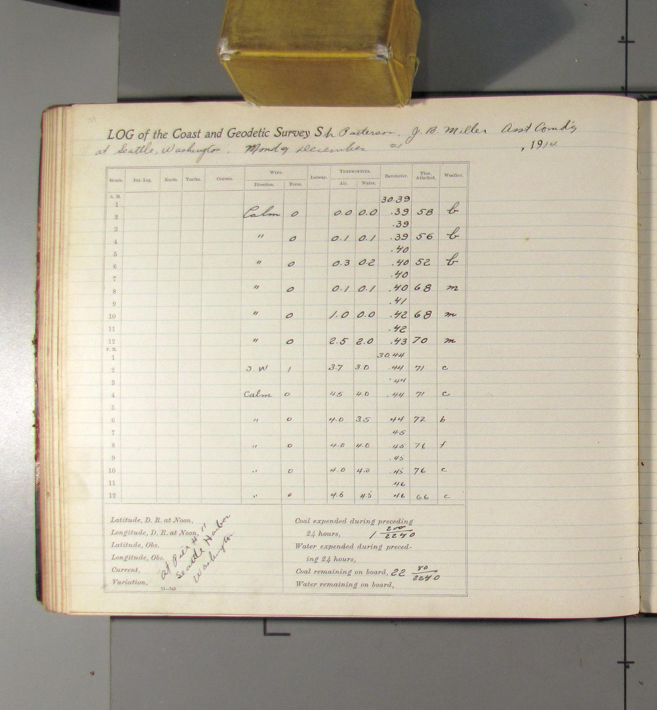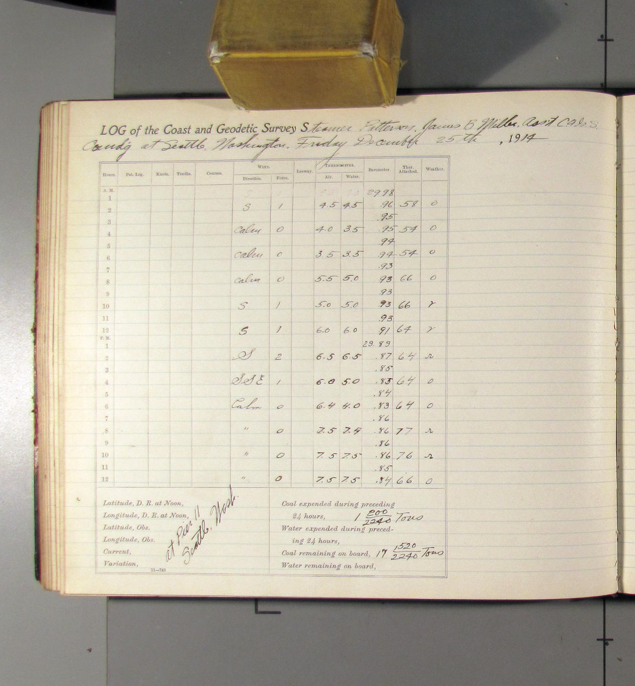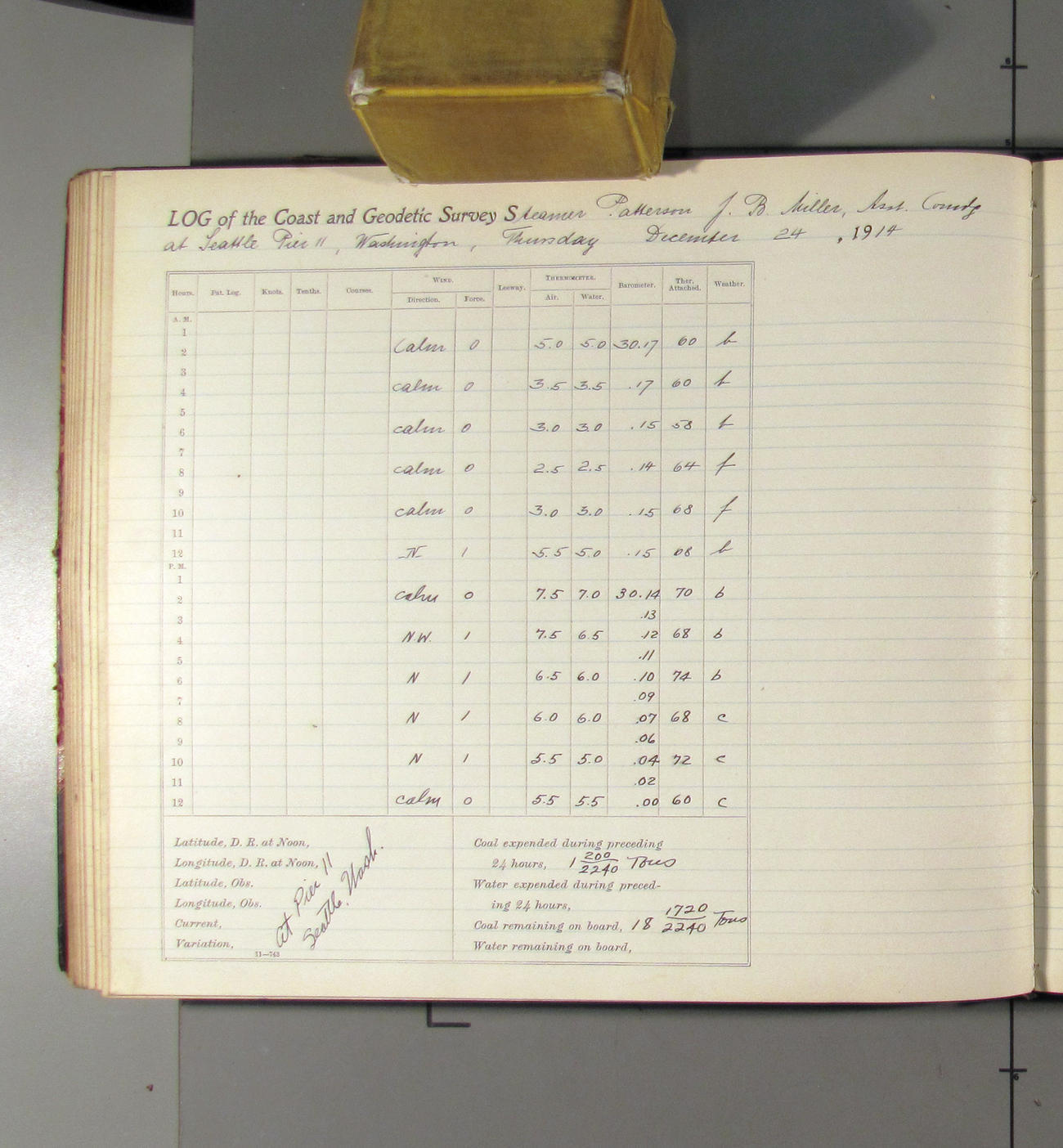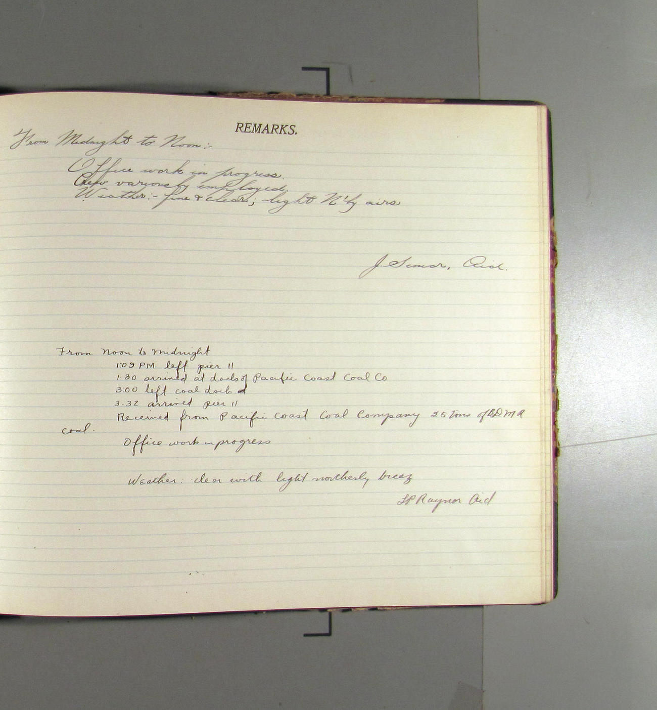 From noon to midnight. 1:09 pm left pier 11; 1:30 arrived at docks of Pacific Coal Co. 3:00 left coal dock. 3:32 arried Pier 11. Received from Pacific Coast Coal Company 25 tons of BDMR coal. office work in progress. Weather: clear with light northerly breez