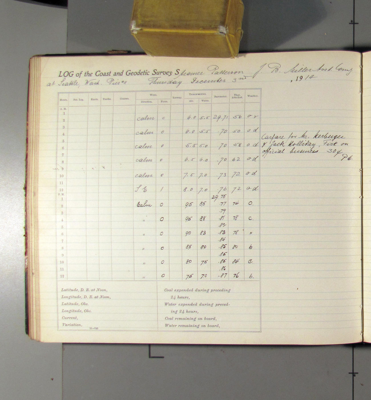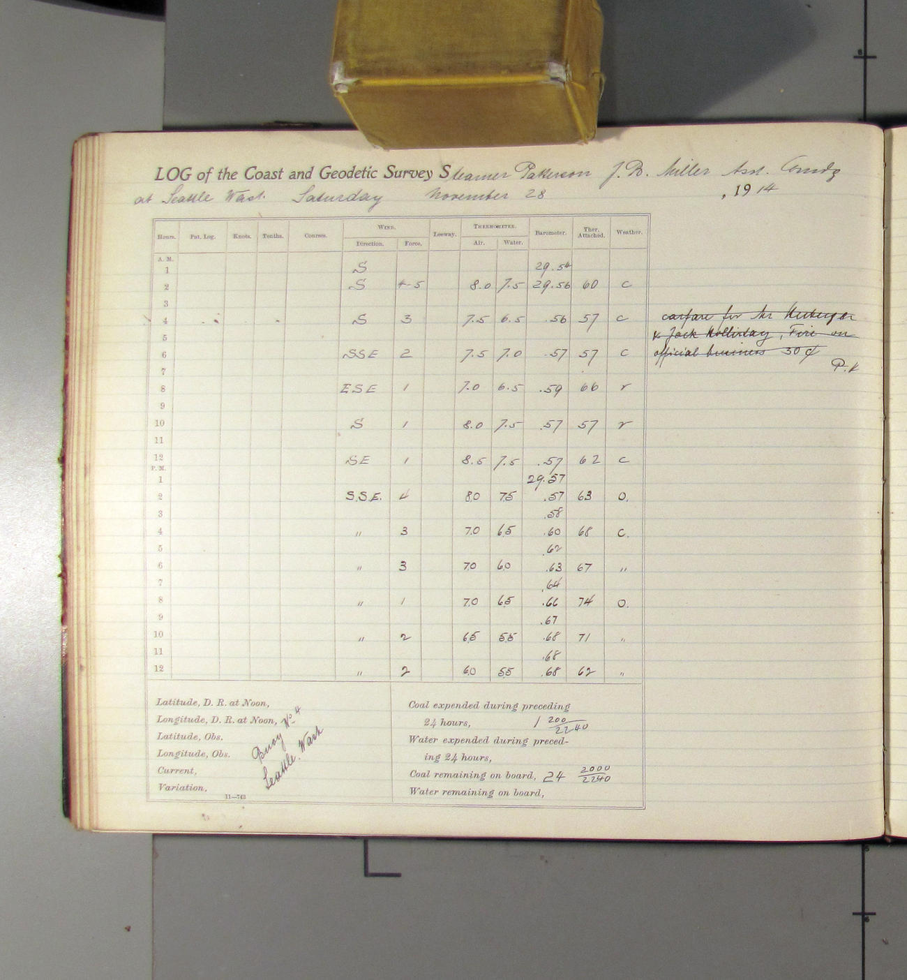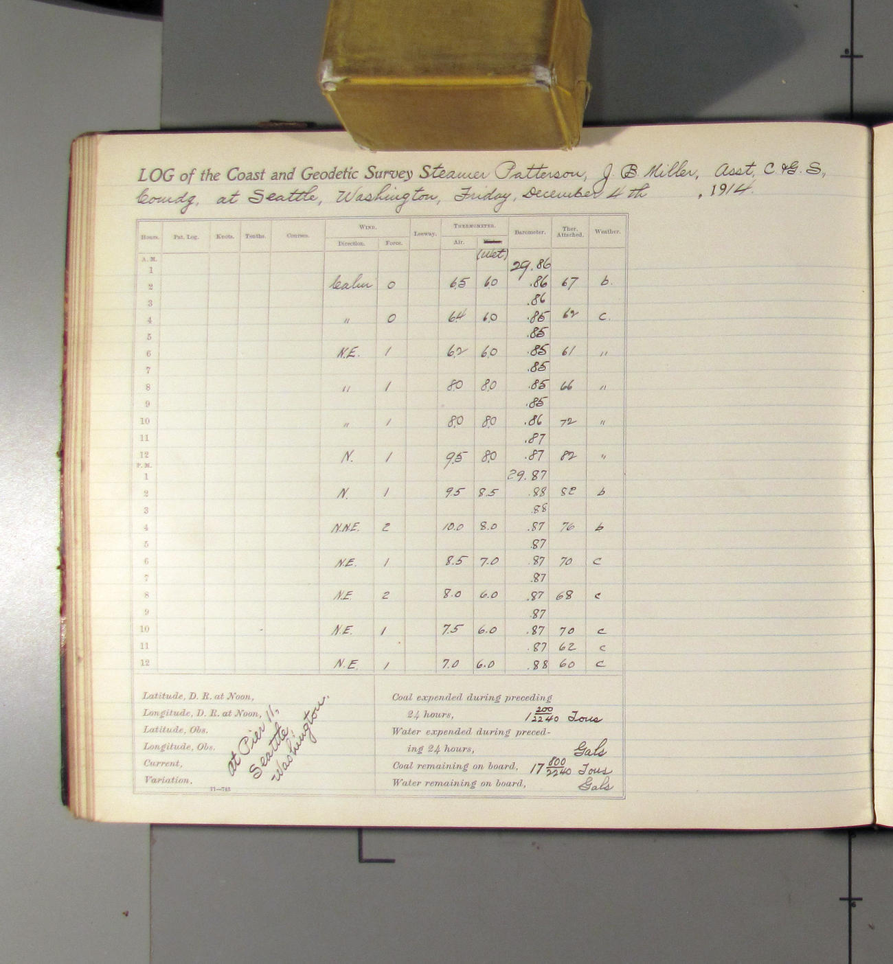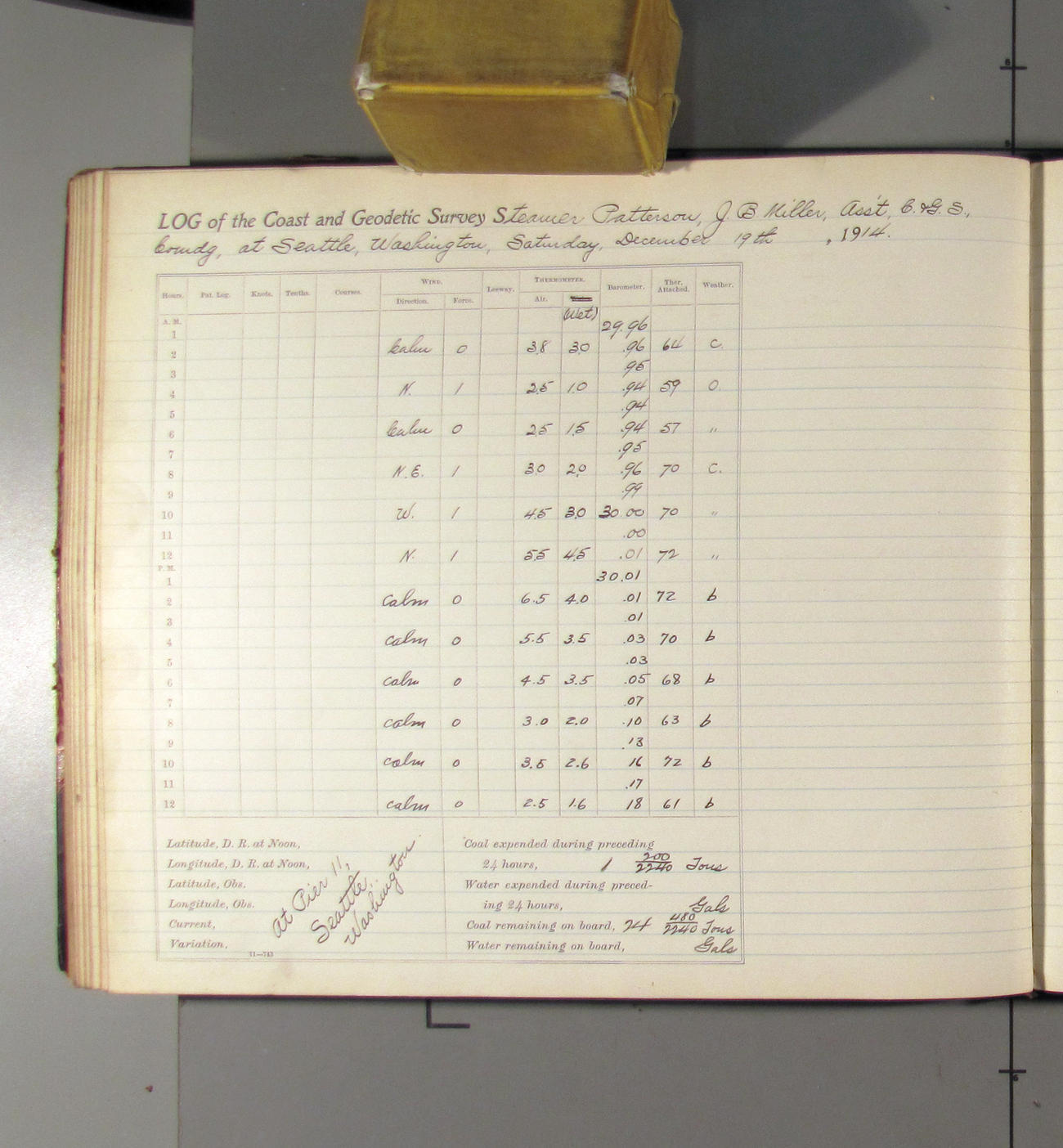 From noon to midnight. 1:09 pm left pier 11; 1:30 arrived at docks of Pacific Coal Co. 3:00 left coal dock. 3:32 arried Pier 11. Received from Pacific Coast Coal Company 25 tons of BDMR coal. office work in progress. Weather: clear with light northerly breez