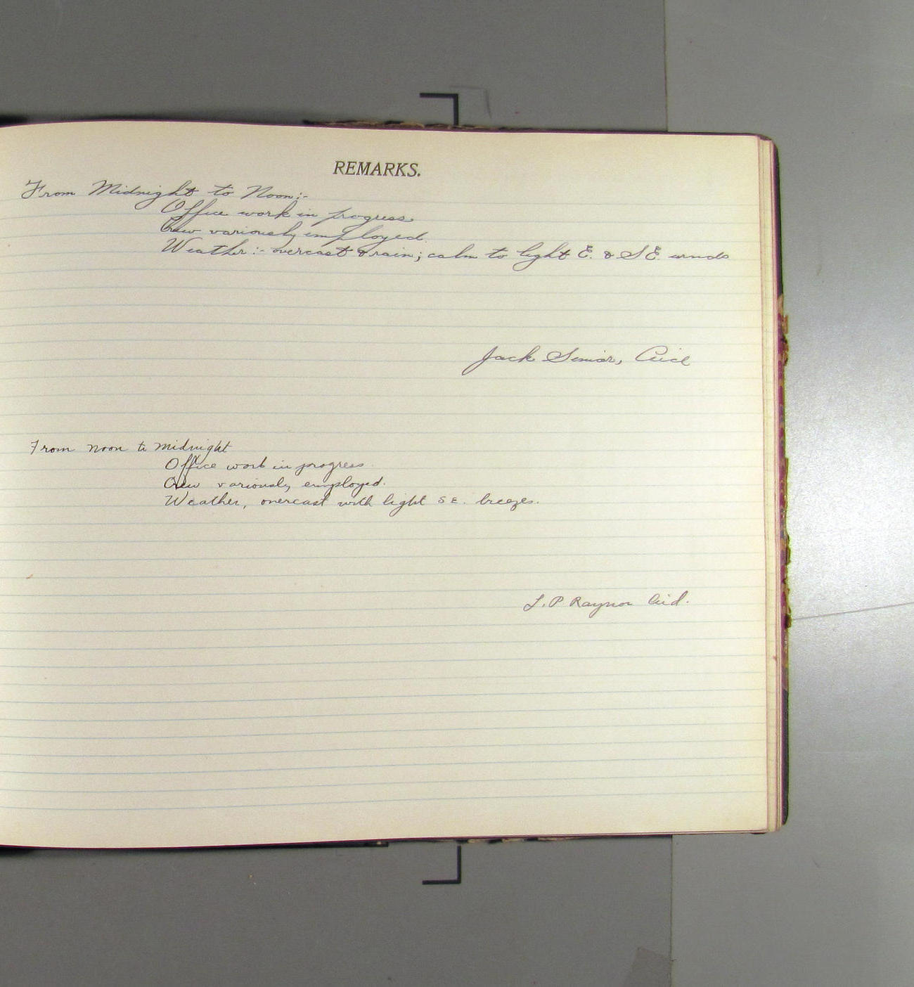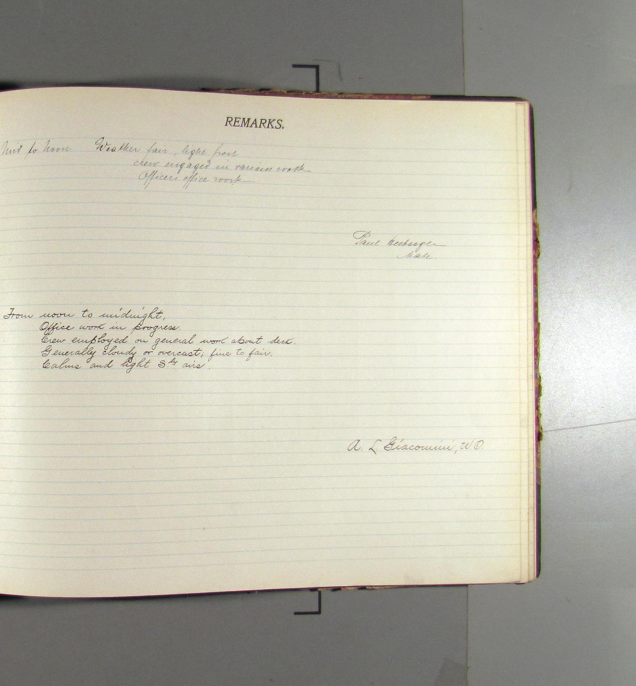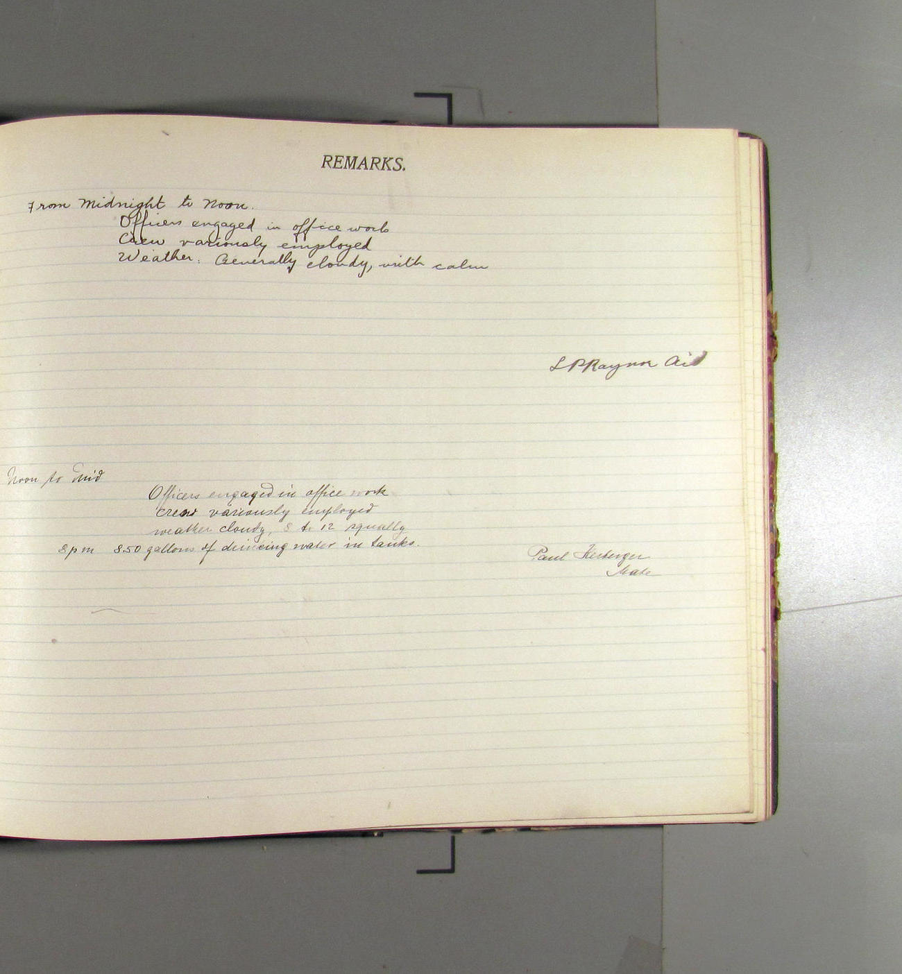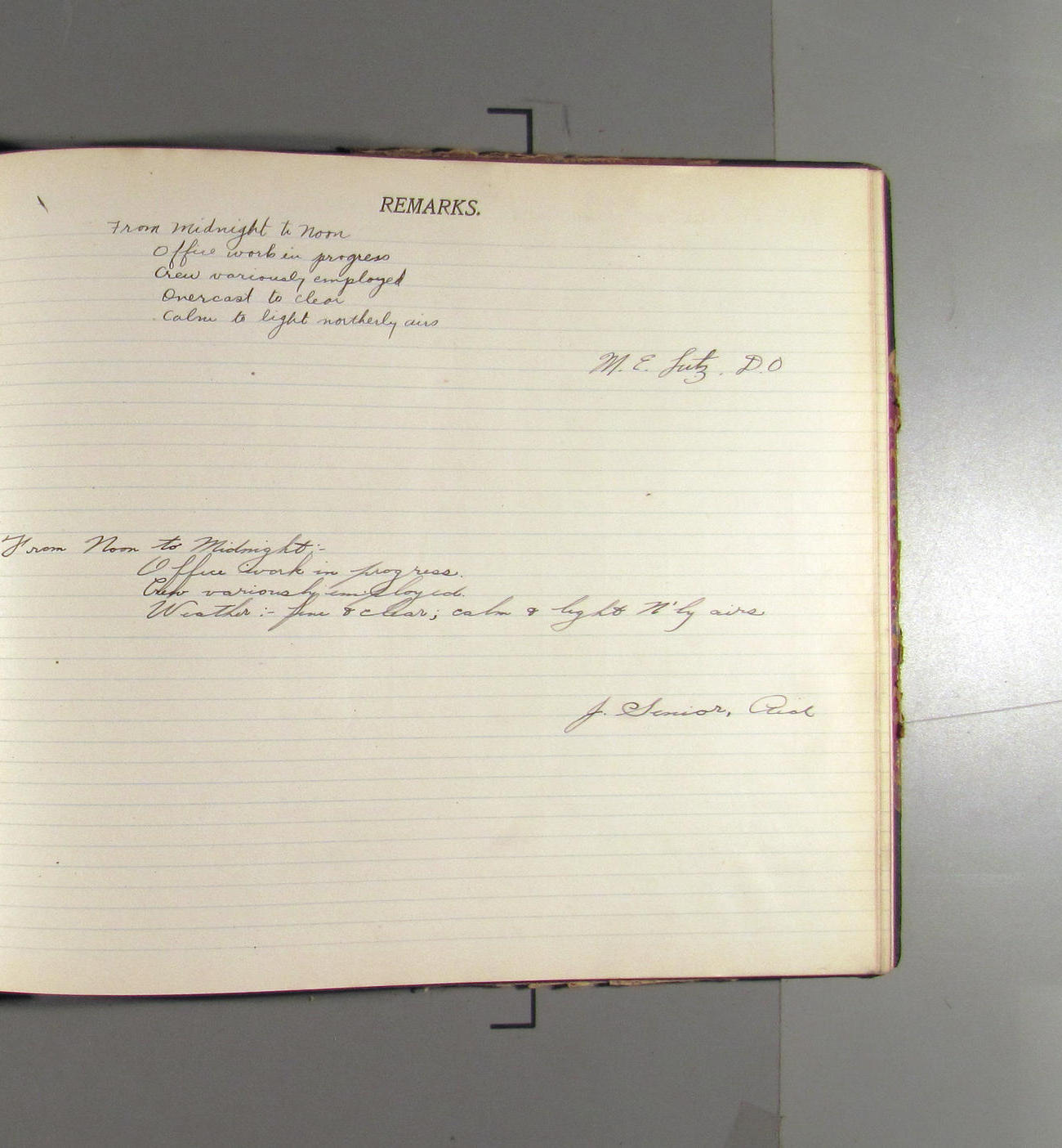 From midnight to noon. Office work in progresss. Crew variously employed. Weather: clear wtih light northerly aris