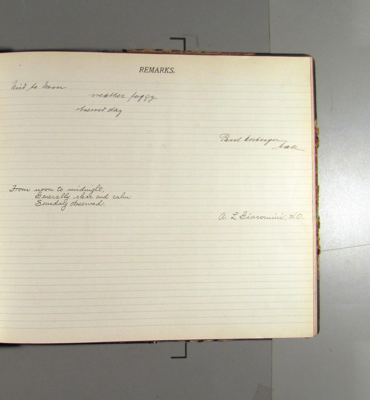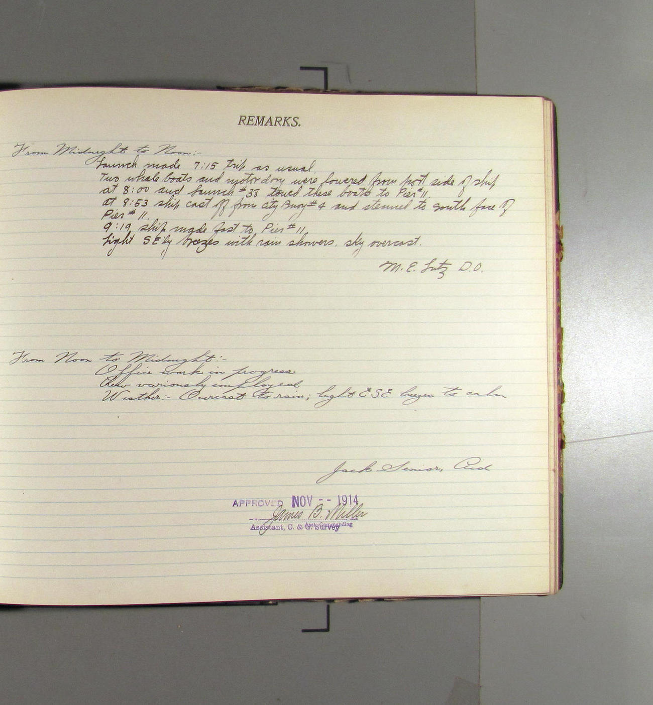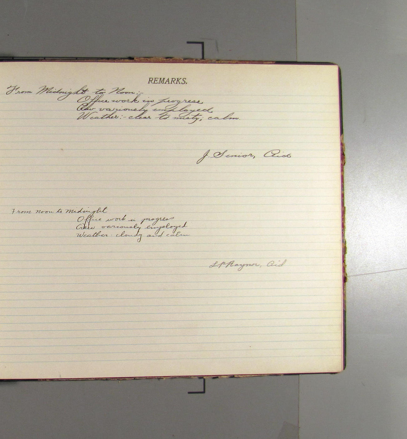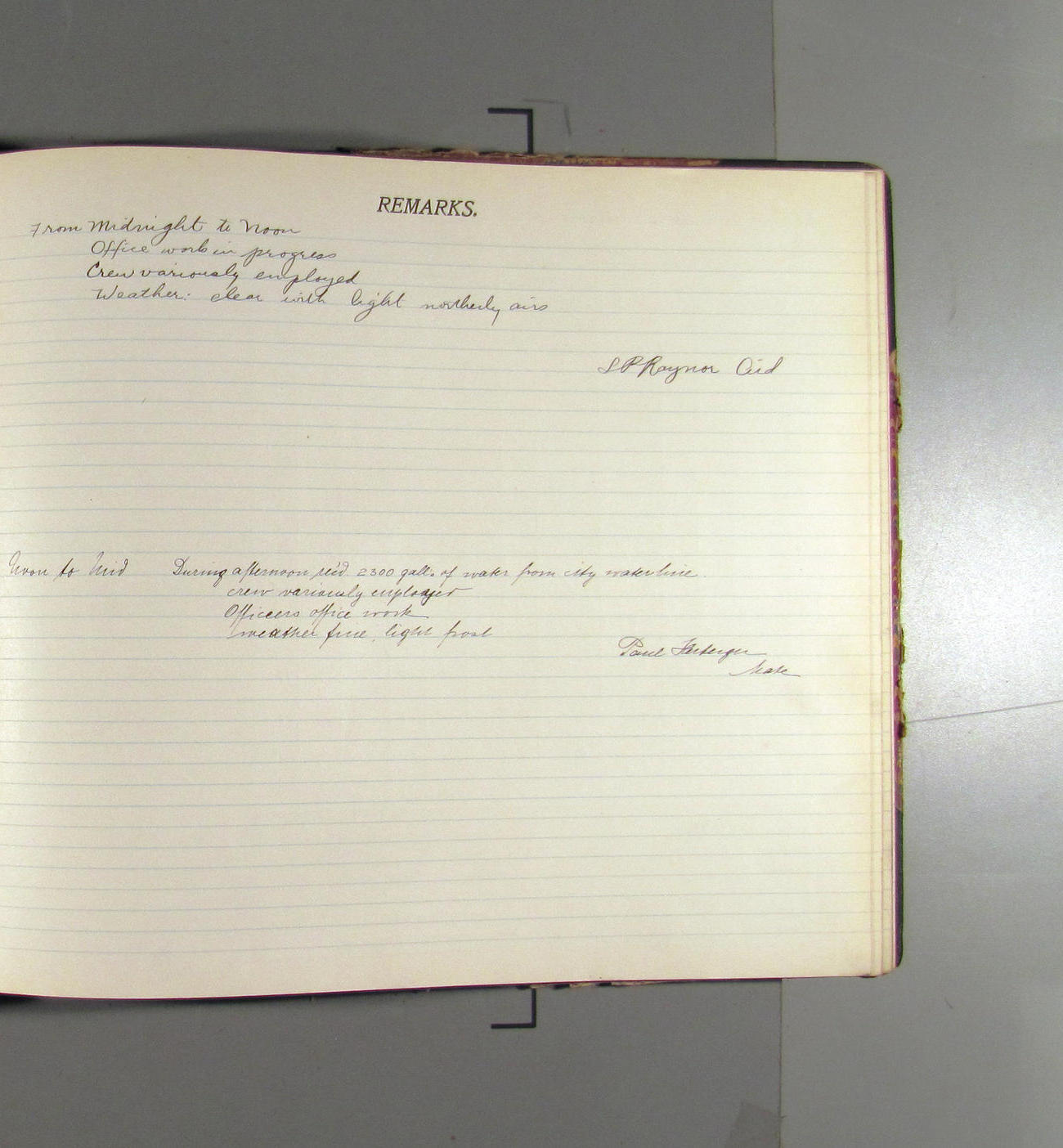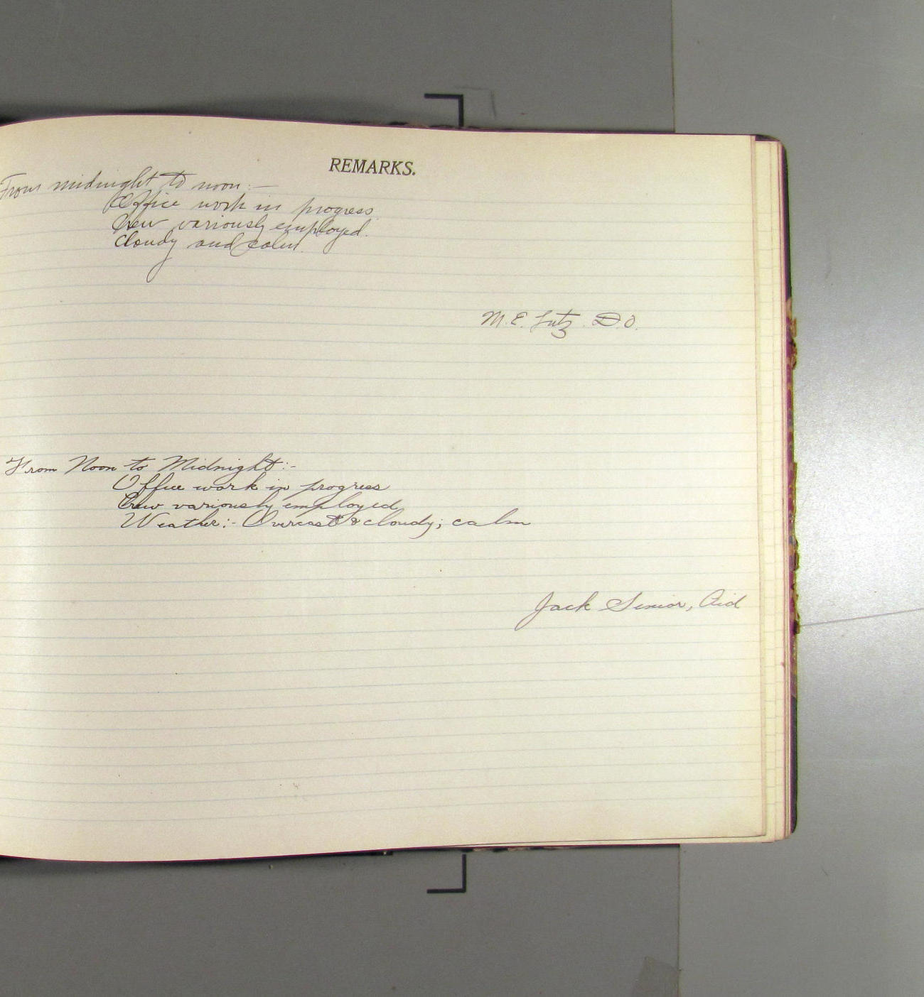 From midnight to noon. Office work in progresss. Crew variously employed. Weather: clear wtih light northerly aris