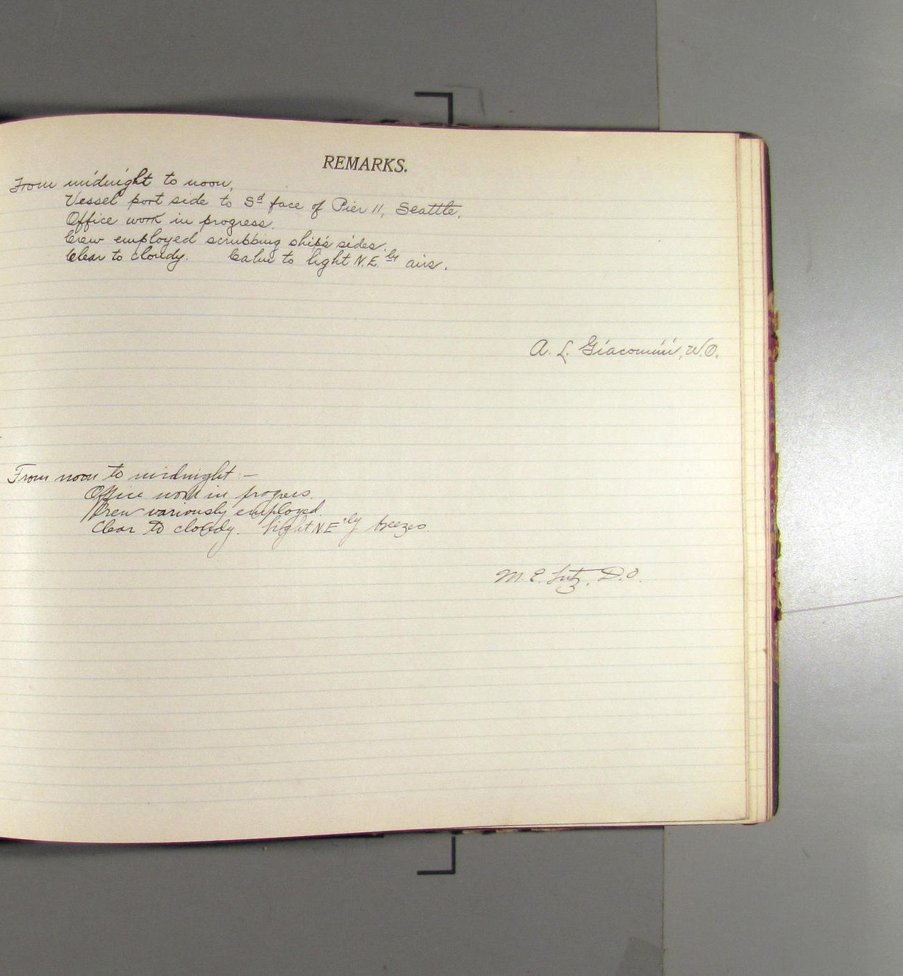 From midnight to noon. Vessel port side to S'd face of Pier 11, Seattle. Office work in progress. Crew employed on general work. Clear to foggy to cloudy. Calms and light airs from the S'd quadrants