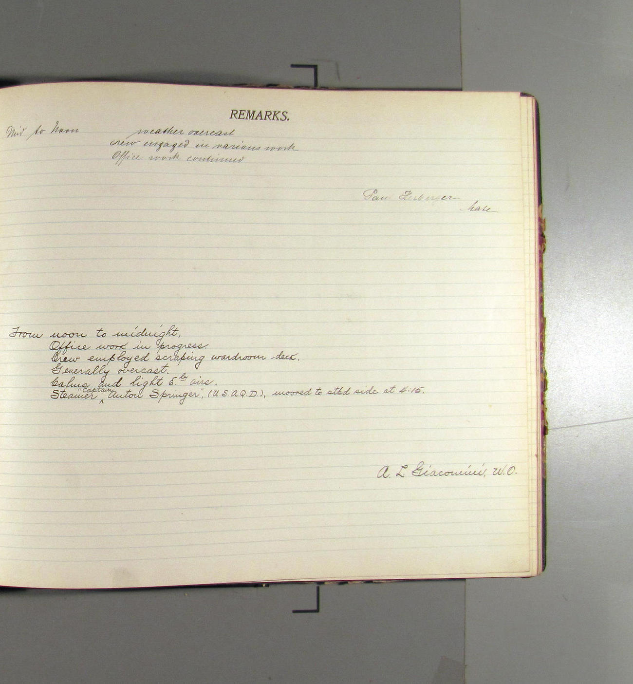 From midnight to noon. Office work in progress. Crew variously employed. 8:10 Paints and oils from Navy Yard taken aboard. Weather - overcast & calm
