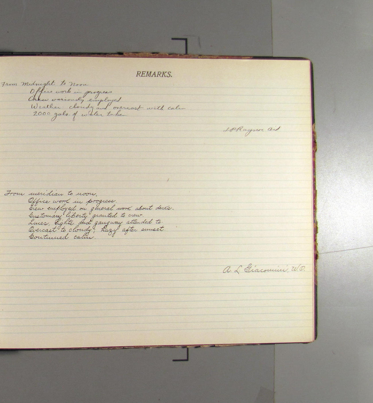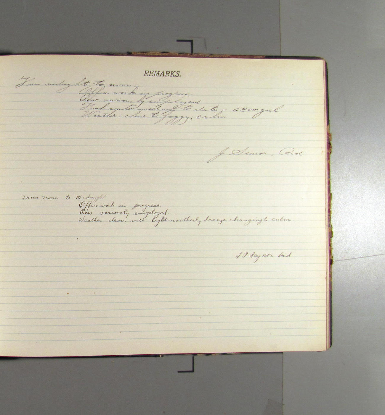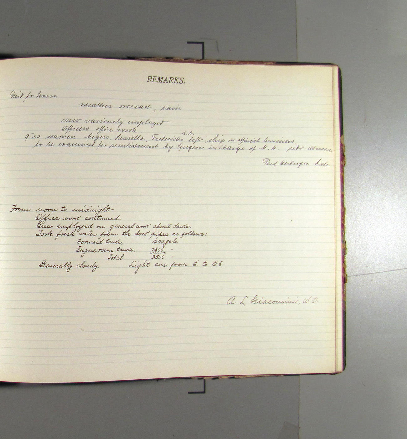 From midnight to noon. Office work in progress. Crew variously employed. Weather: cloudy and overcast with calm. 2000 gals of water taken