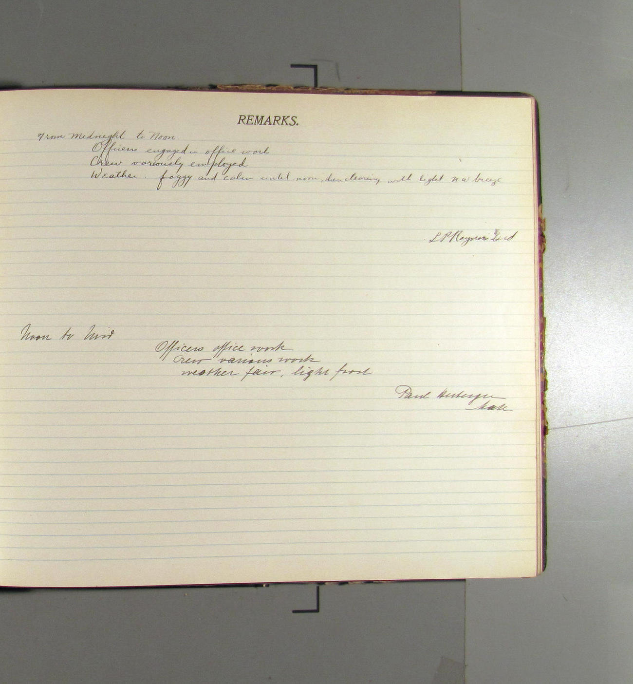 Mid to Noon. Weather fair, light rost. Crew engaged in various work. Officers office work